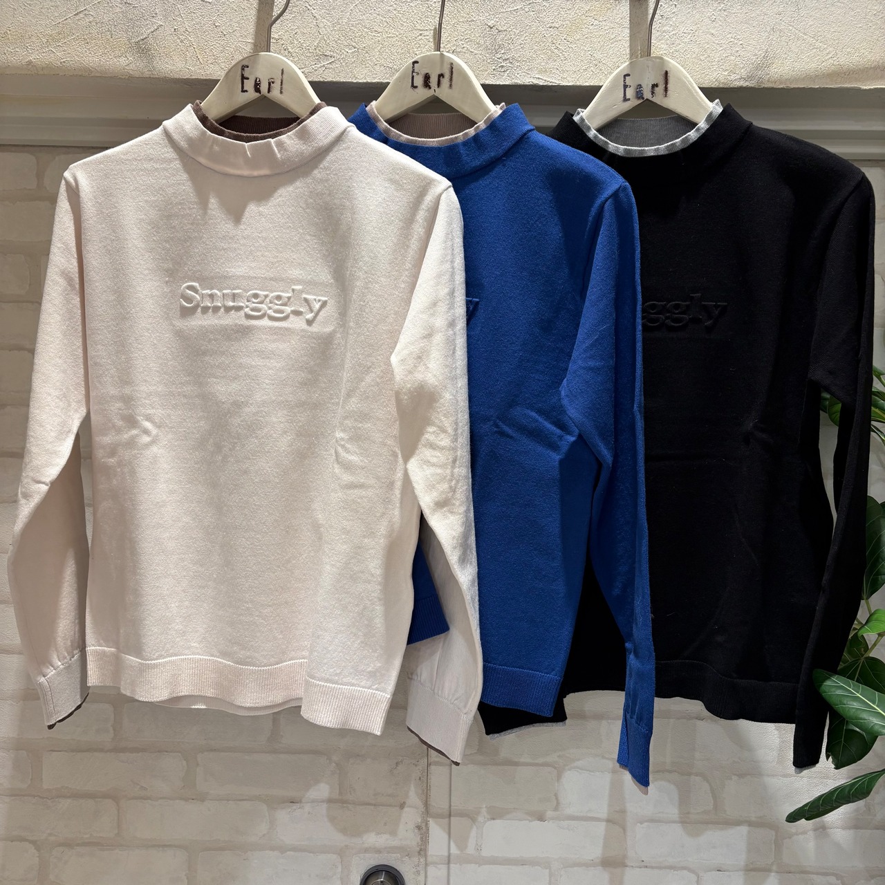 同色エンボスロゴがさりげなく映える、シンプルなニットトップス。配色デザインが程よいアクセントになり、顔まわりを明るく演出。