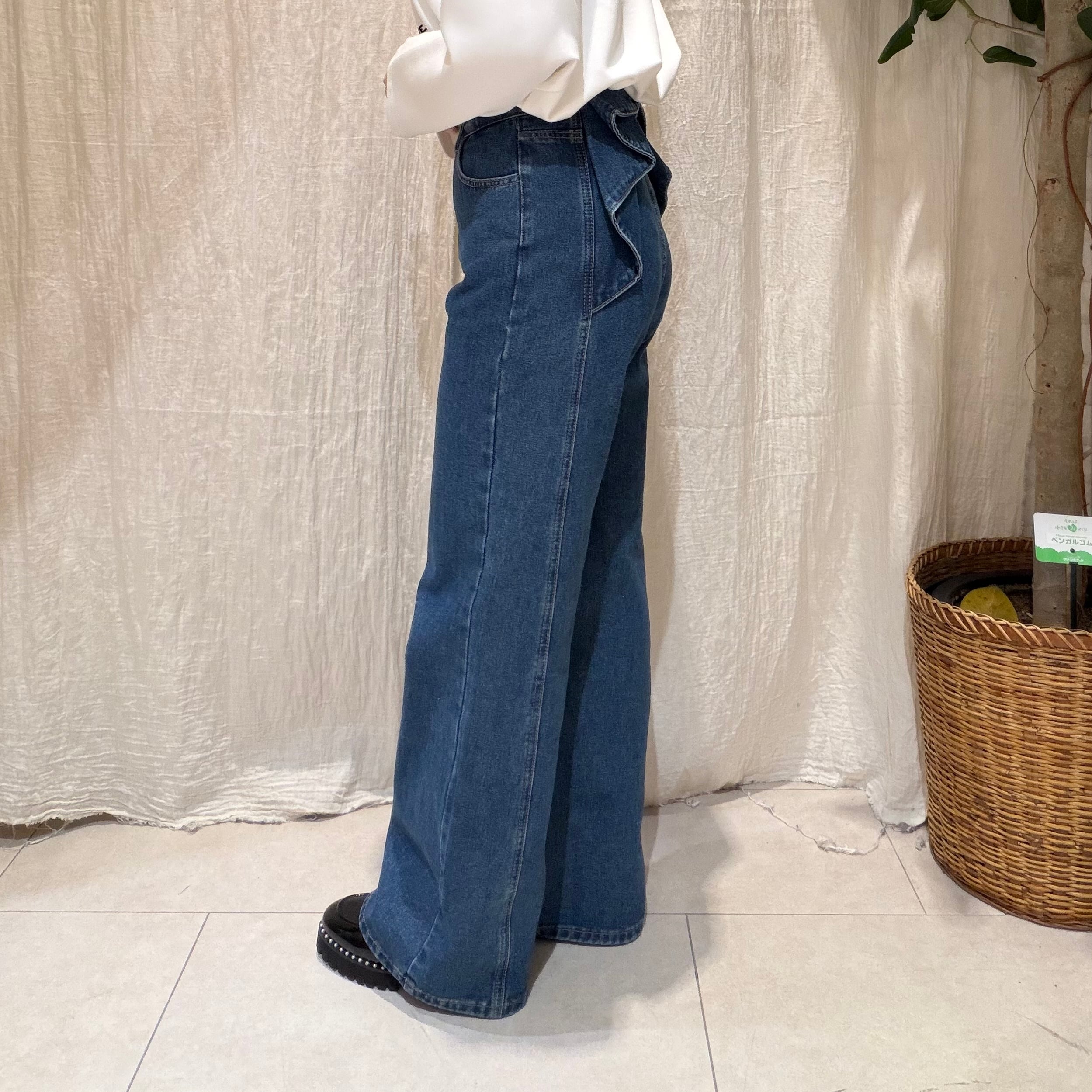後ろウエスト部分にリボンデテールが施されたストレートデニム