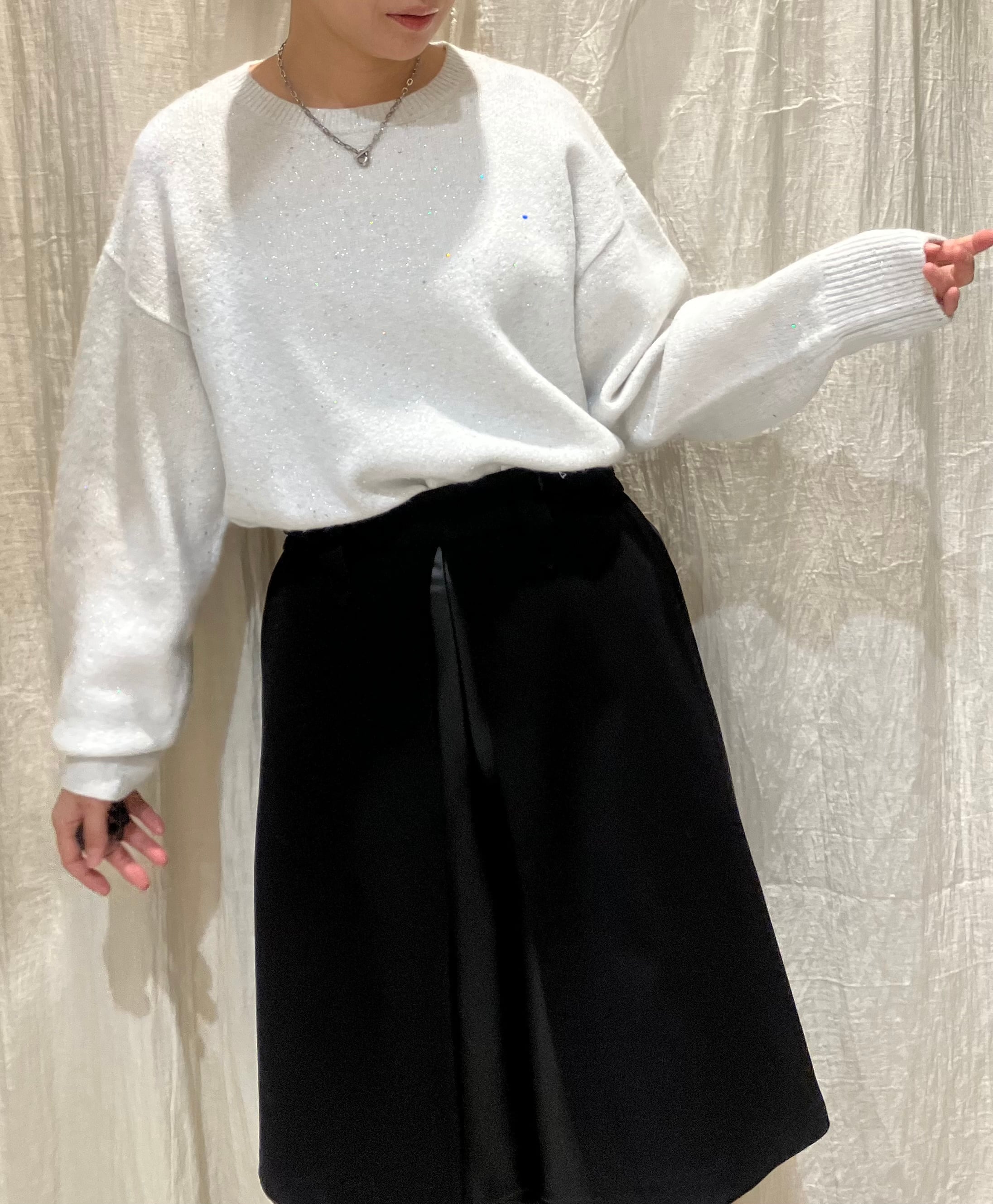 上品なスパンコールを散りばめた、華やかさと着やすさを両立したクルーネックニット。