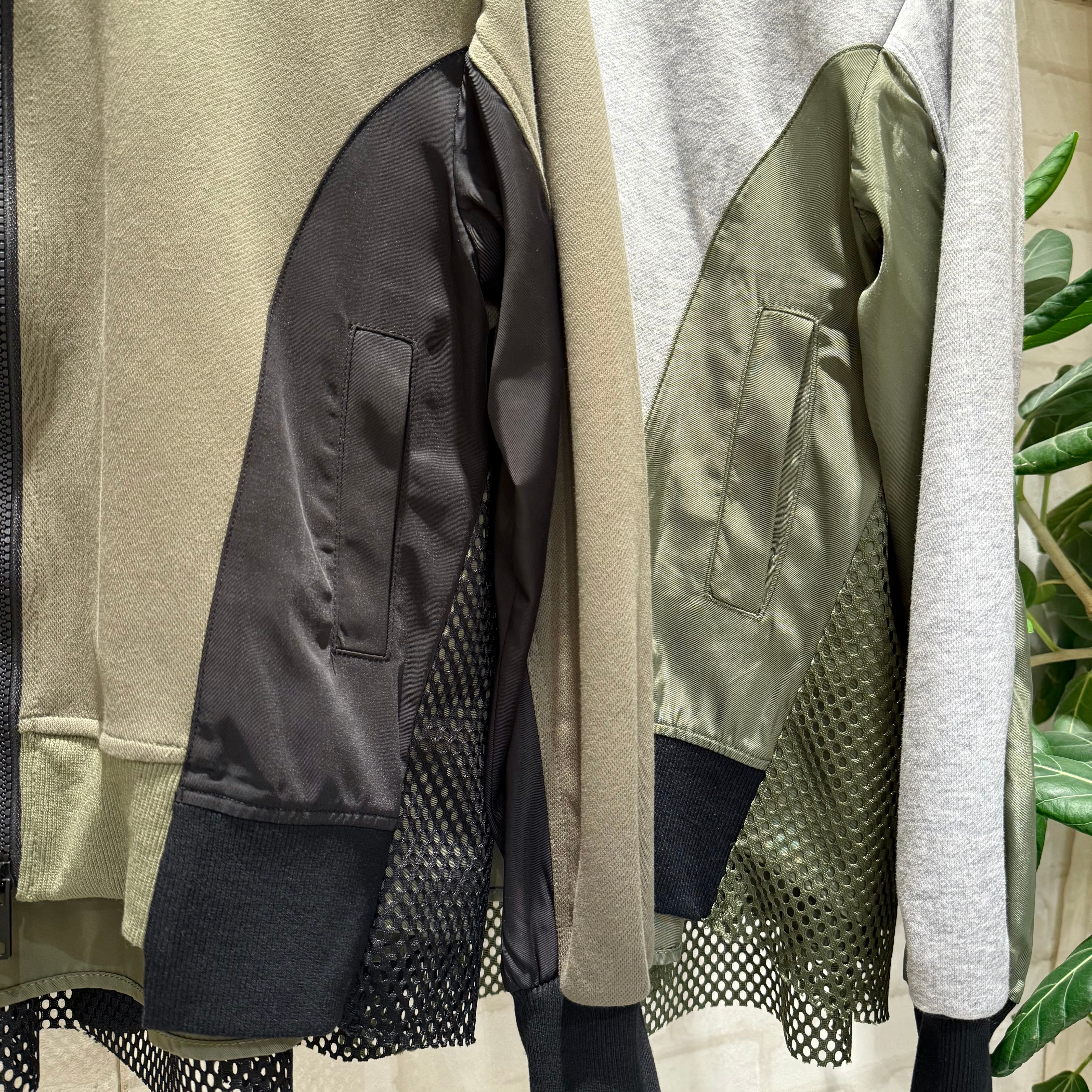 袖やサイドにはナイロン素材を使用し、スポーティーで立体感のある仕上がりに。