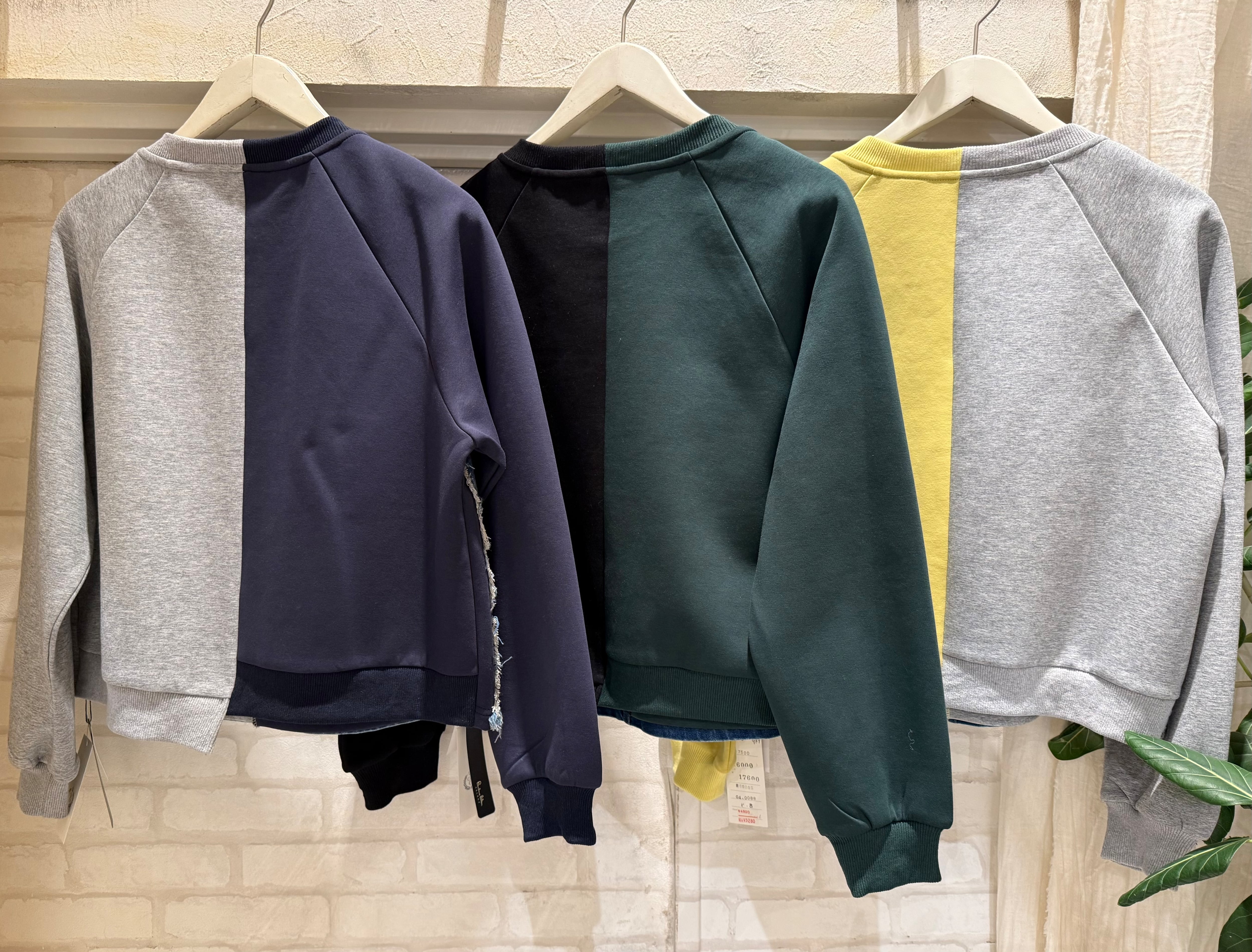配色デニムをドッキングした、存在感のあるプルオーバー。
