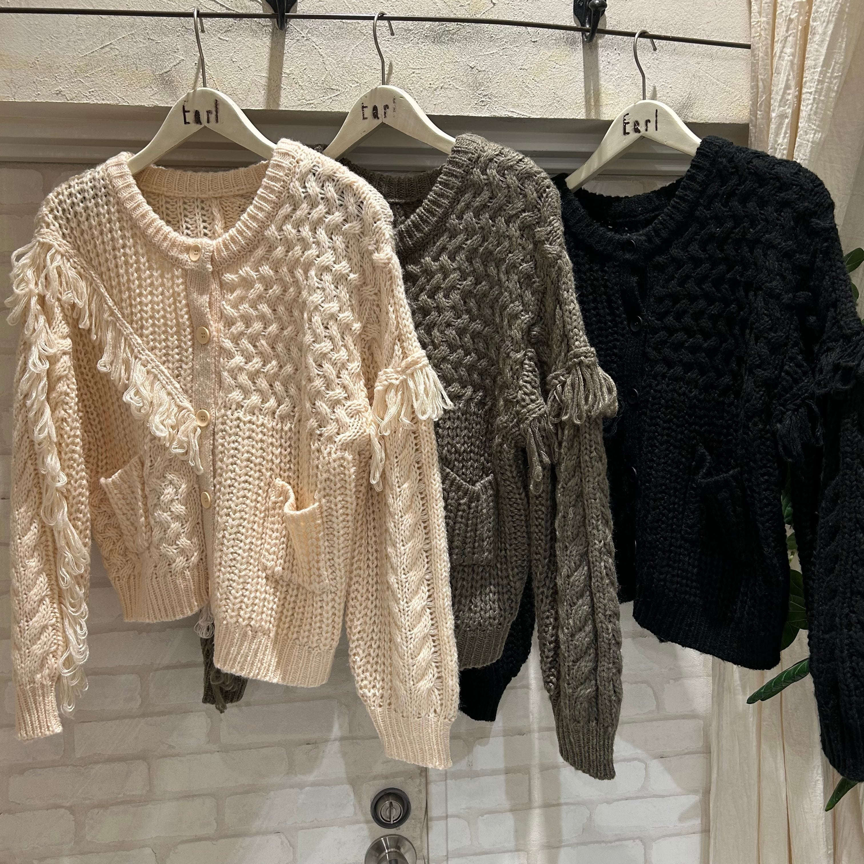 アシンメトリーにあしらったフリンジが目を惹くニットカーディガン。
