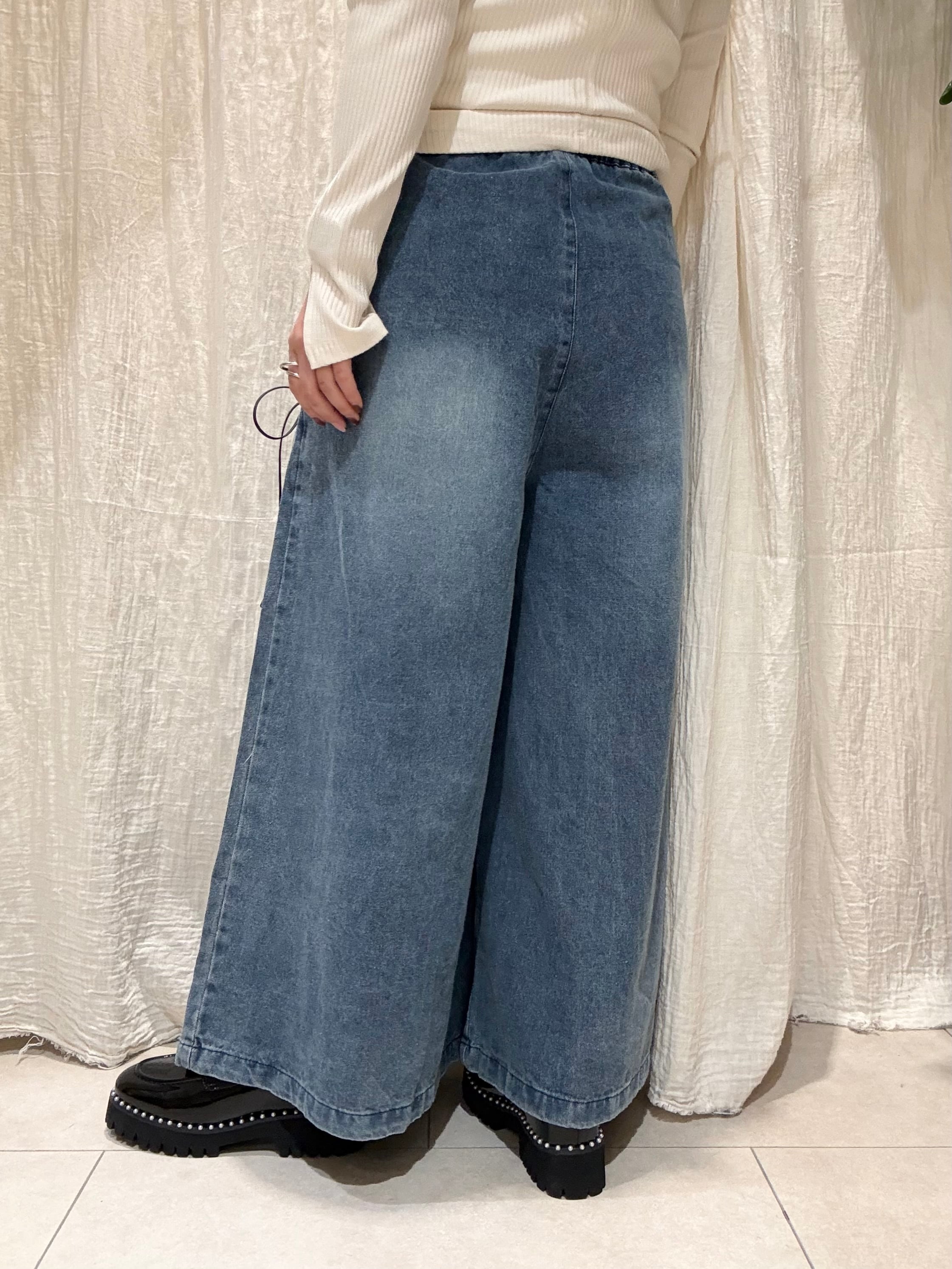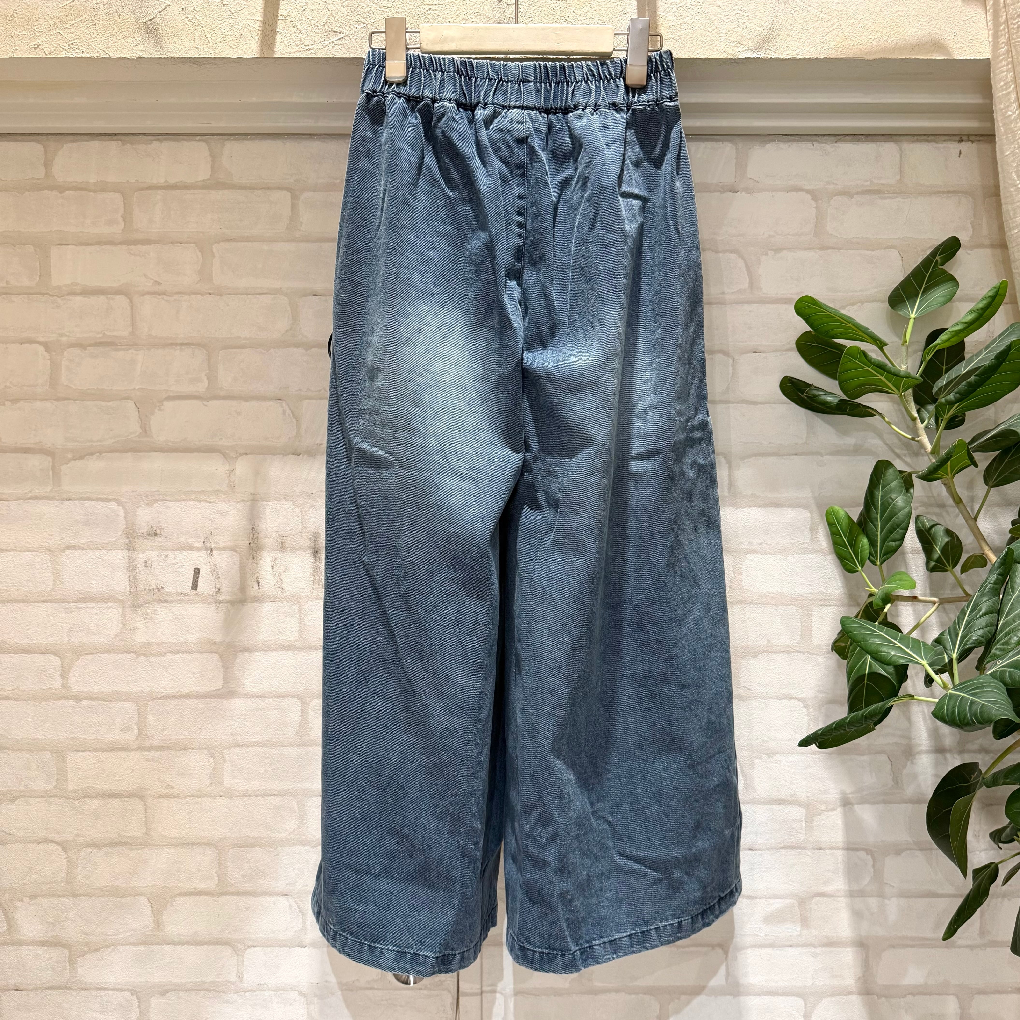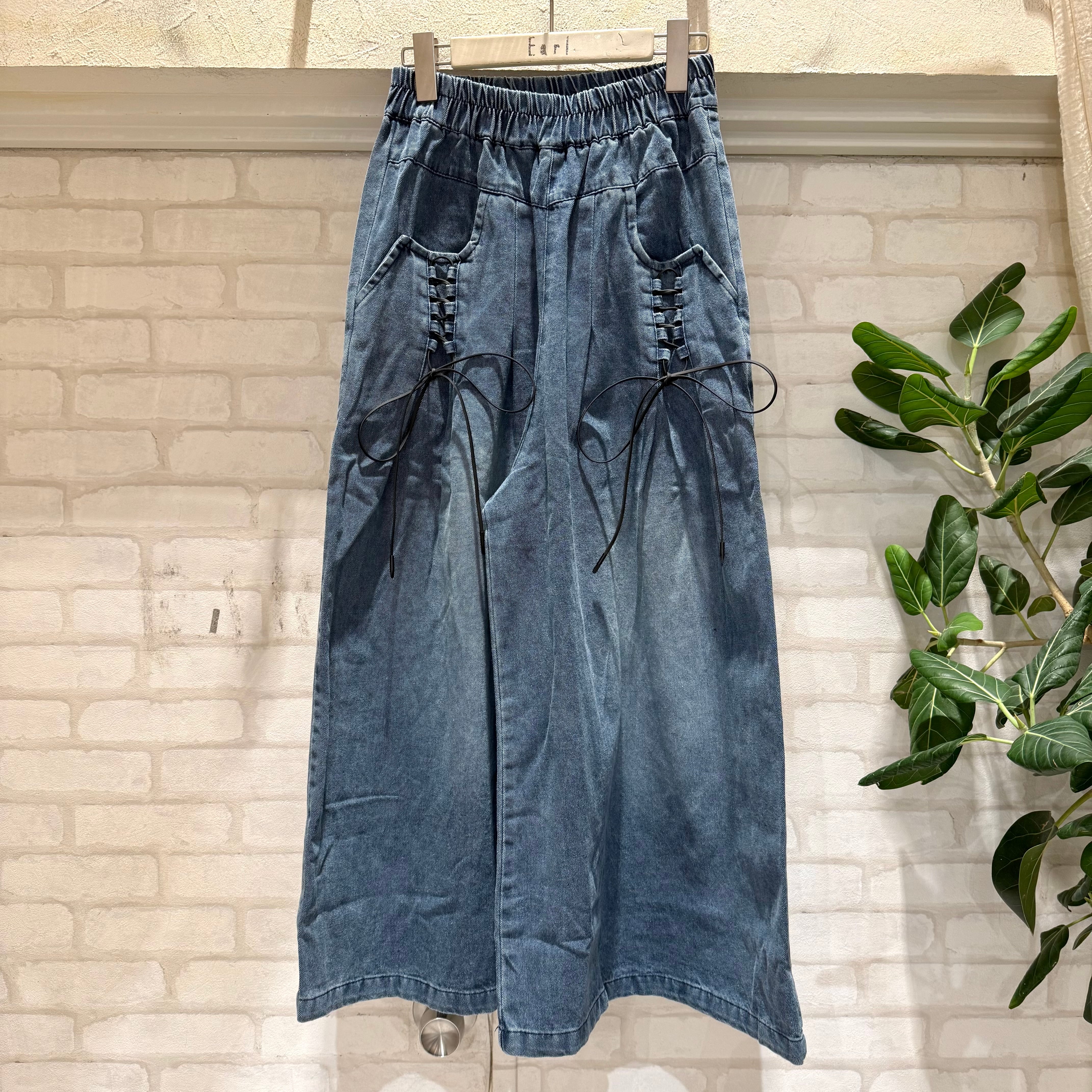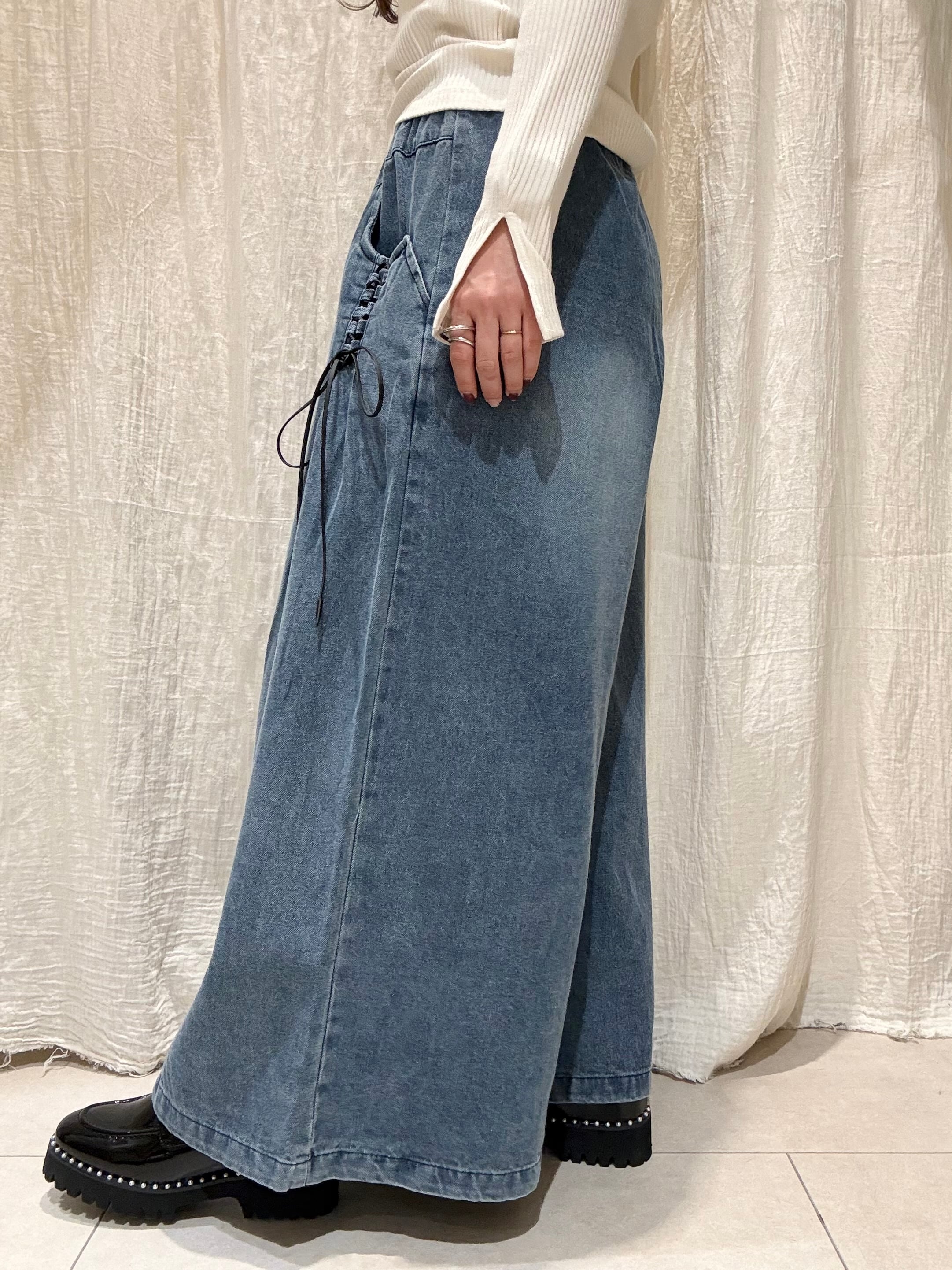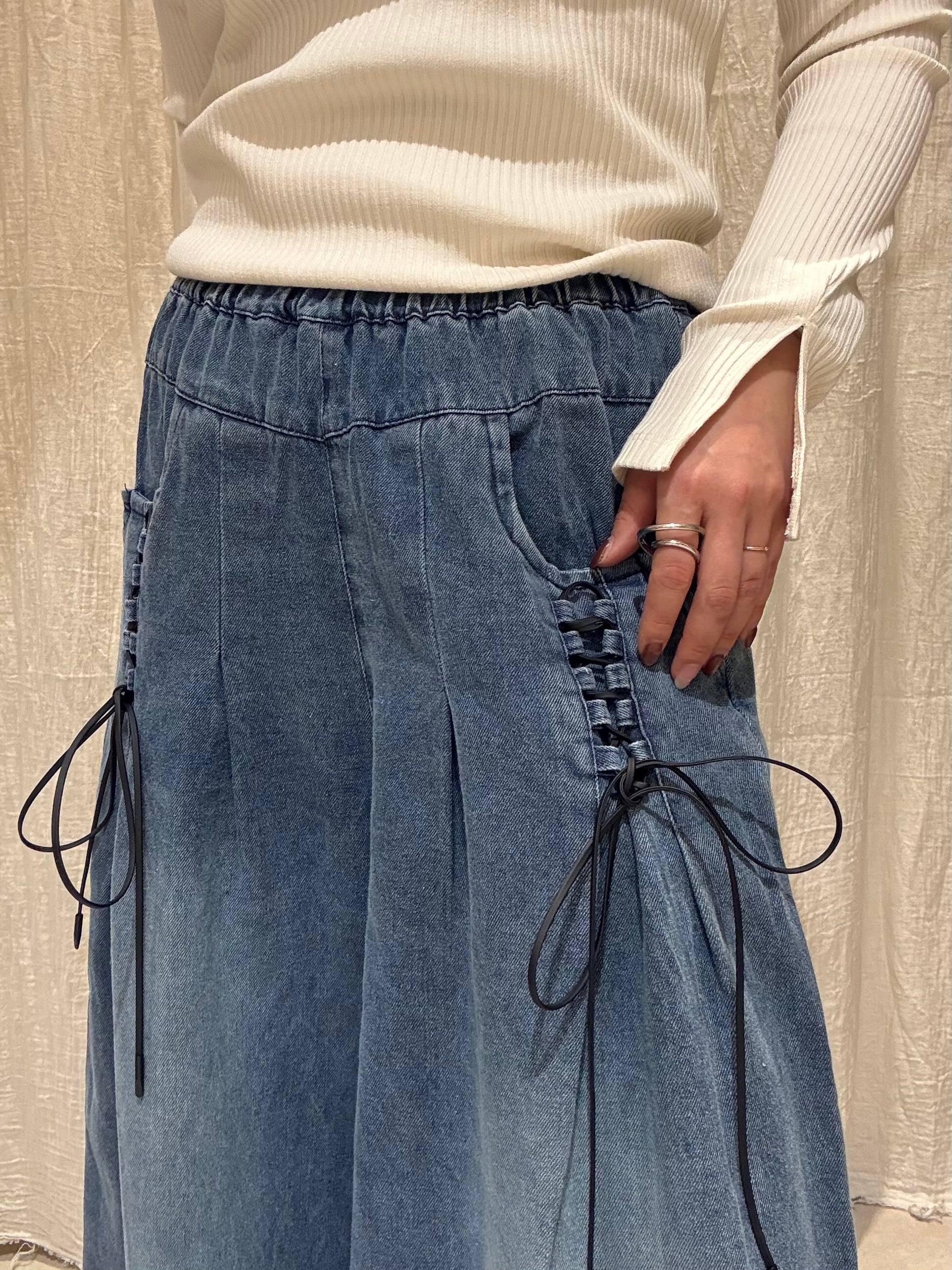 デニムに合皮スピンドルを施した、エッジの効いたワイドパンツです。