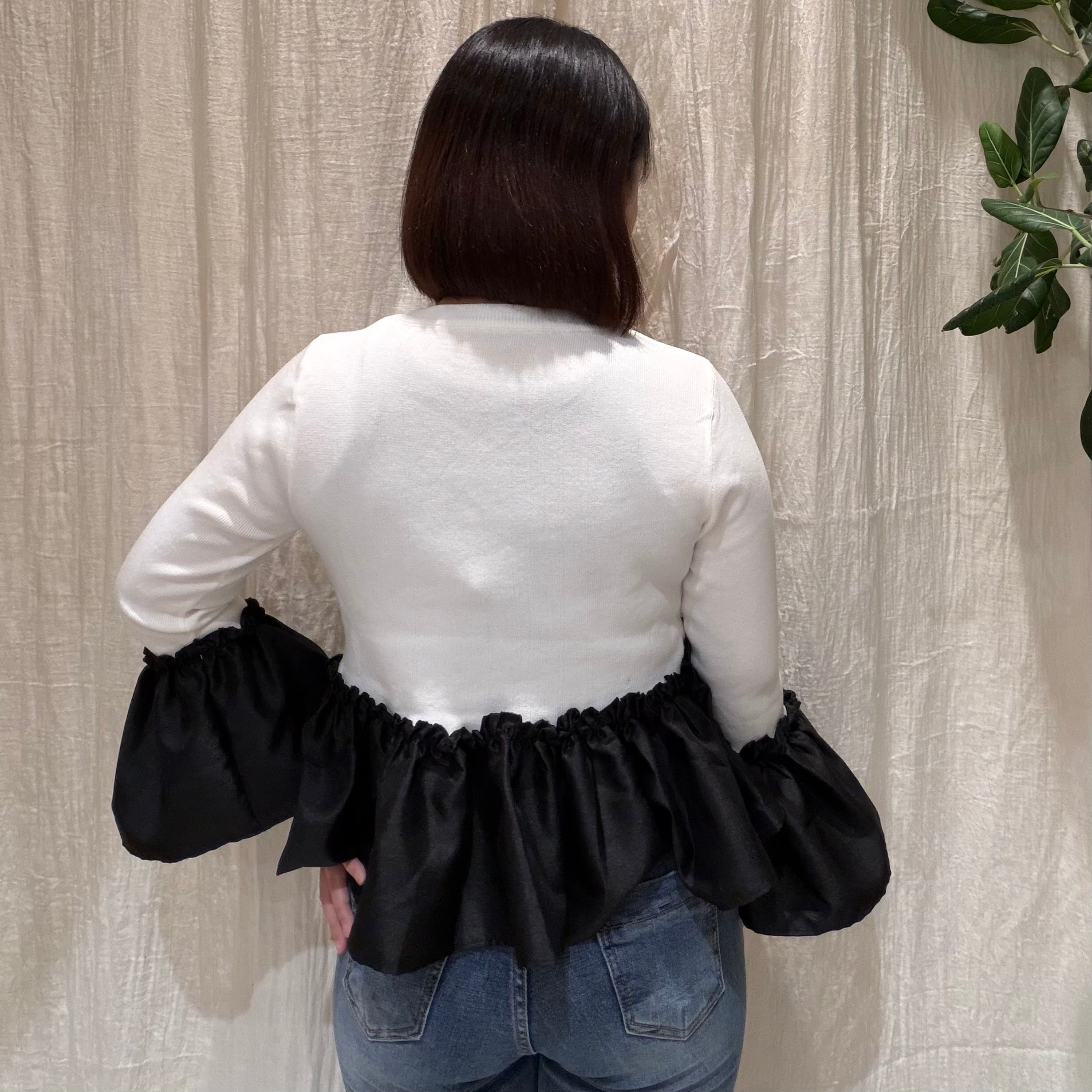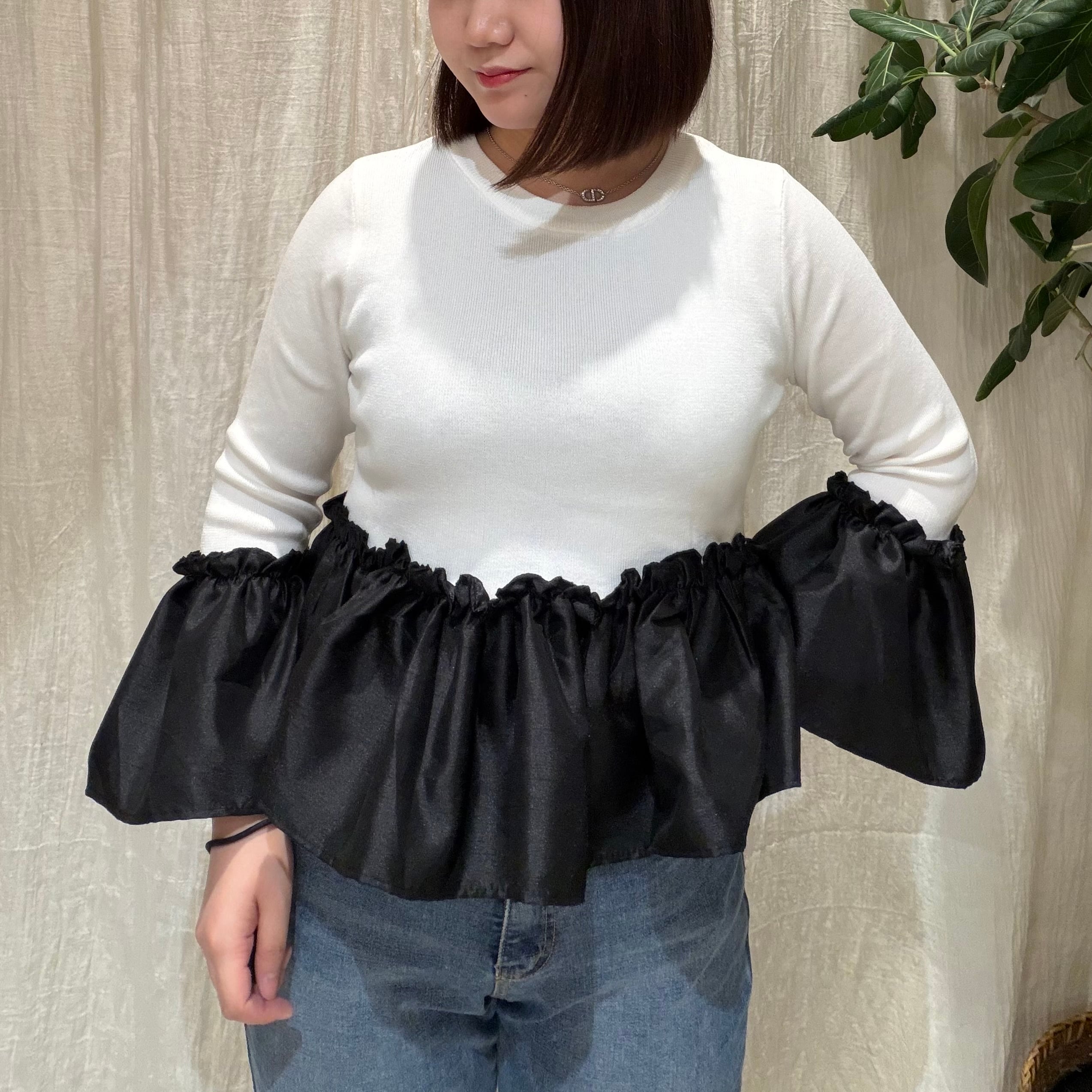 バイカラーデザインが目を惹くペプラムニット。