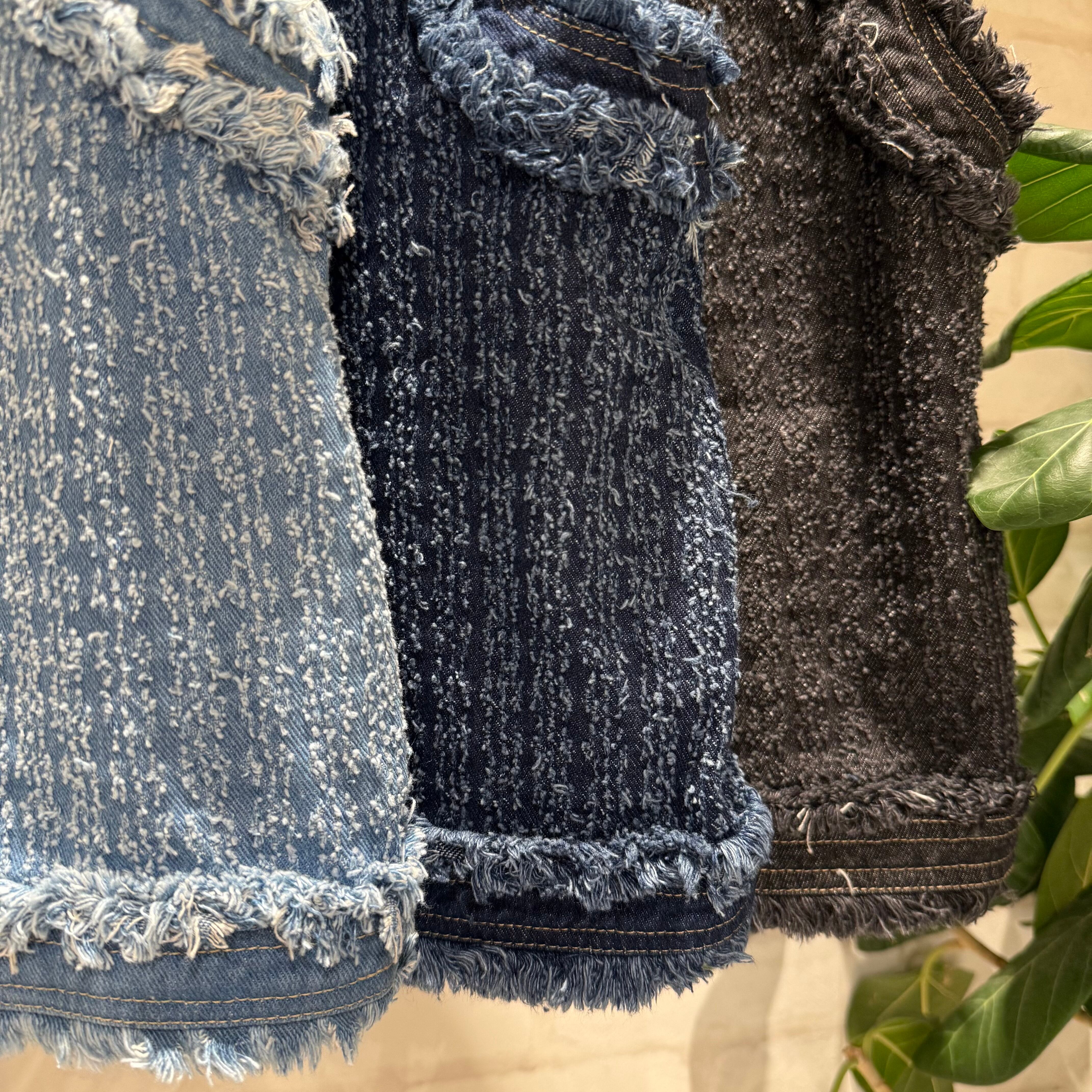 程よい色落ちのデニム素材にフリンジをあしらい、こなれ感のあるスタイルを演出します。