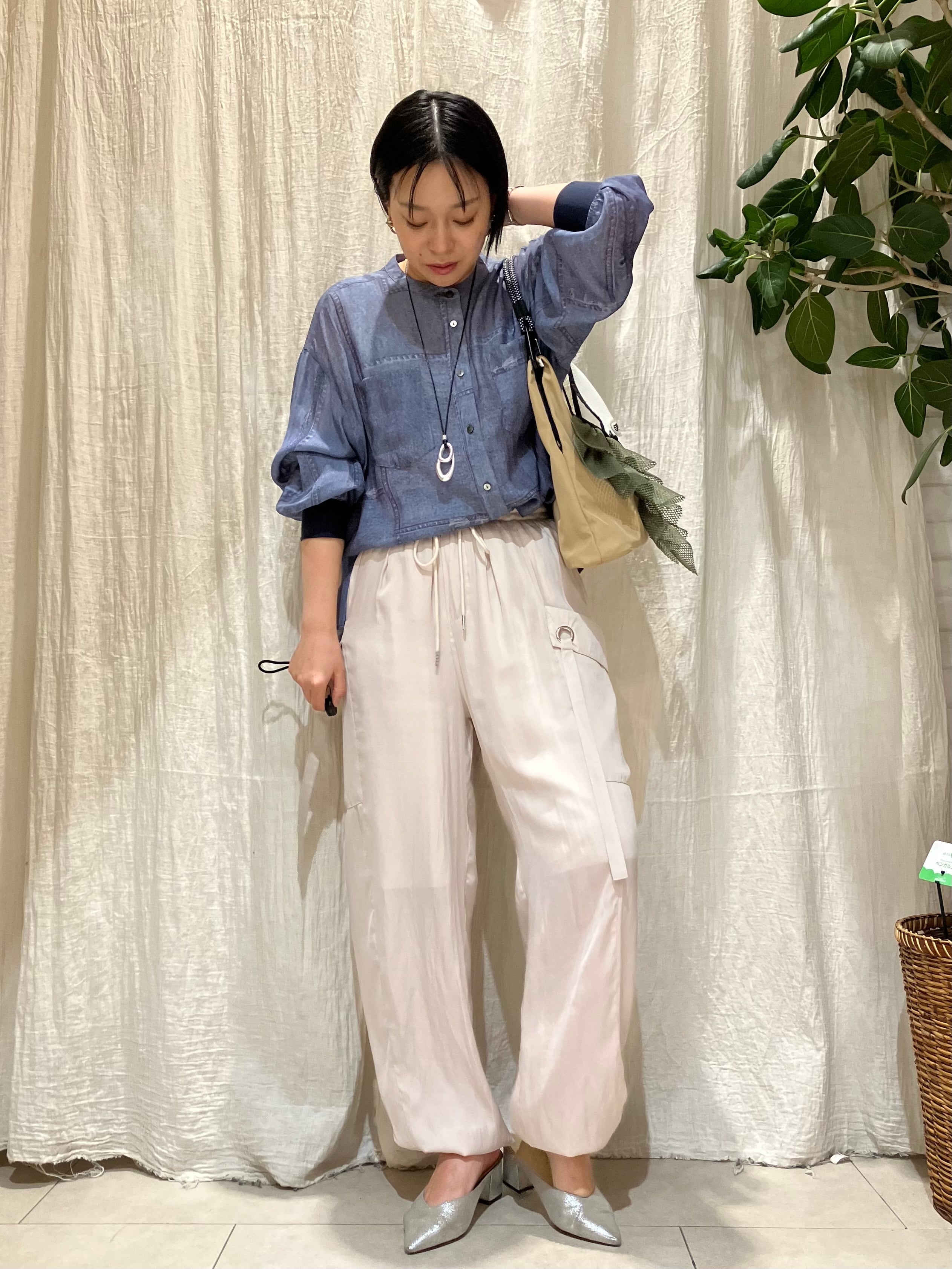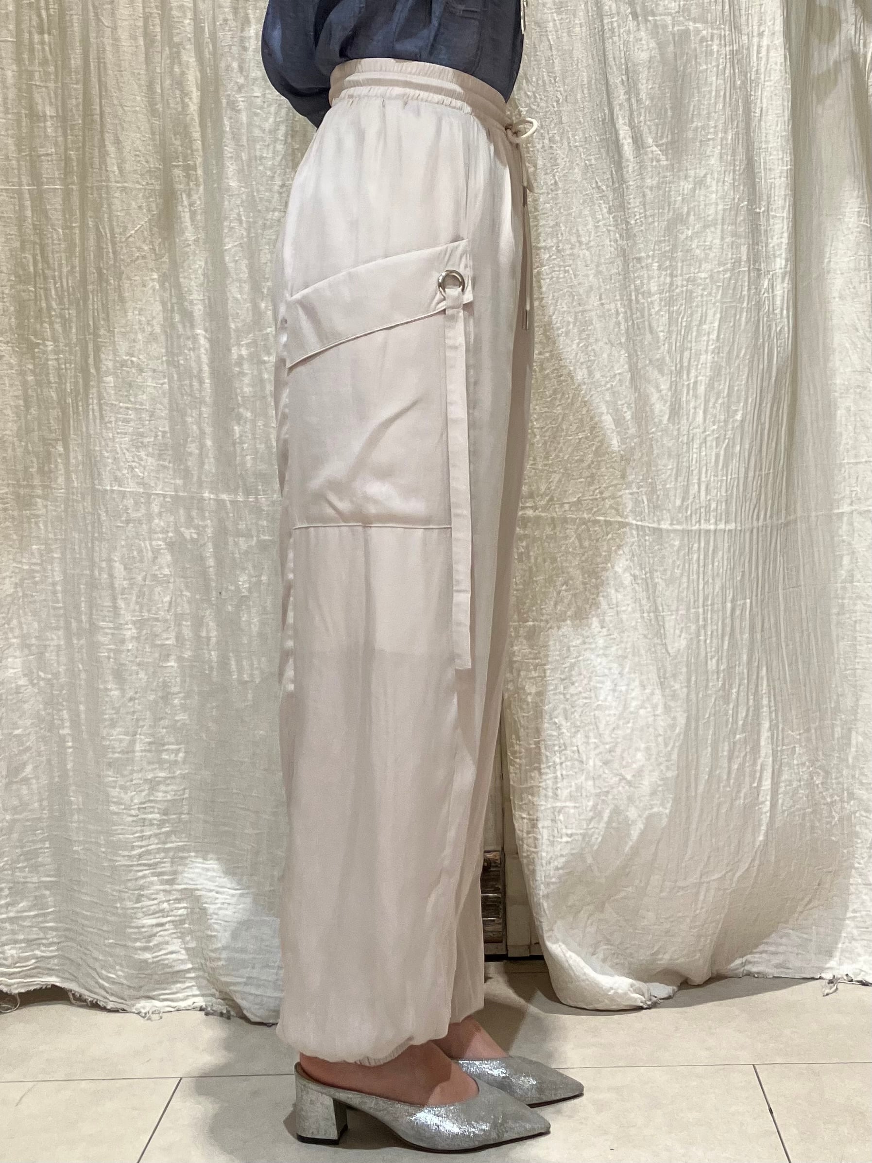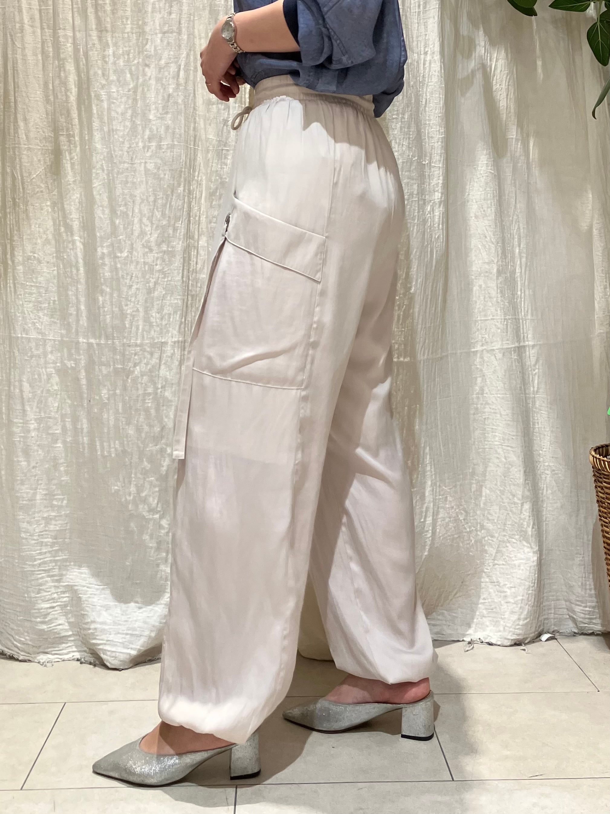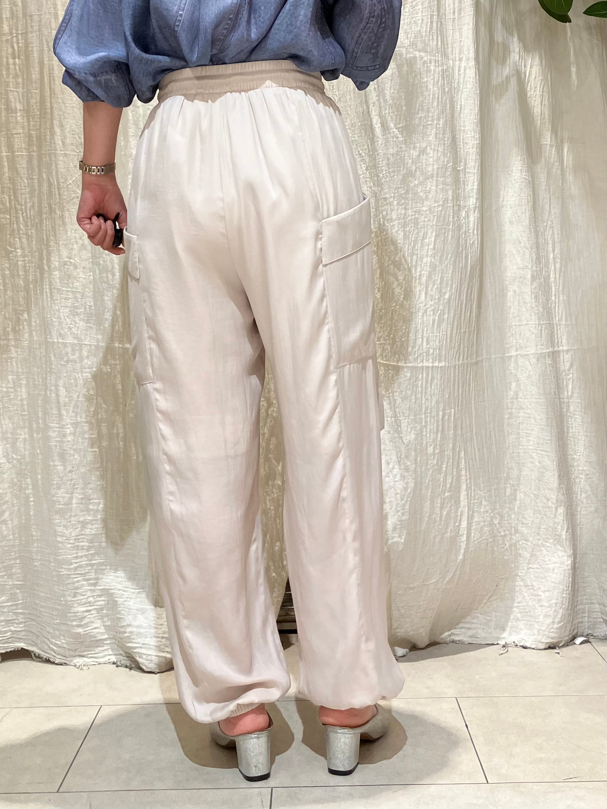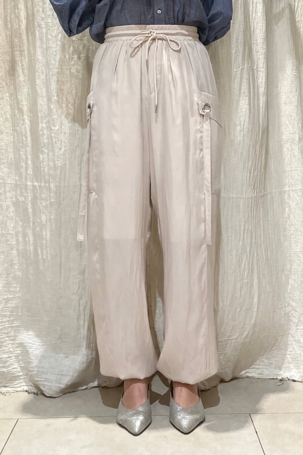 上品な光沢感が魅力のサテンカーゴパンツ。
