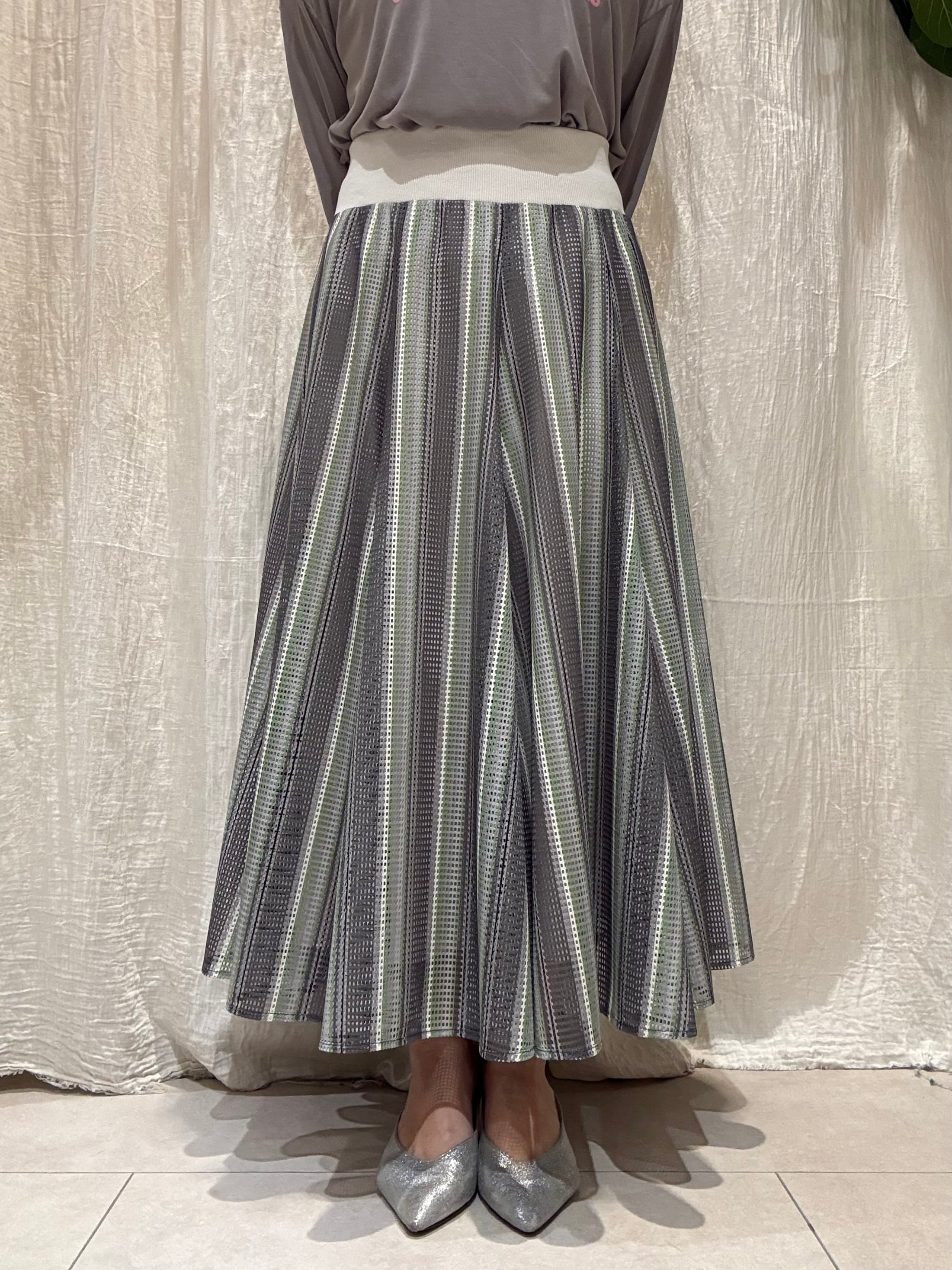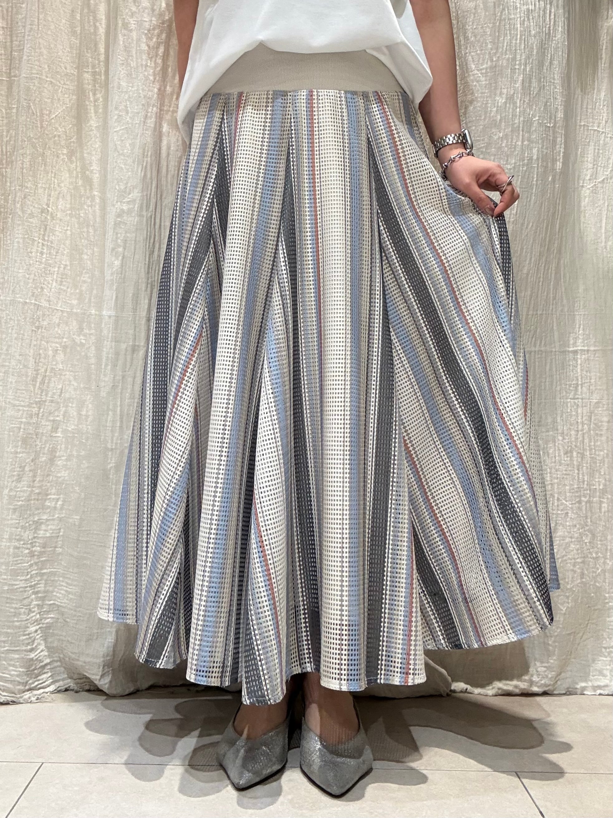 通気性の良いポリエステルメッシュに、鮮やかなマルチストライプが目を引くフレアスカート。