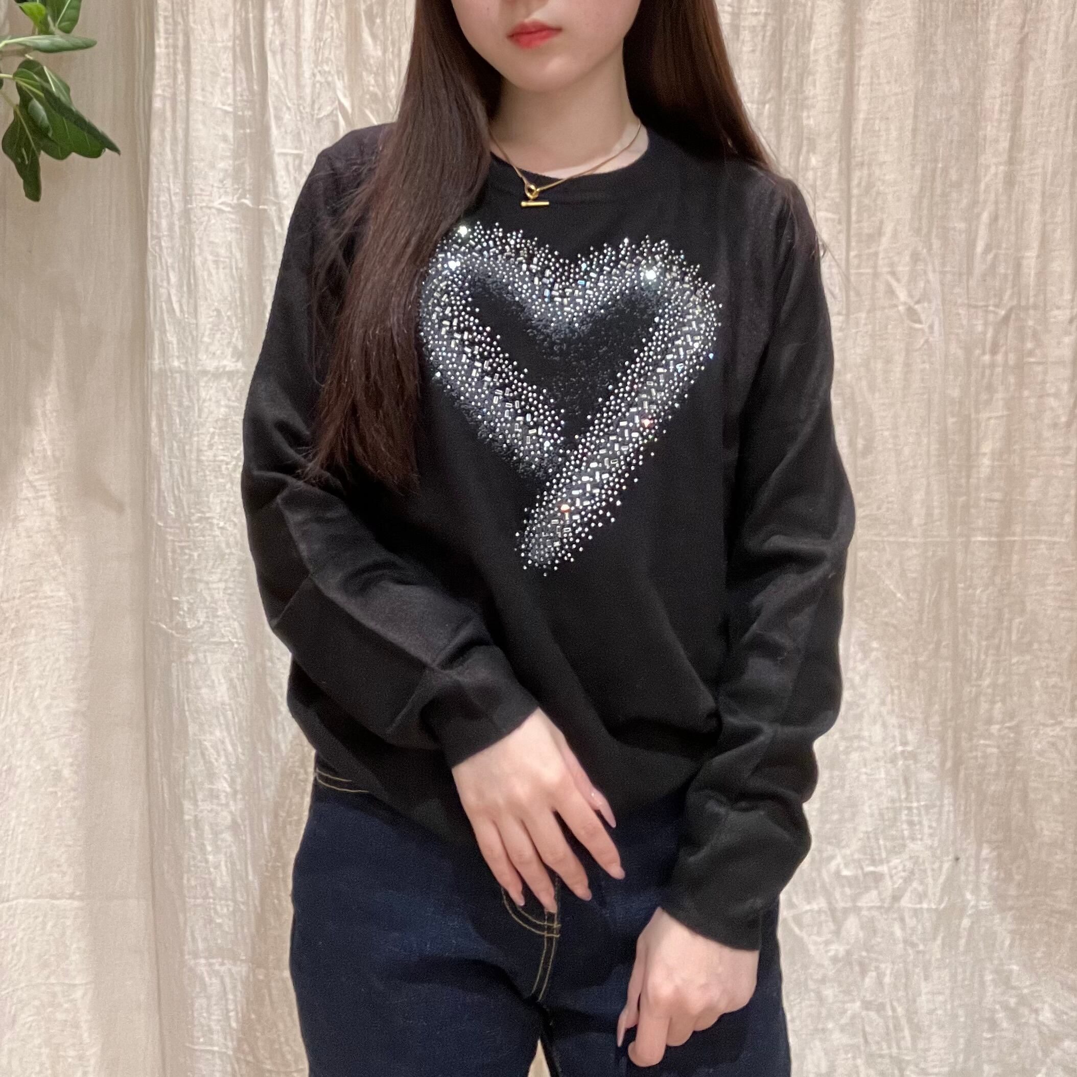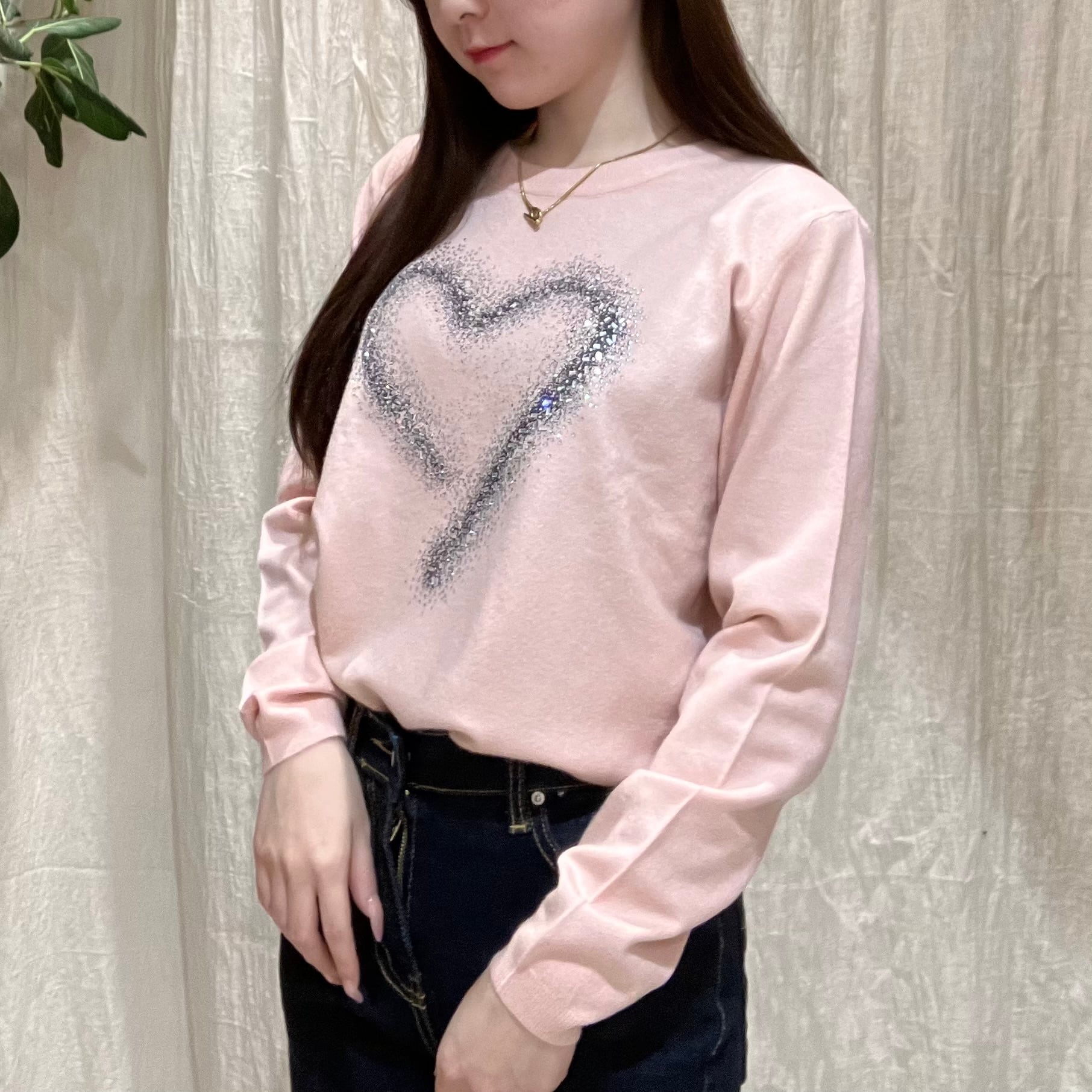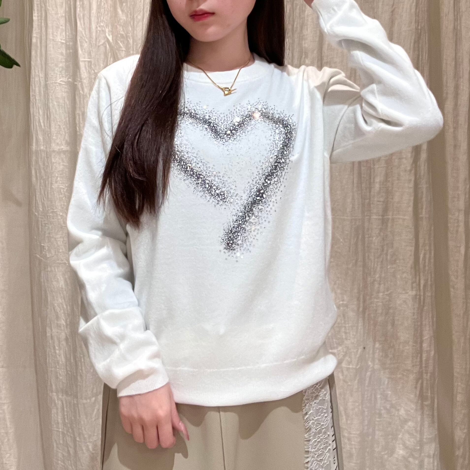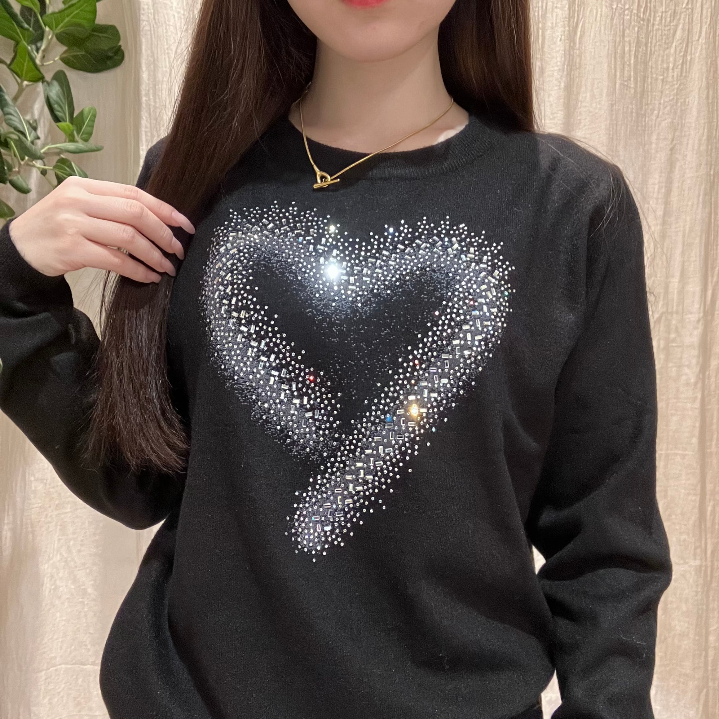 フロントに散りばめたハートビジューが、さりげなくきらめくデザインニット。