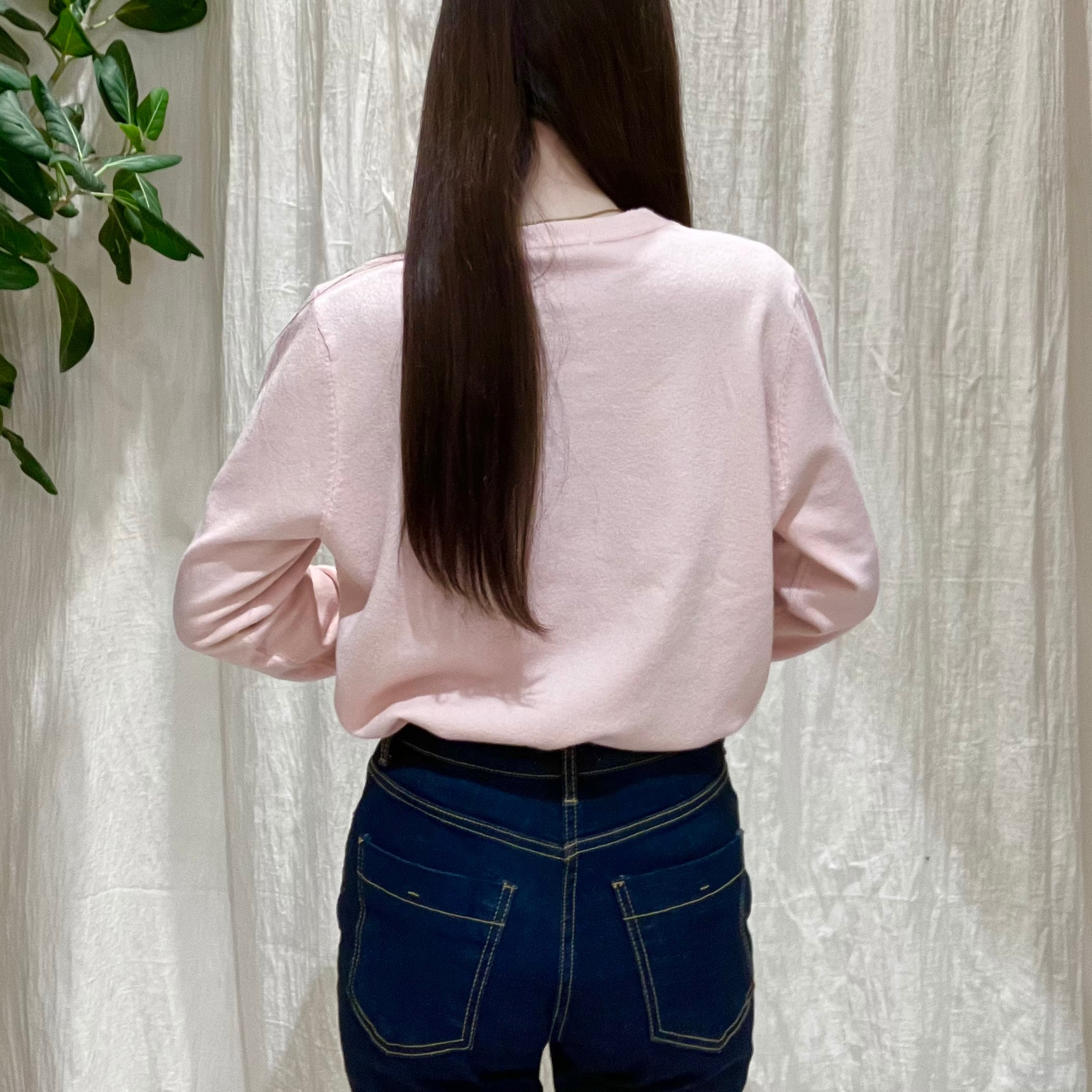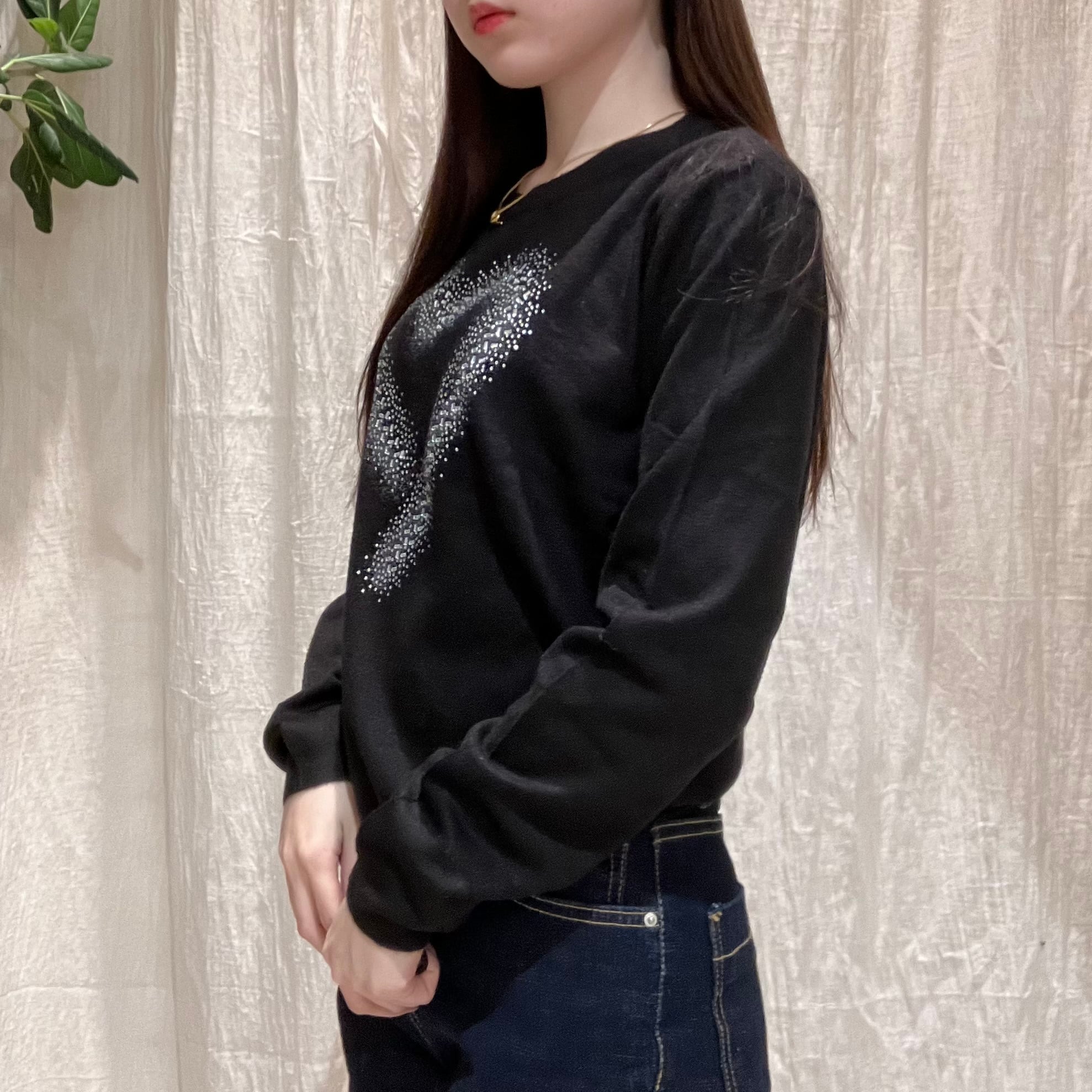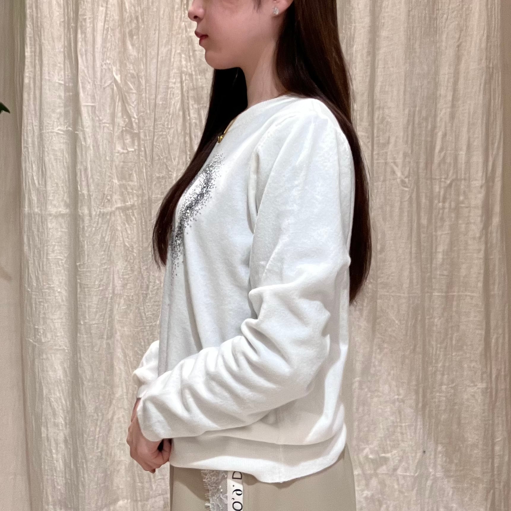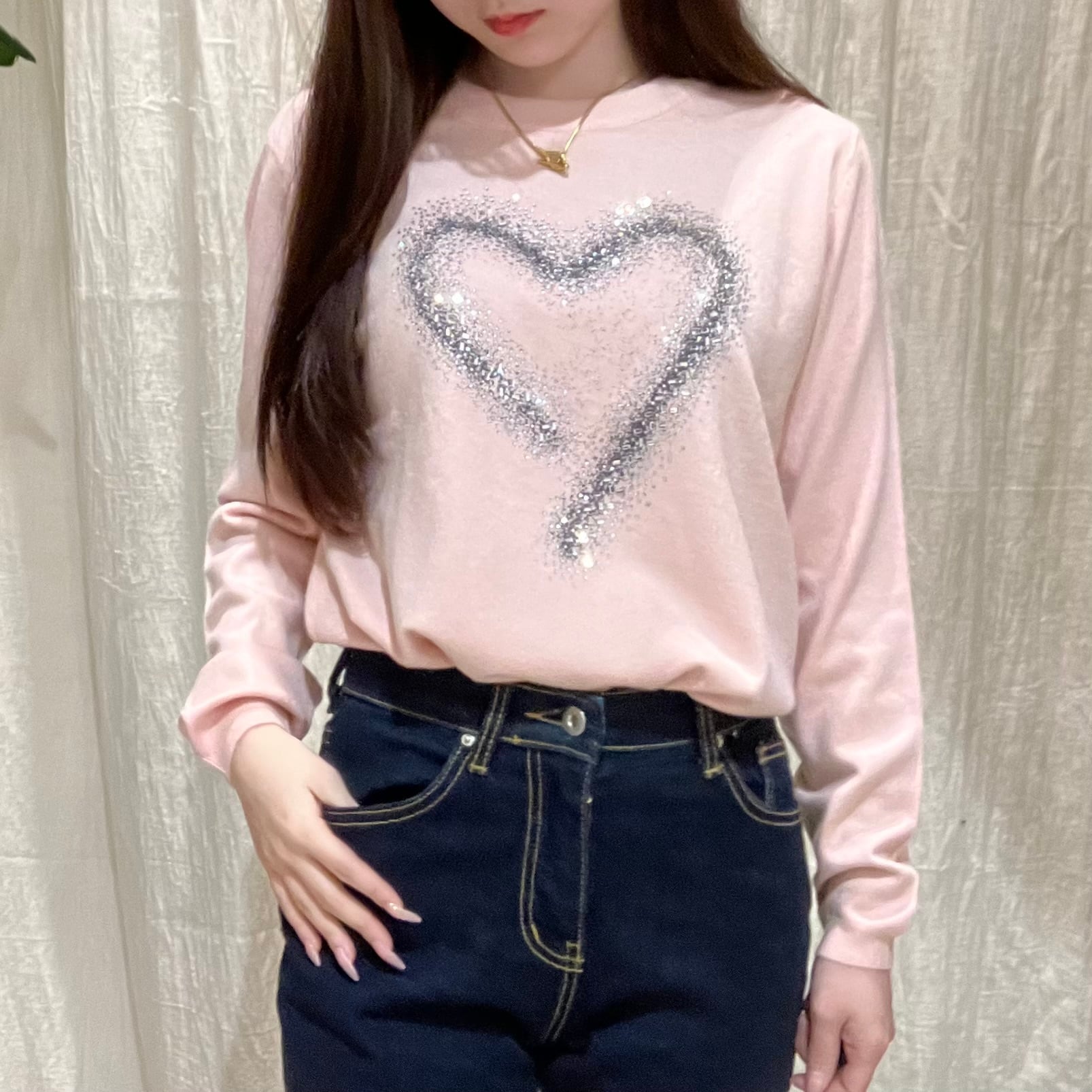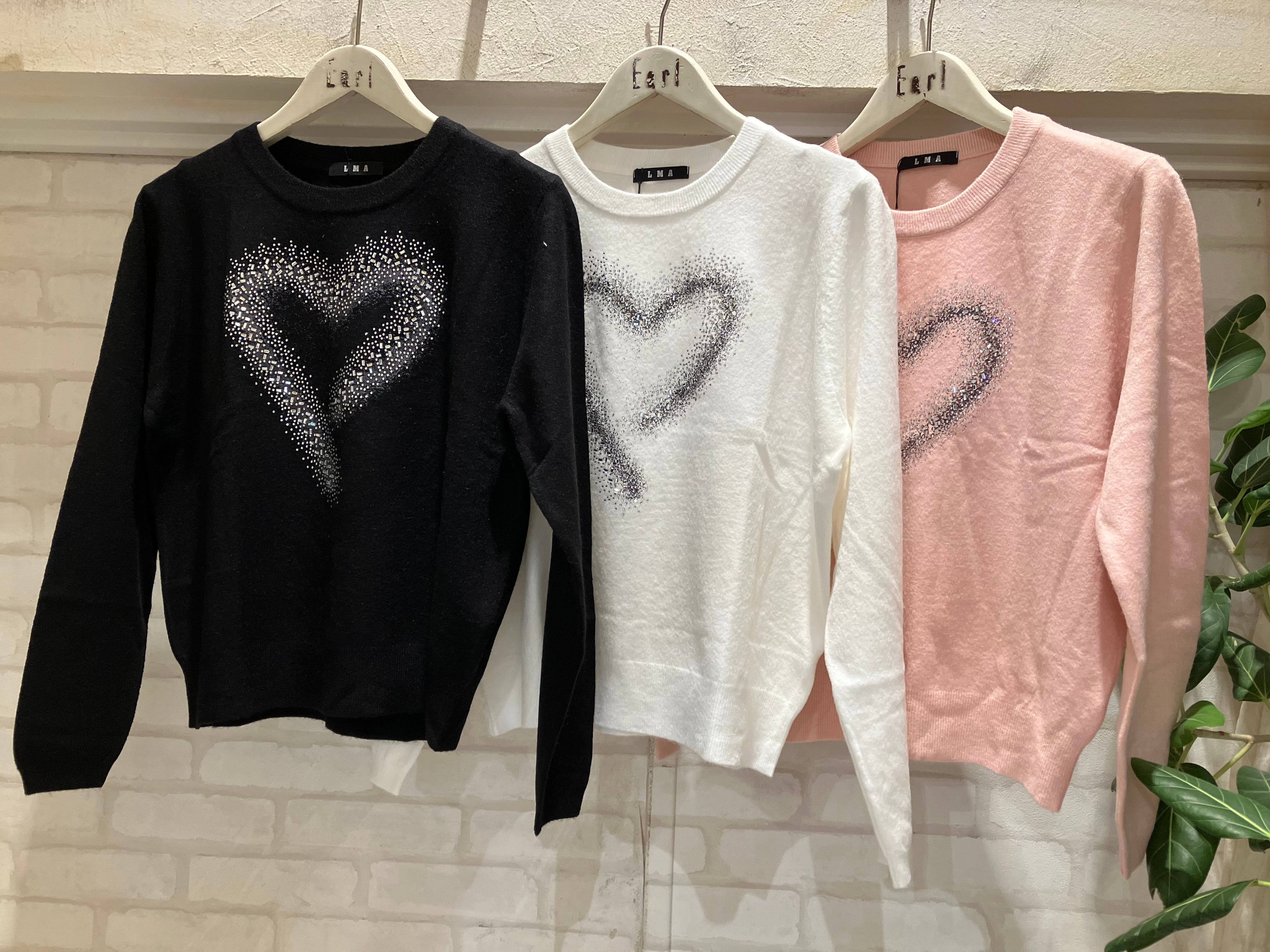 フロントに散りばめたハートビジューが、さりげなくきらめくデザインニット。