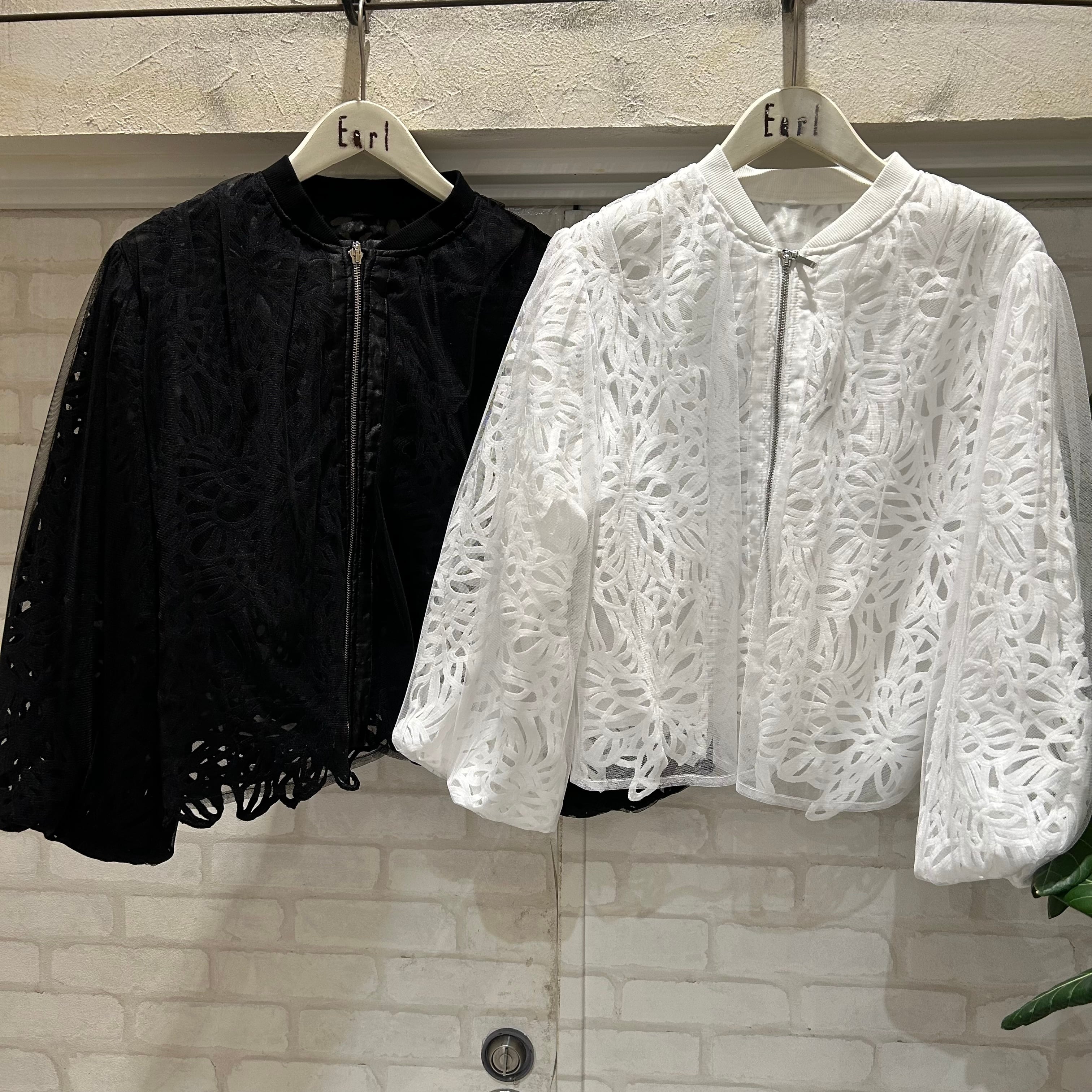 大きめの花柄レースを施したレイヤードレースブルゾンは、