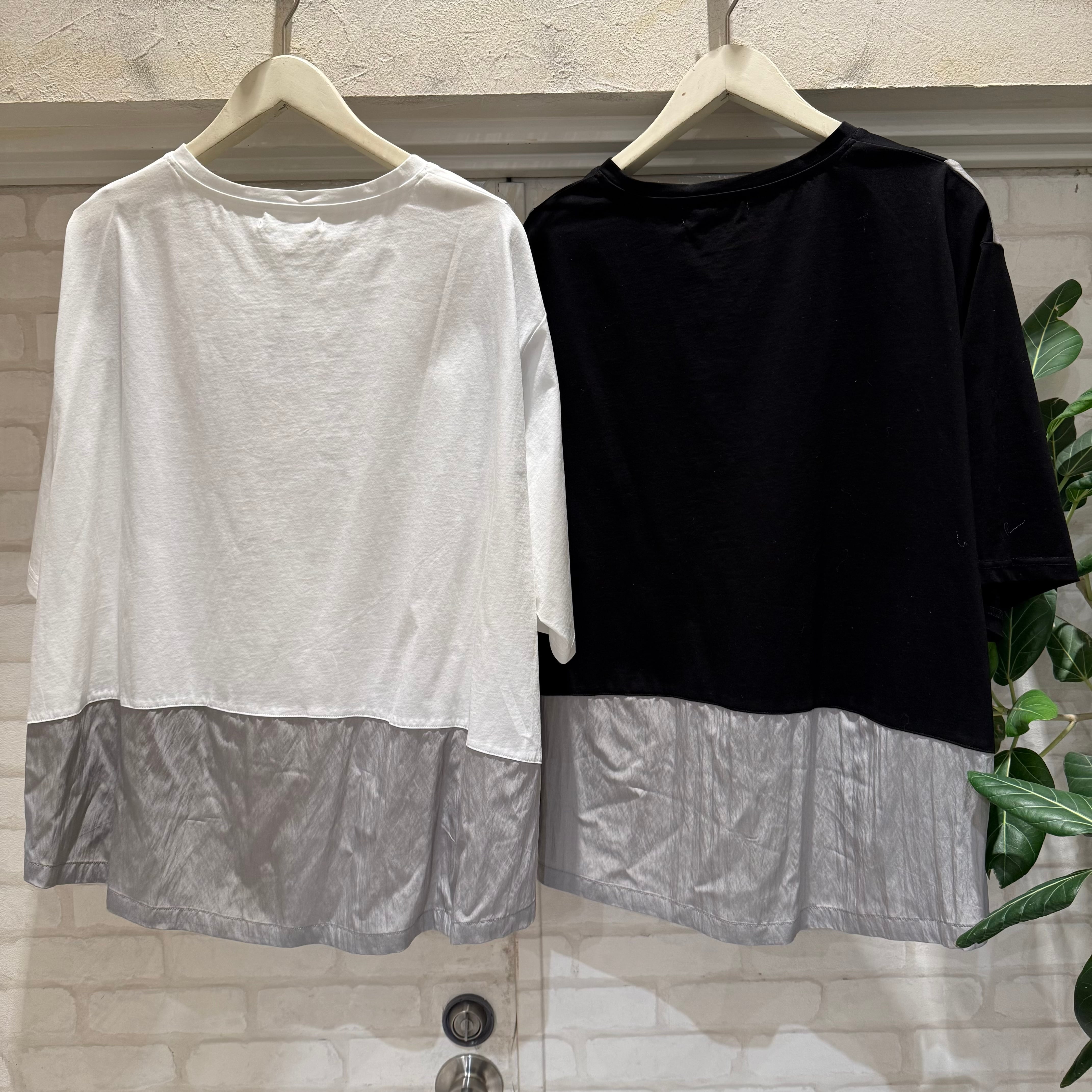 異素材の切替デザインが目を引く、上品な印象のブラウスです。