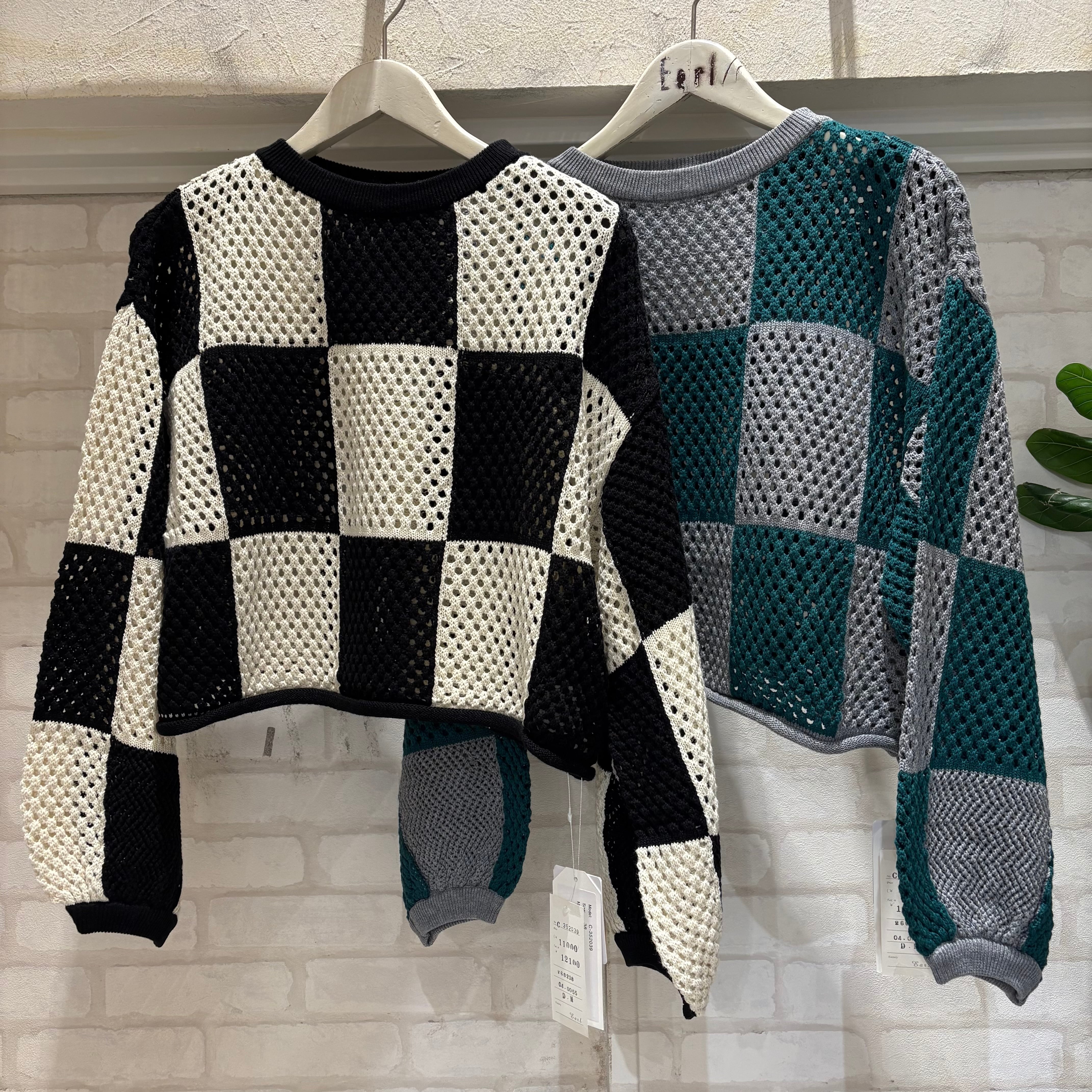 透かし編み×ブロックチェック柄の配色が