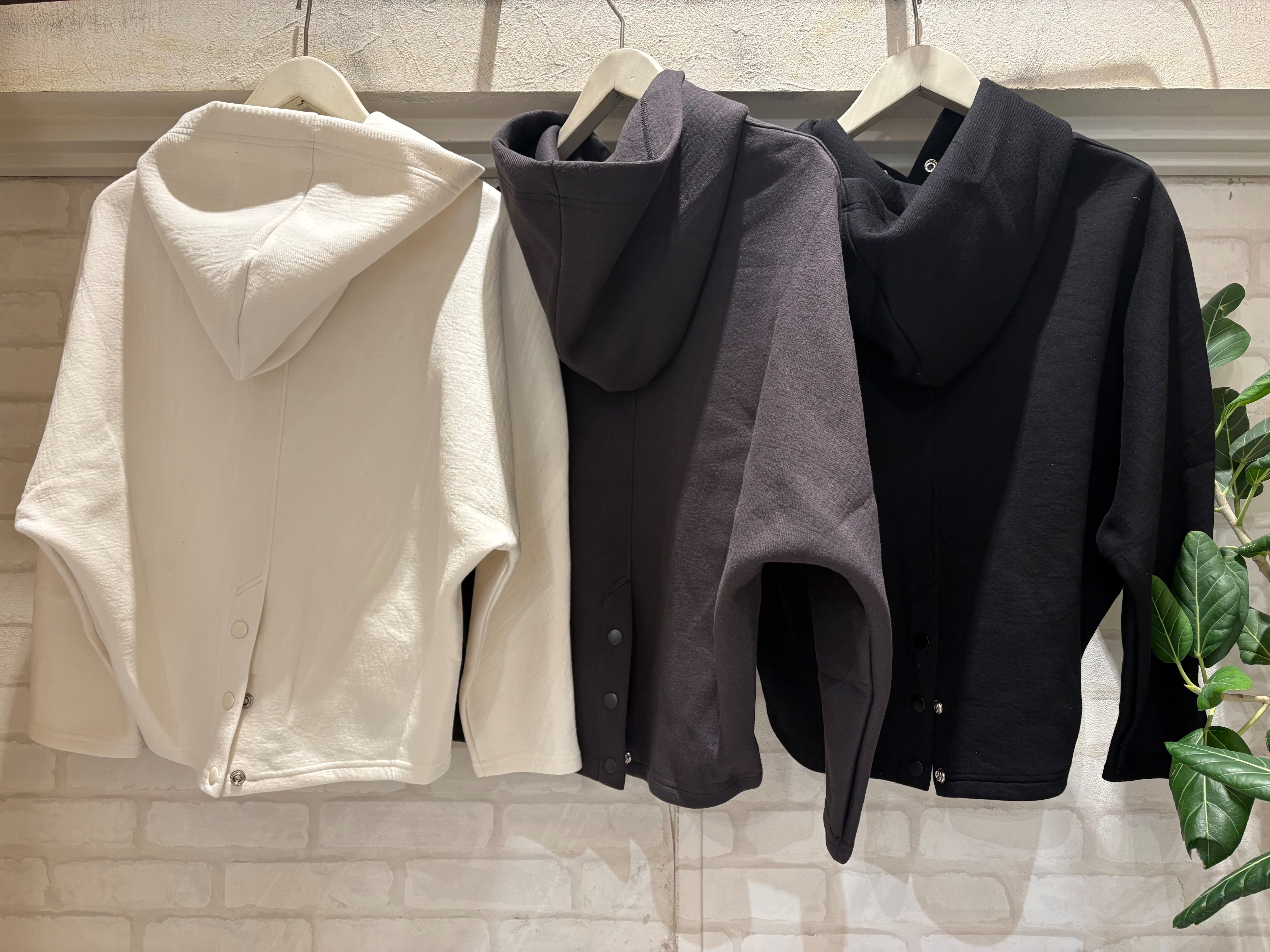 ストレッチ性のあるポンチ素材で仕立てたドルマンフーディー。