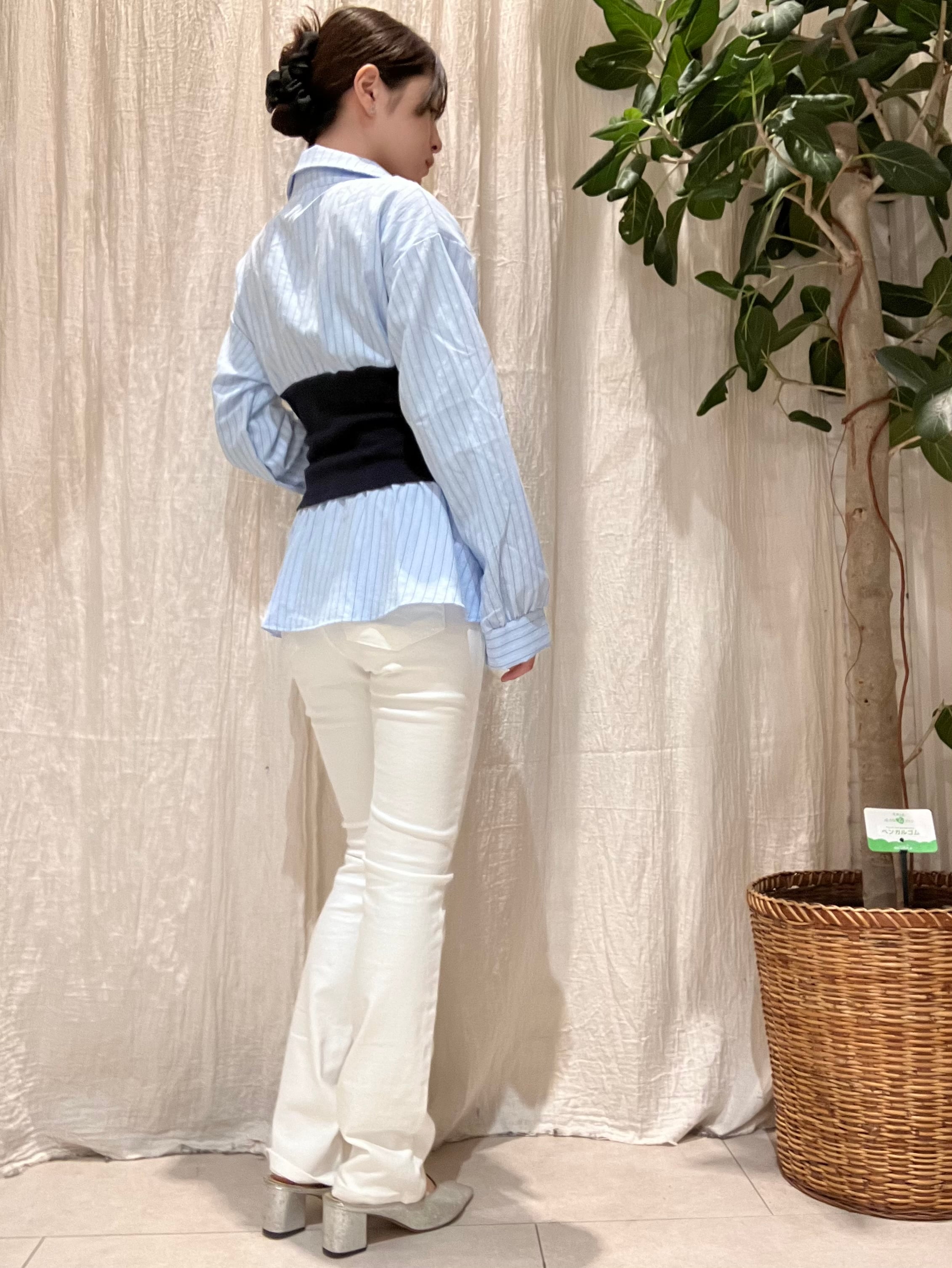 ウエストのリボンでキュッと絞れて、スタイルを美しく細見えさせてくれるシャツブラウスです。
