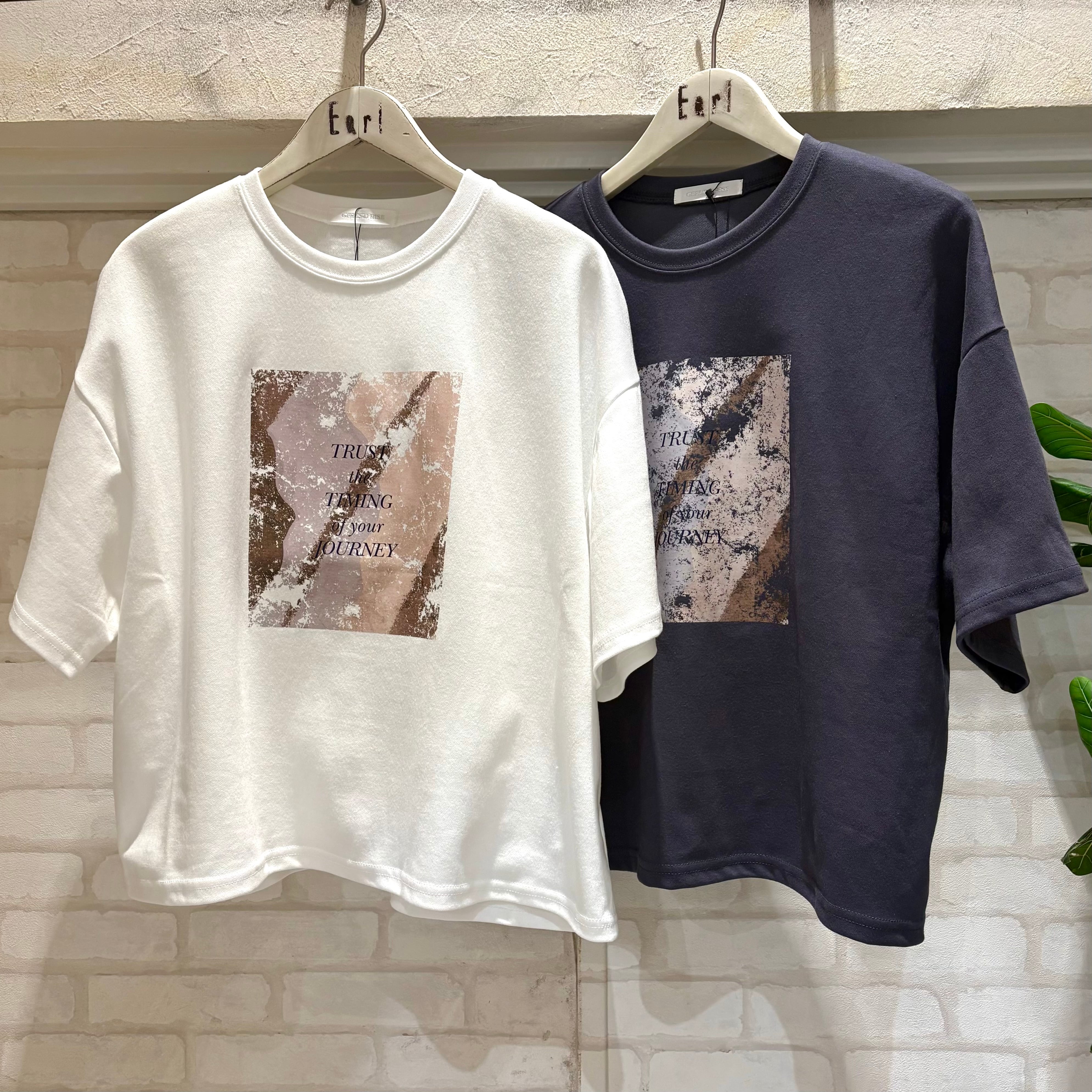 フロントのニュアンスアートとロゴが目を惹く、大人カジュアルなTシャツです。