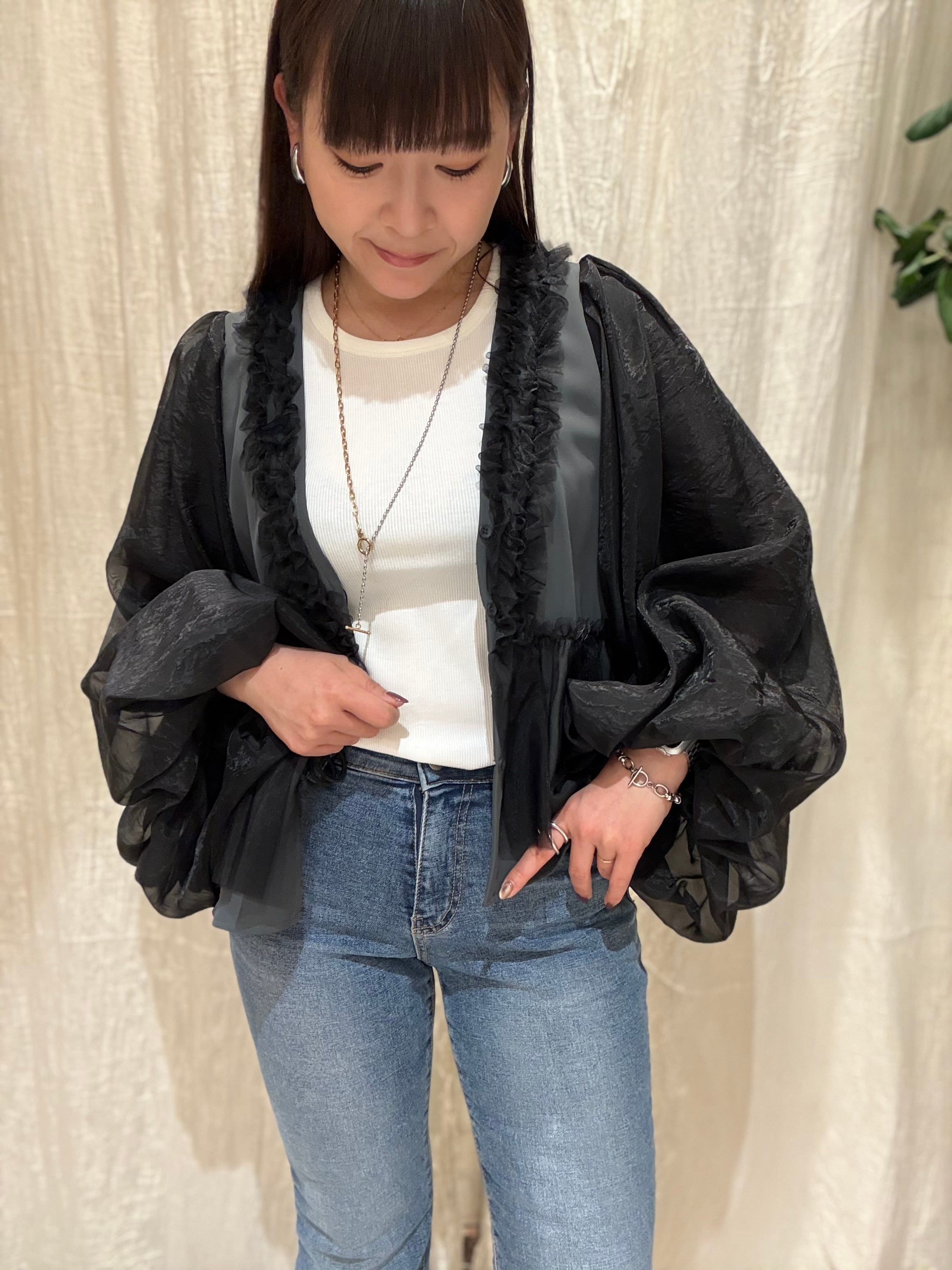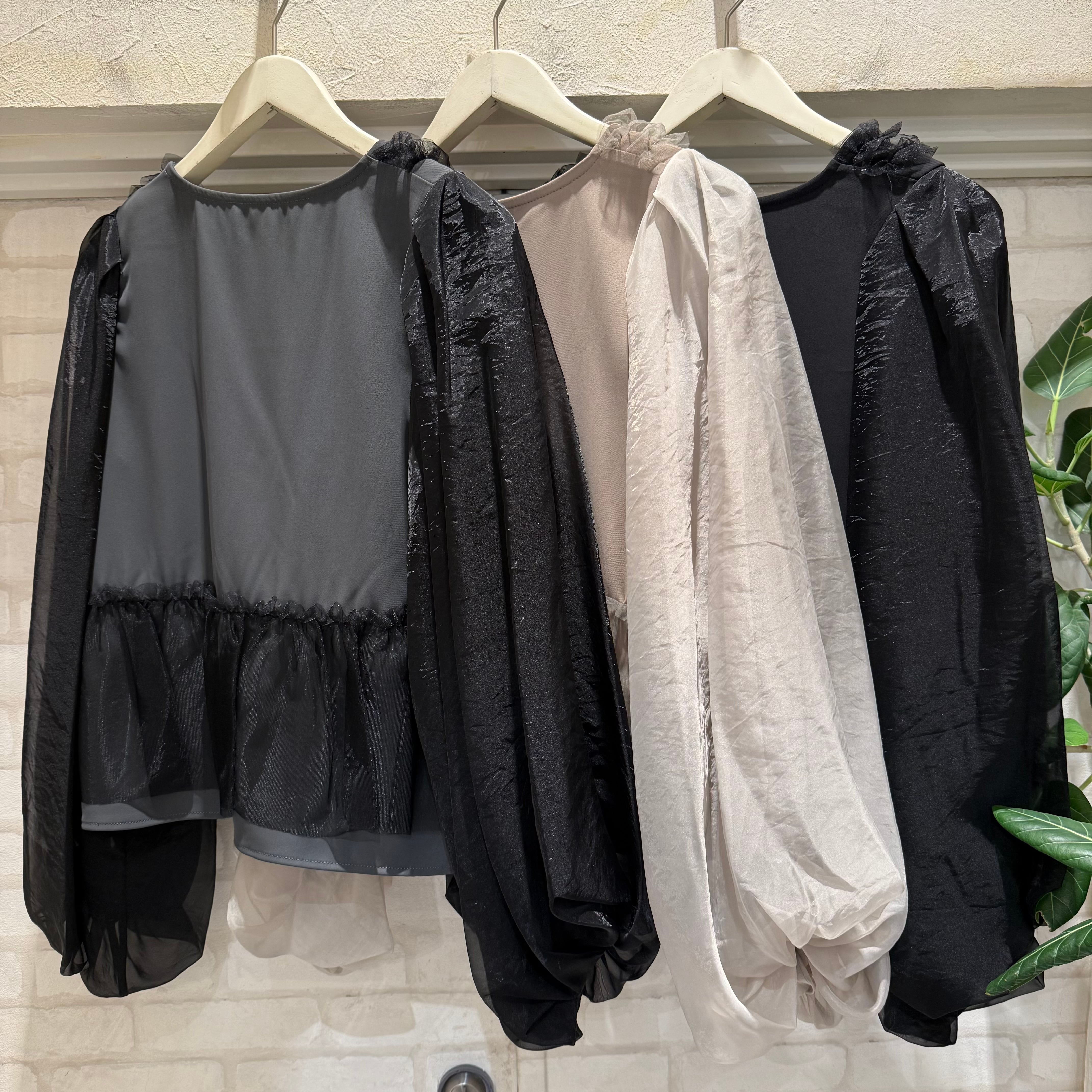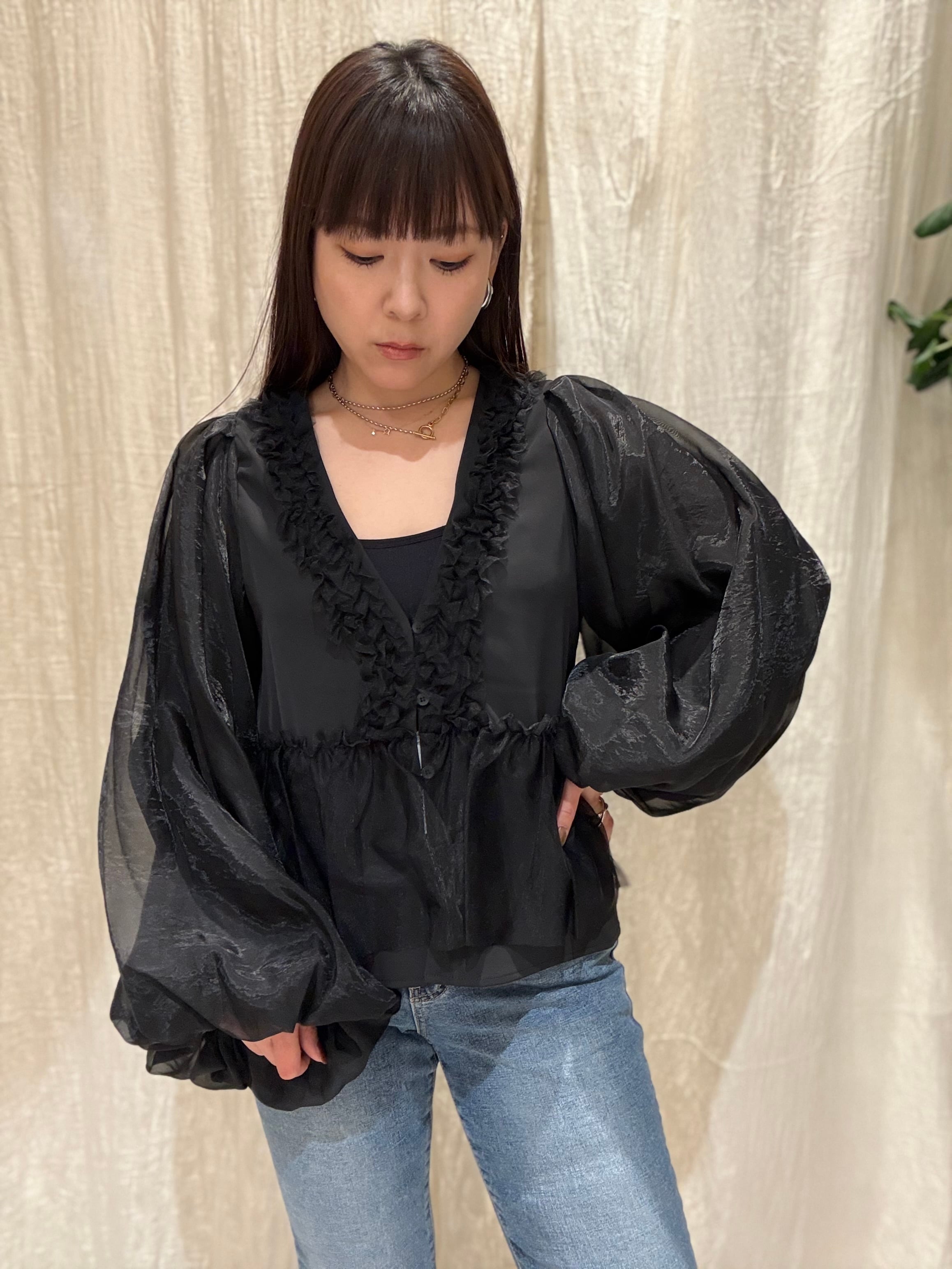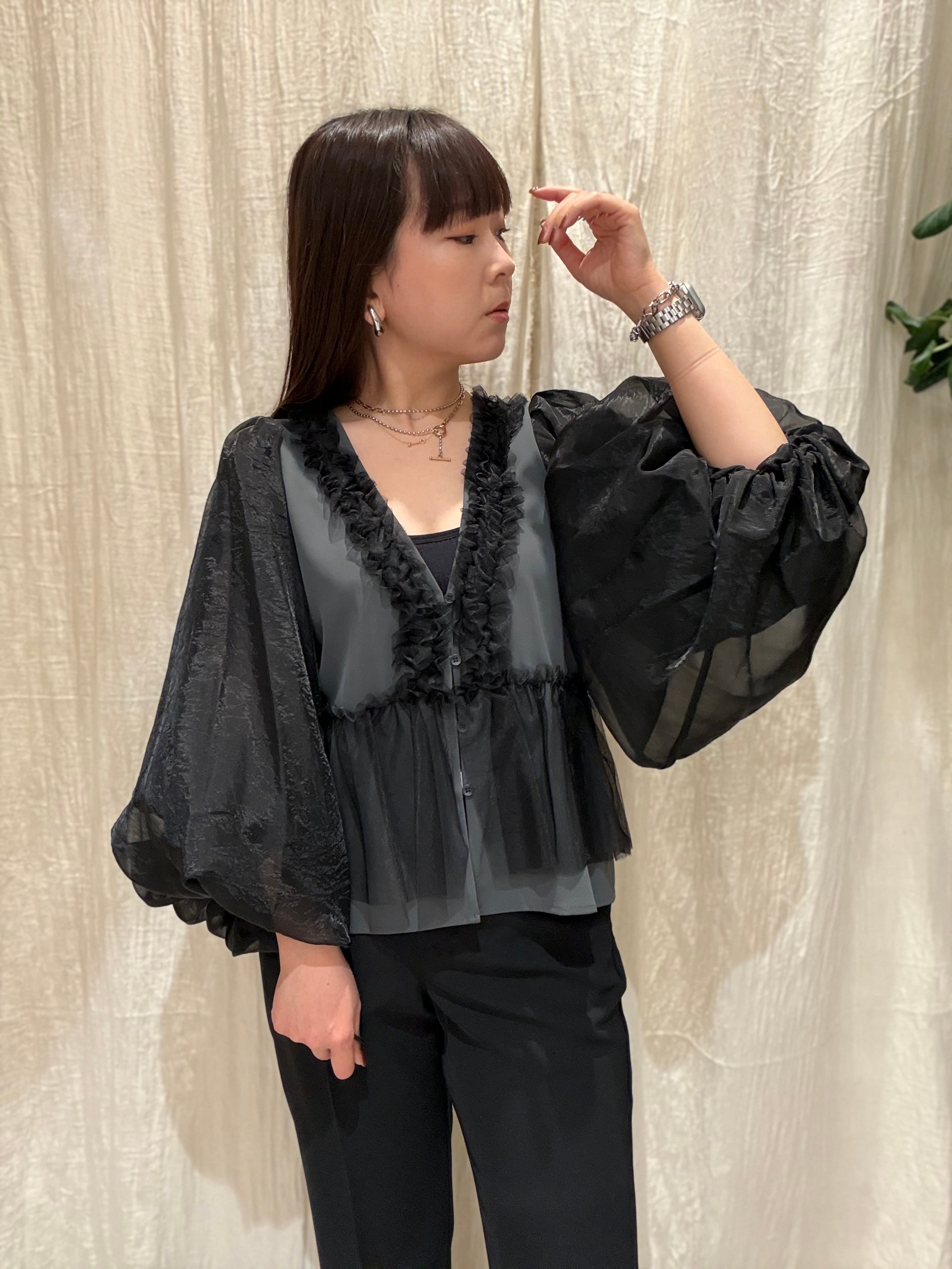 繊細なシアー素材にたっぷりのフリルをあしらった、存在感のあるレイヤードブラウス。