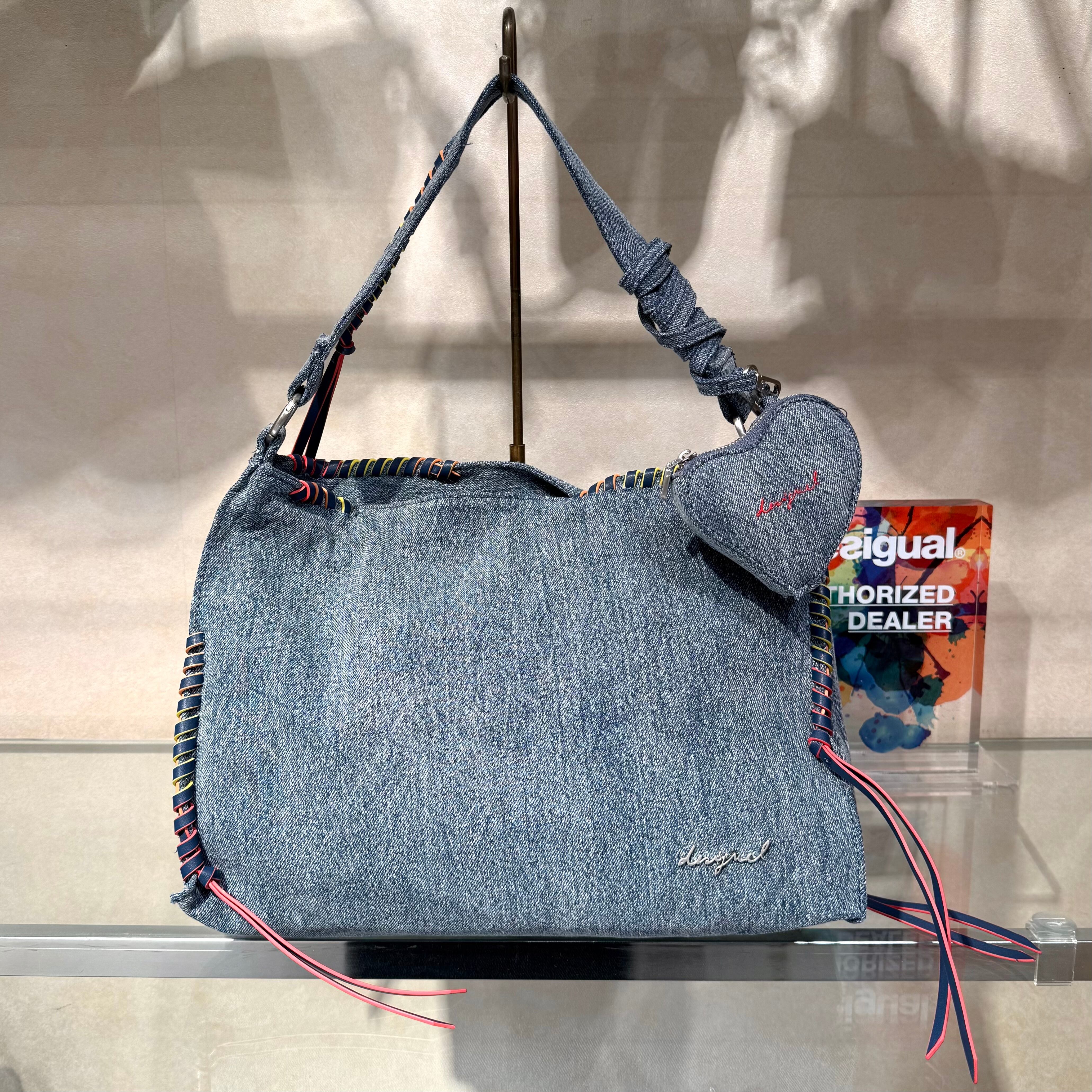 デニム生地を使用した大きなバッグで、縁に編み込みディテールを施し、取り外し可能なハート型コインパースチャーム付き。内側には仕切りポケットを備え、使い勝手にも配慮。ショルダーストラップ付きの2WAY仕様で、カジュアルながら高見えするデザインに◎