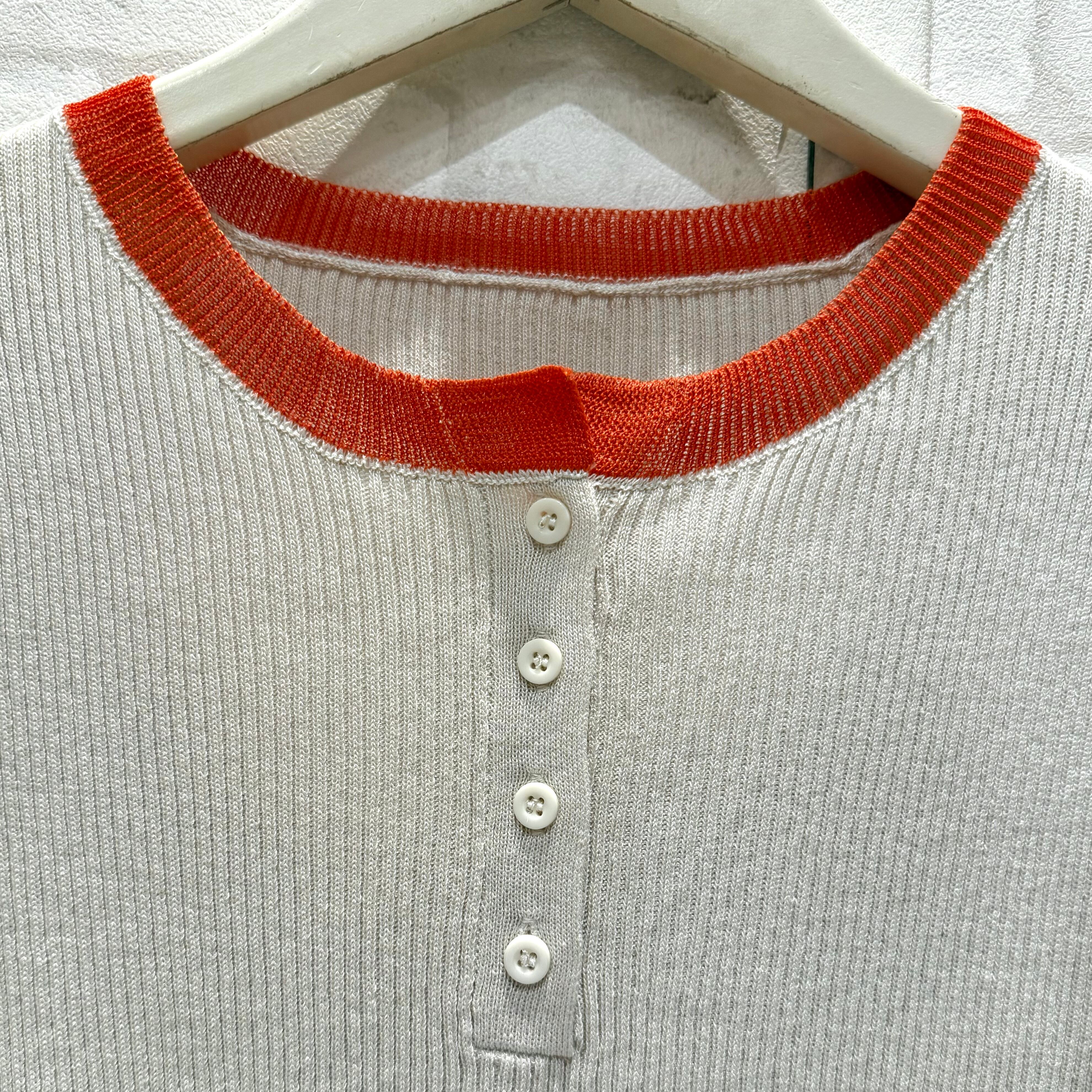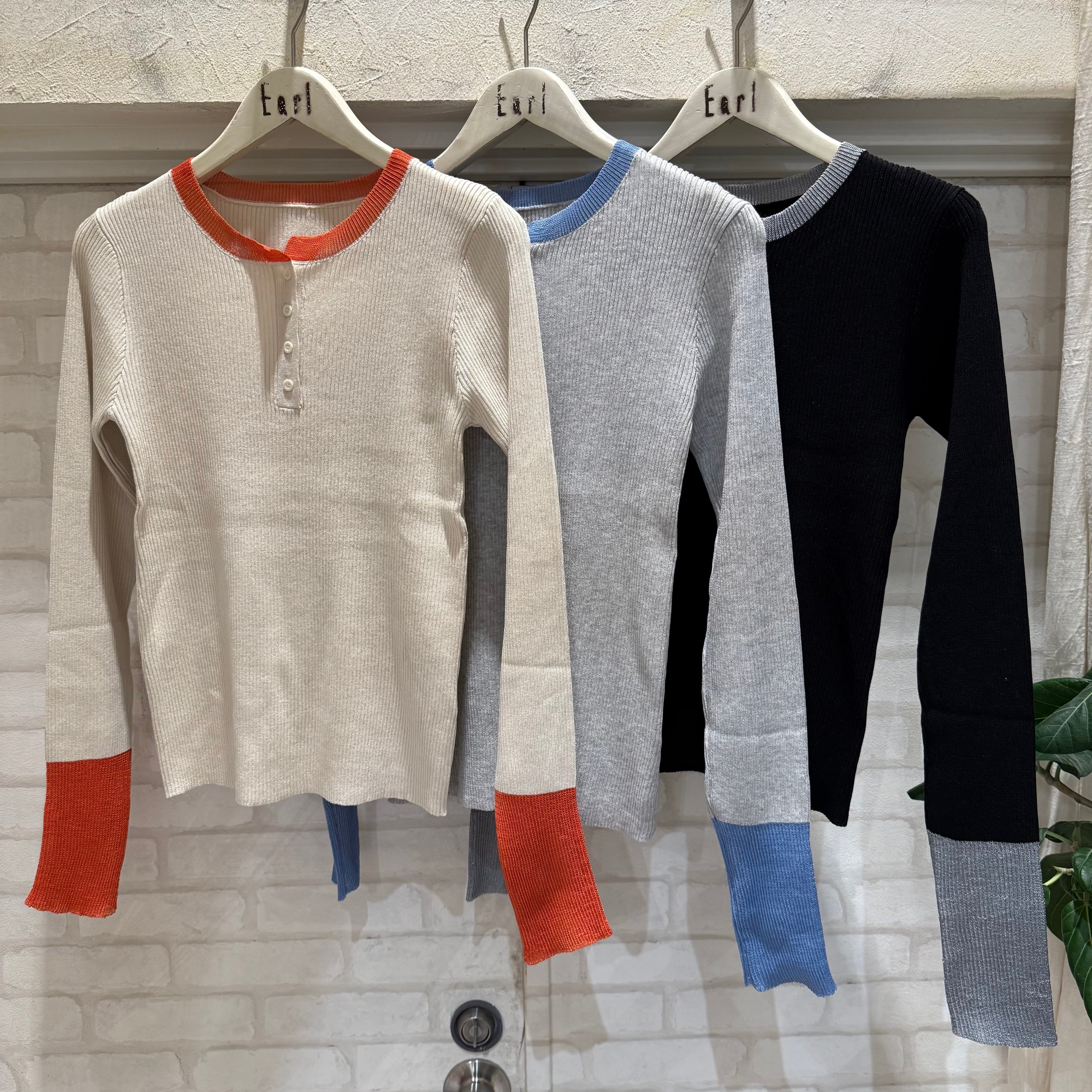 コントラストカラーが目を引くバイカラーデザインのヘンリーネックニットプルオーバー。