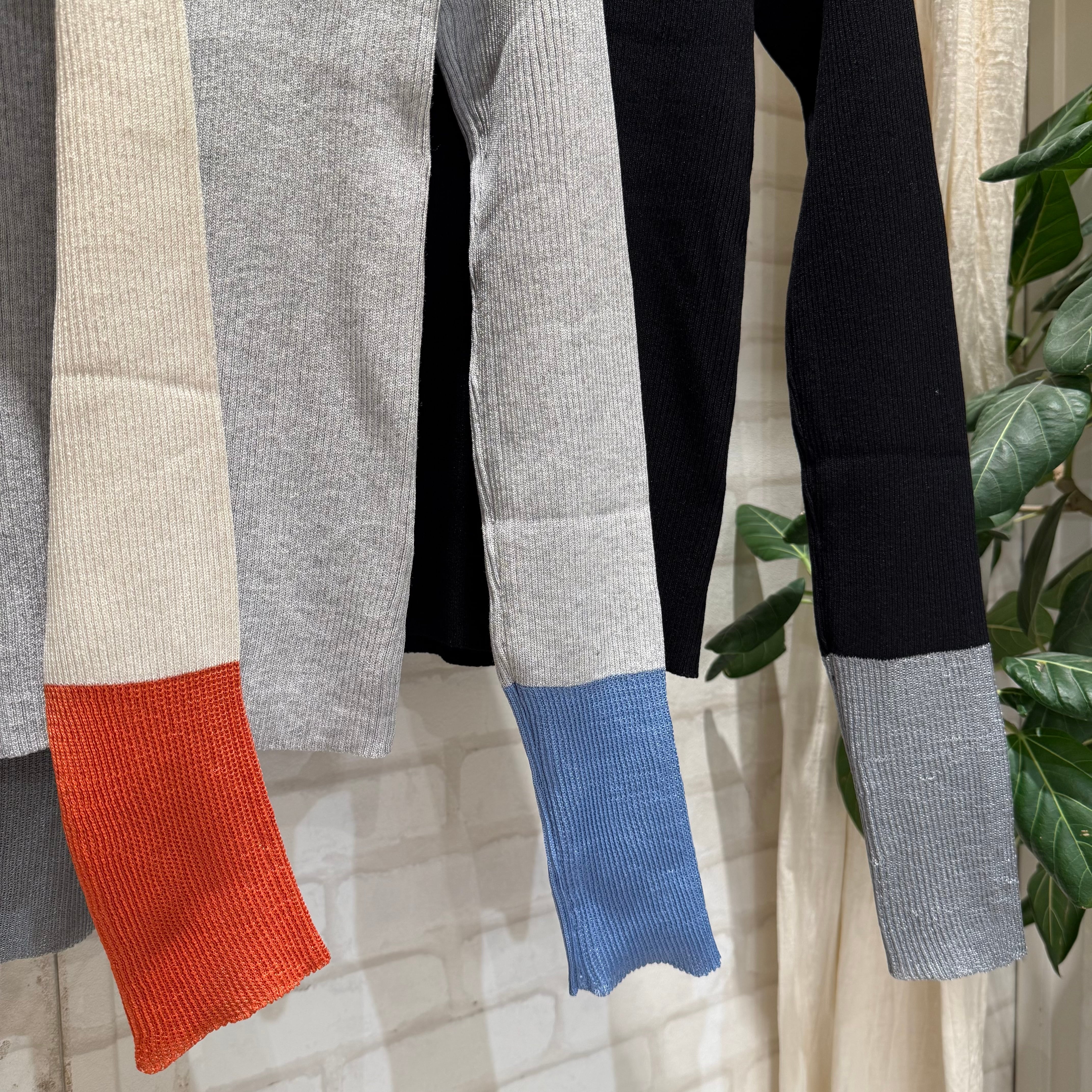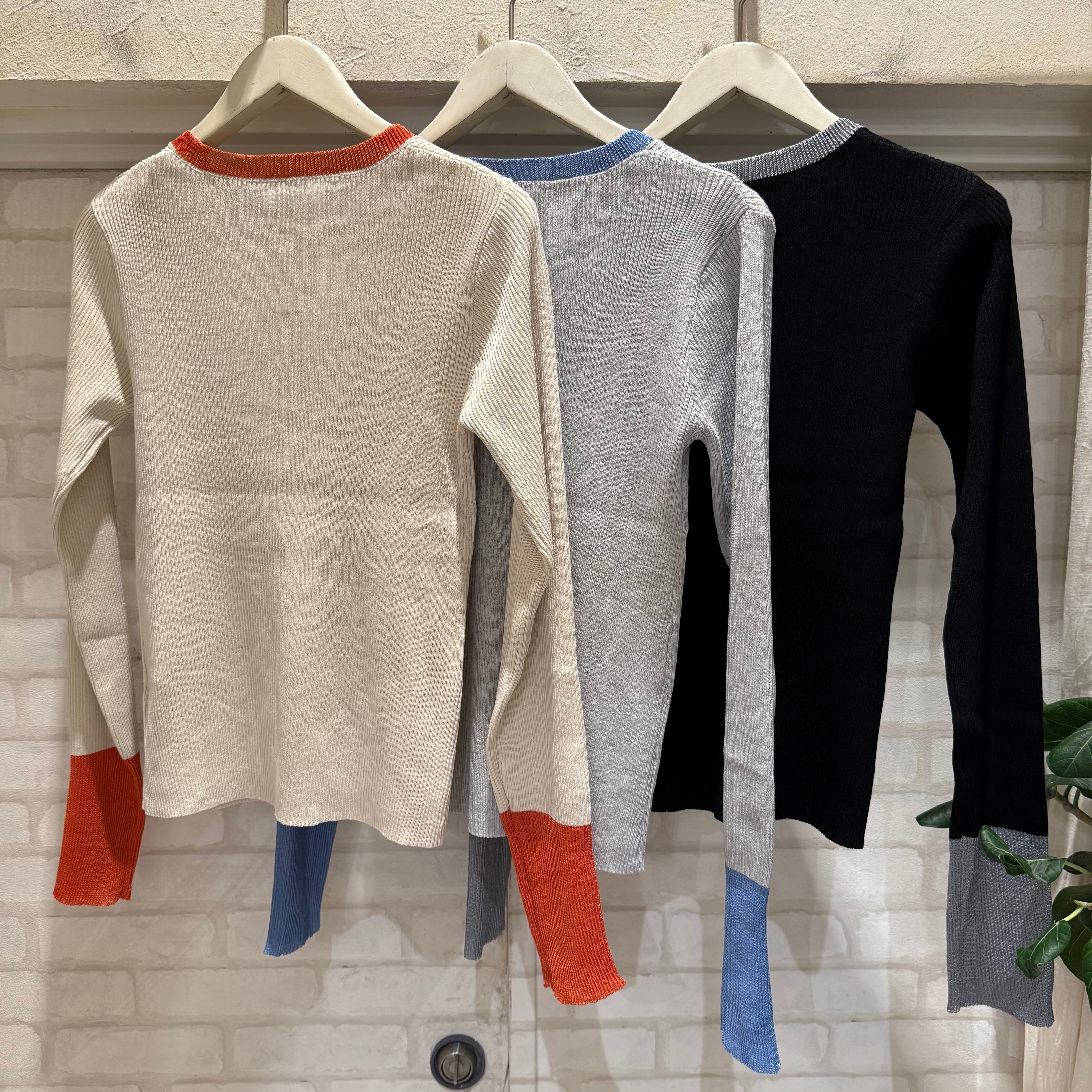 首周りのさりげない配色と袖の大胆な配色デザインが特徴。