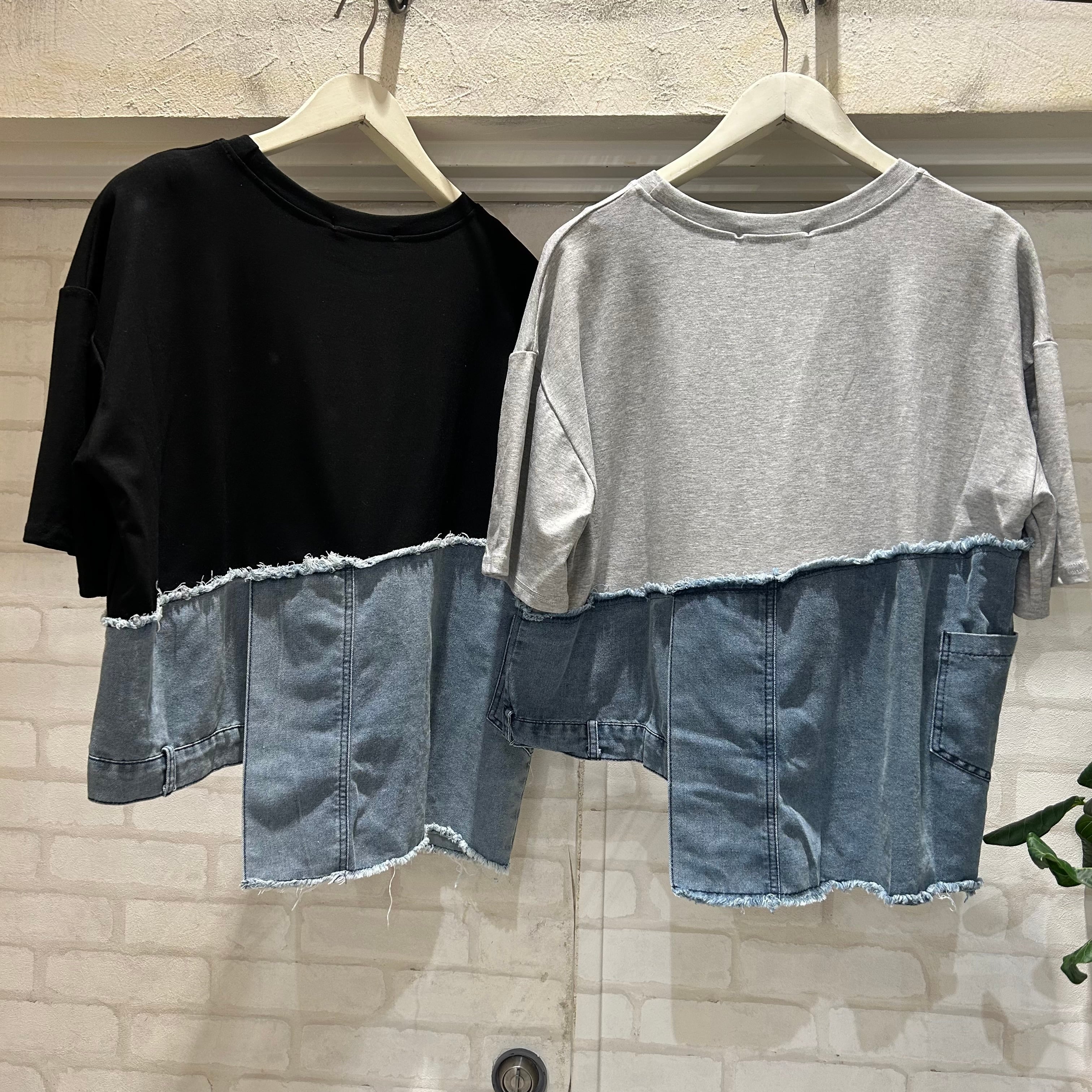 異素材ミックスが目を惹く、ドッキングデニム半袖トップス。