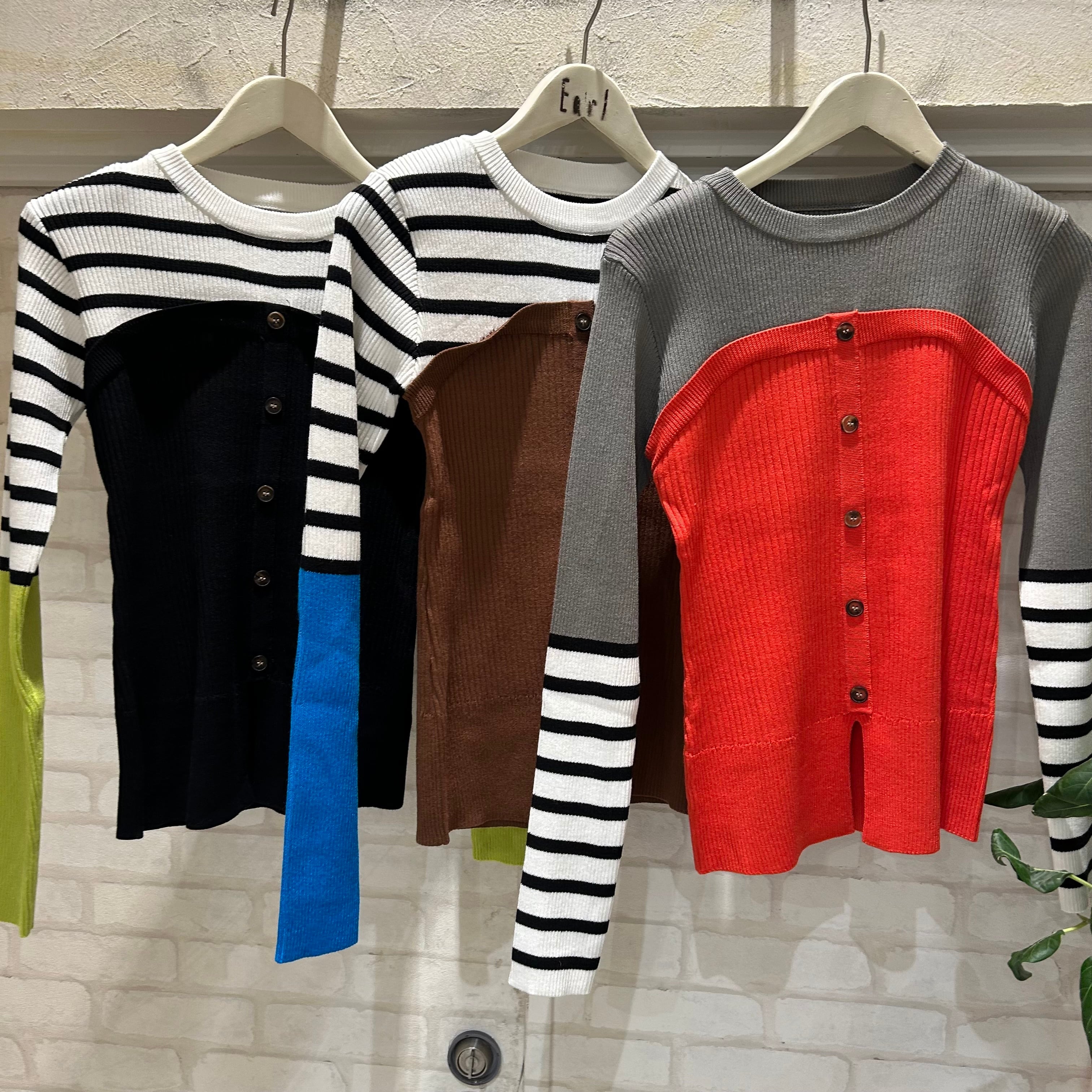 ボーダー×無地の切替で、シンプルながらも目を惹く1枚。