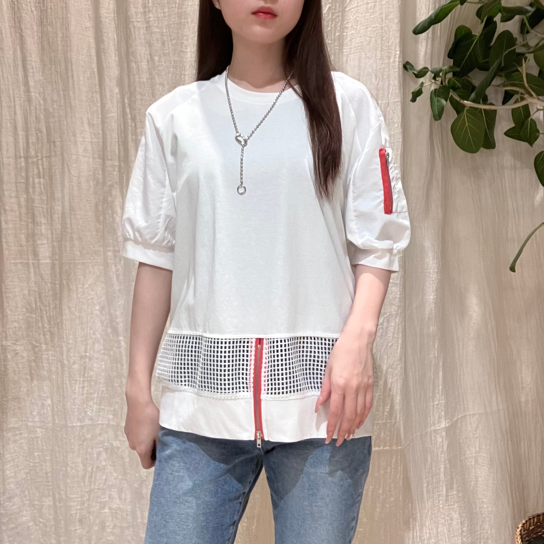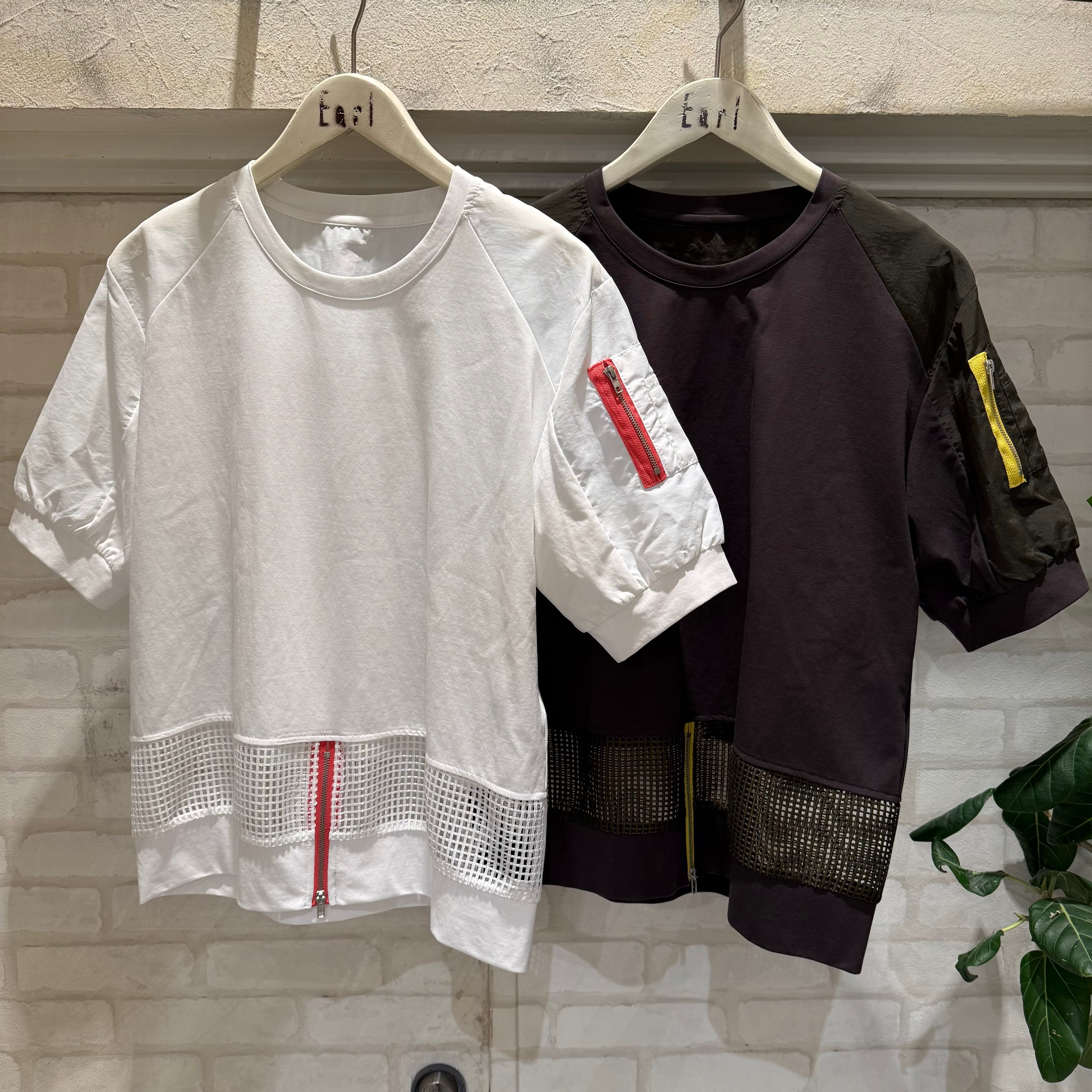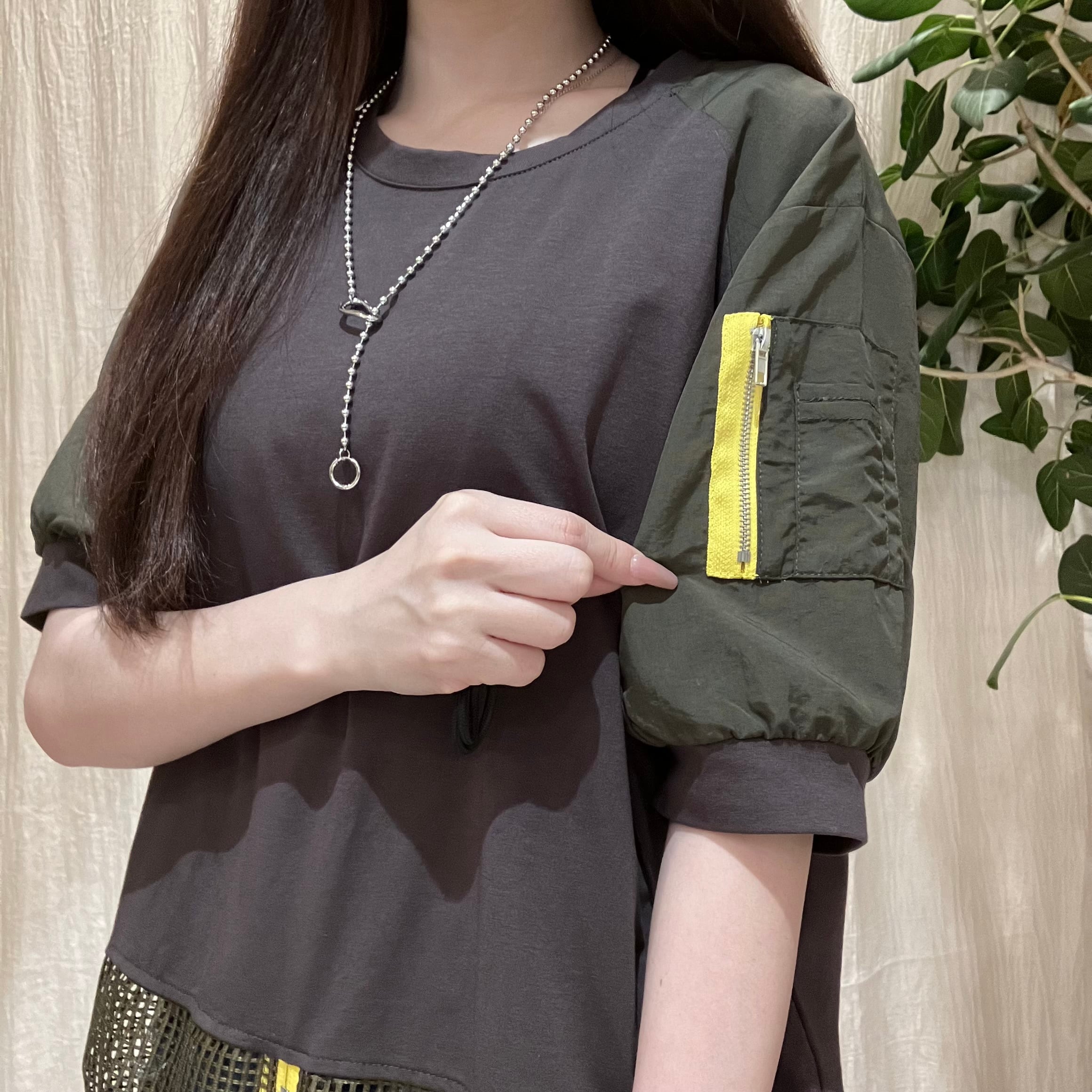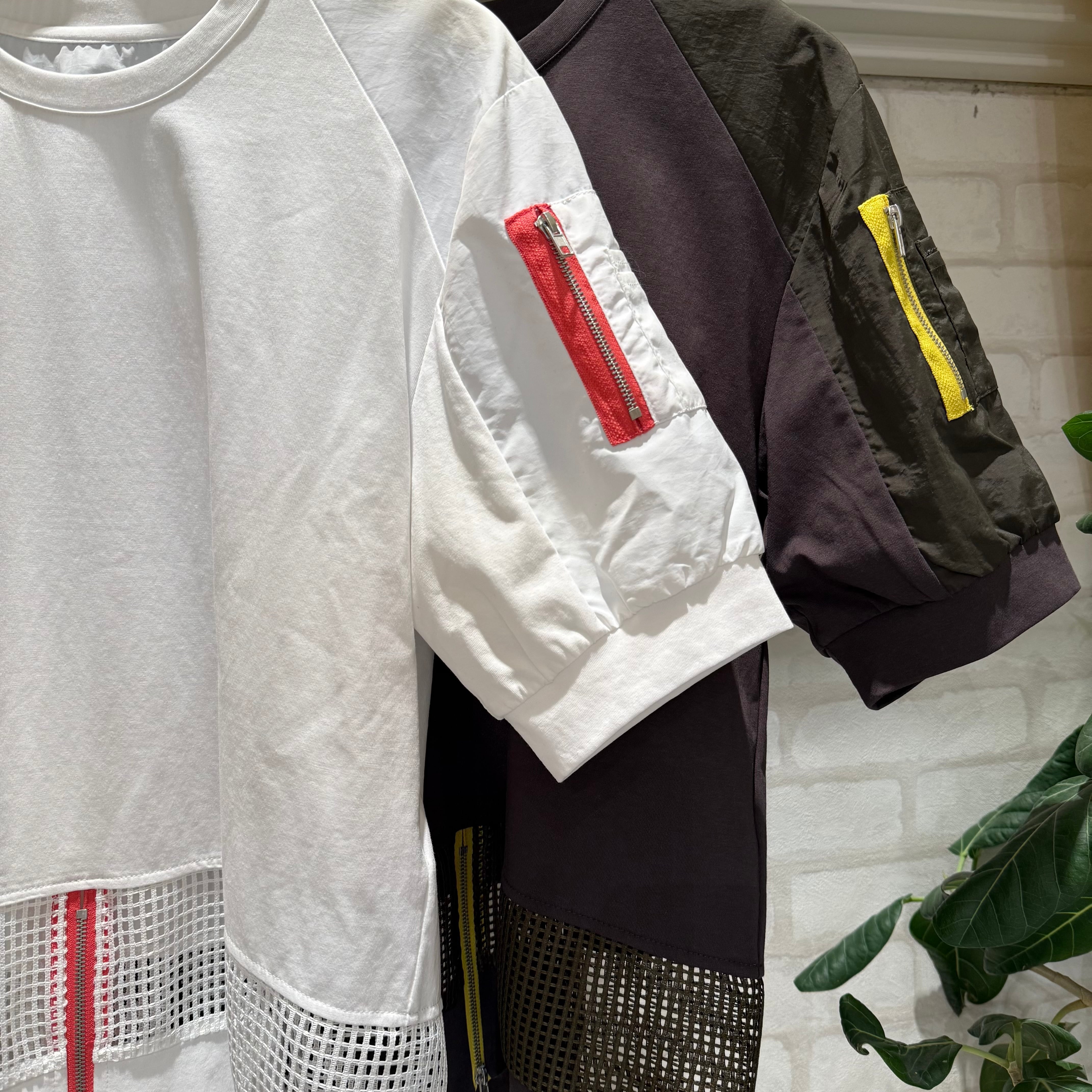 スポーティーなメッシュ切り替えと鮮やかなジップが目を引くデザイントップスです。