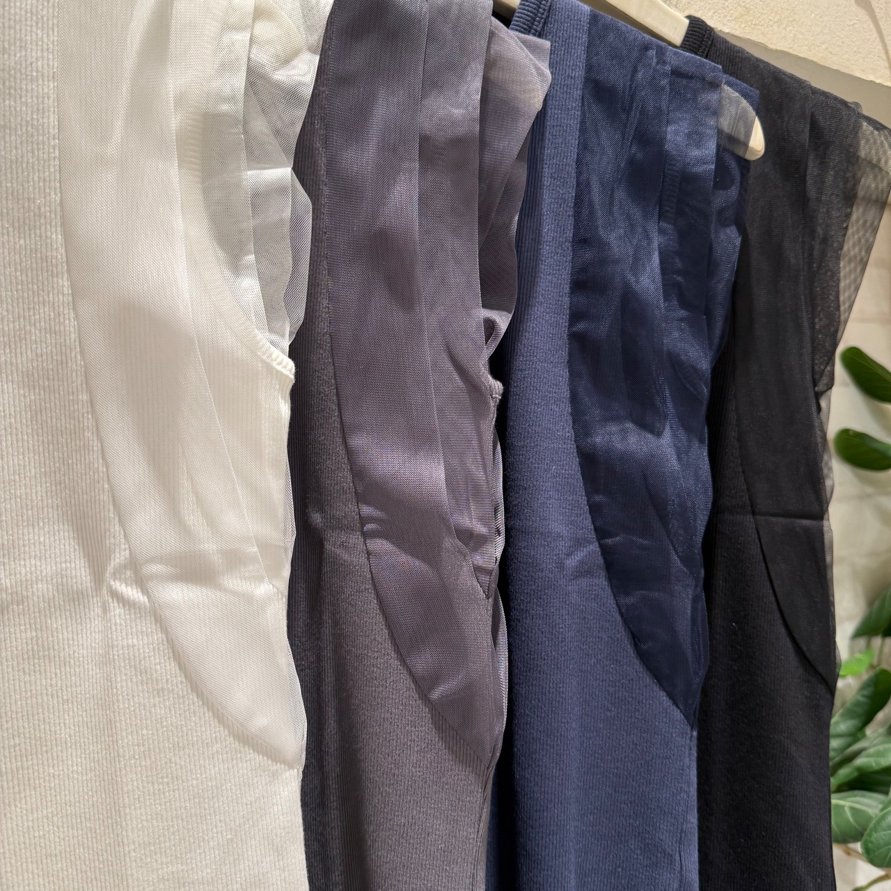 肩部分のチュールデザインが女性らしさを引き立て、軽やかな印象を与えます。