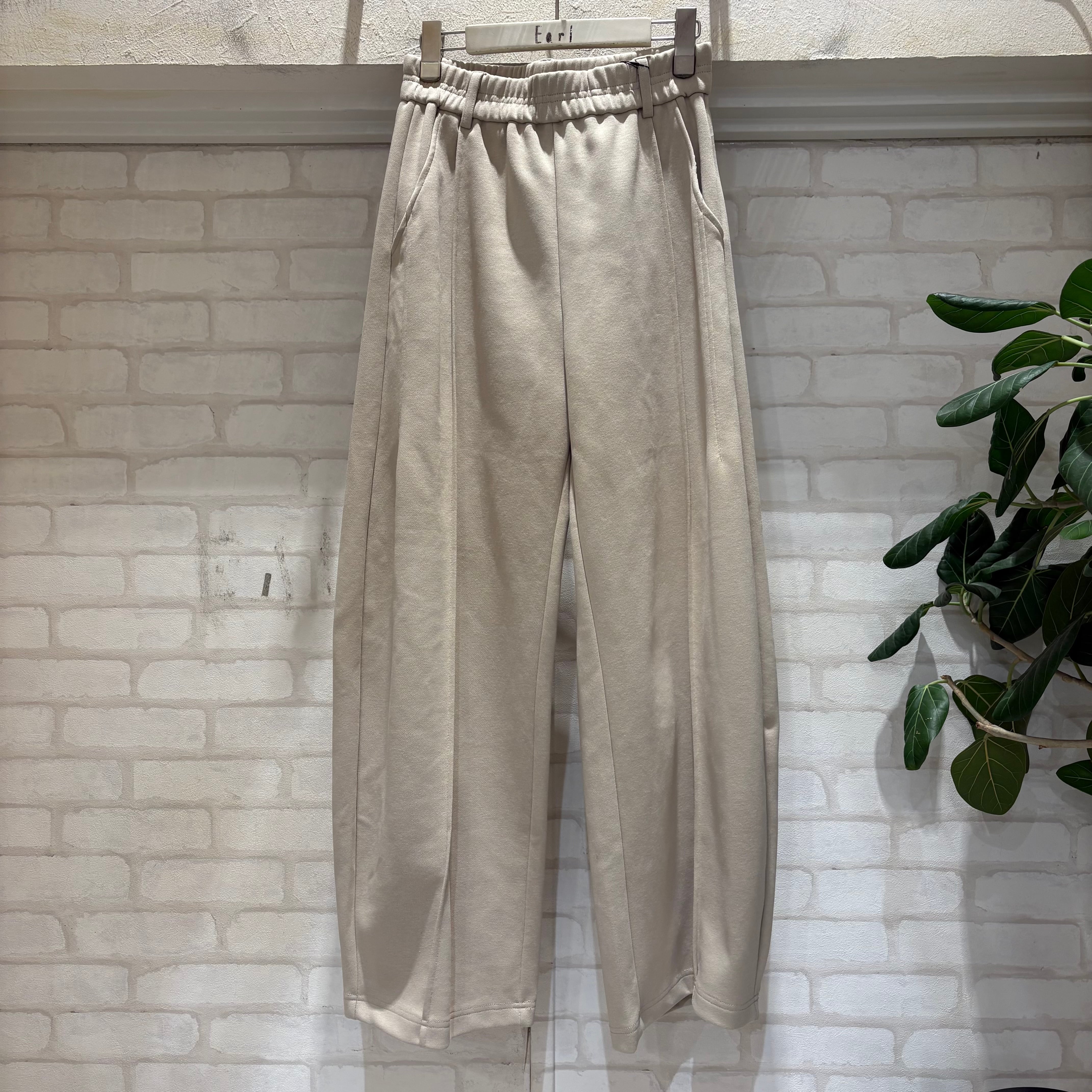 綺麗なカーブシルエットのスウェットパンツ。