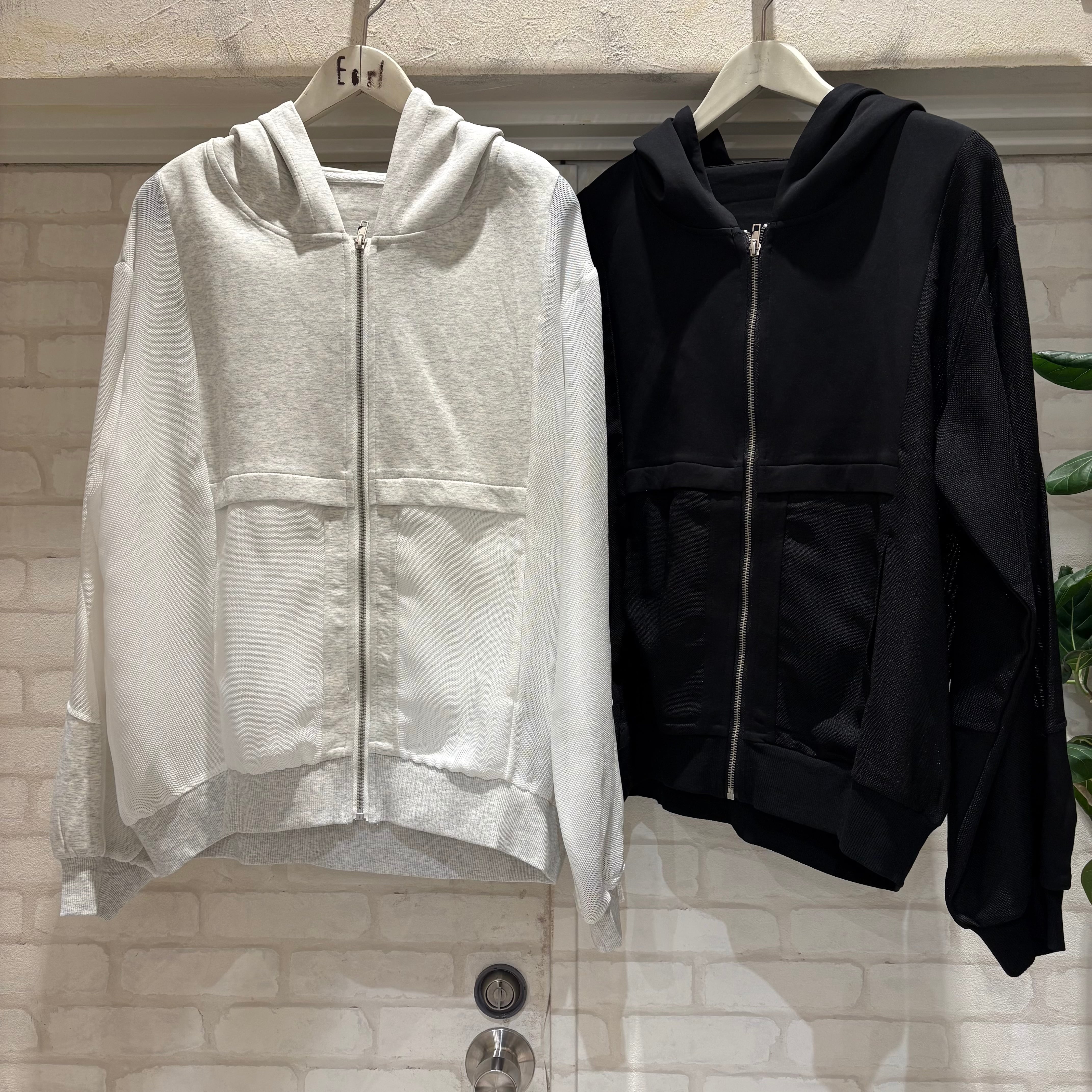 異素材の切替デザインがポイントのフーディー