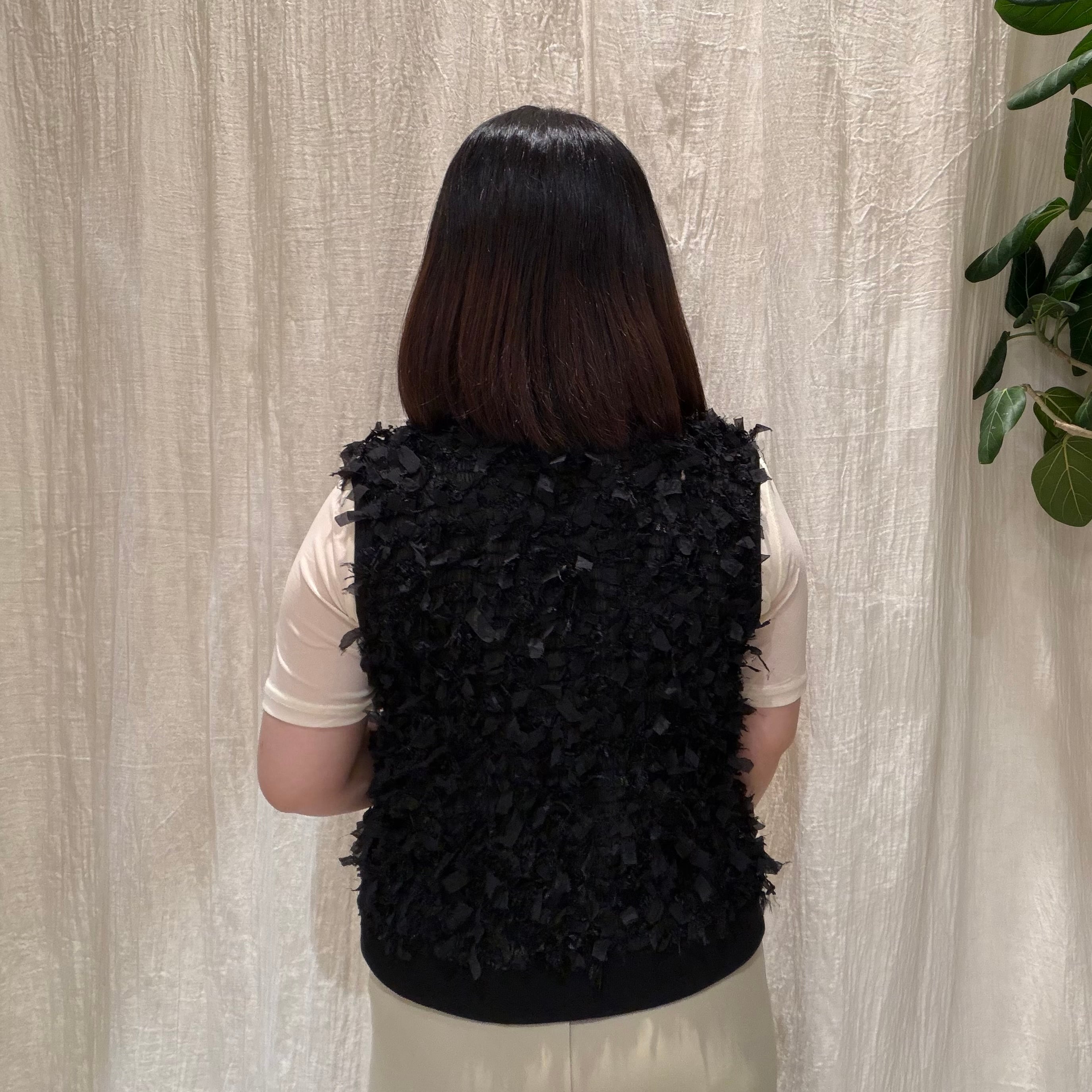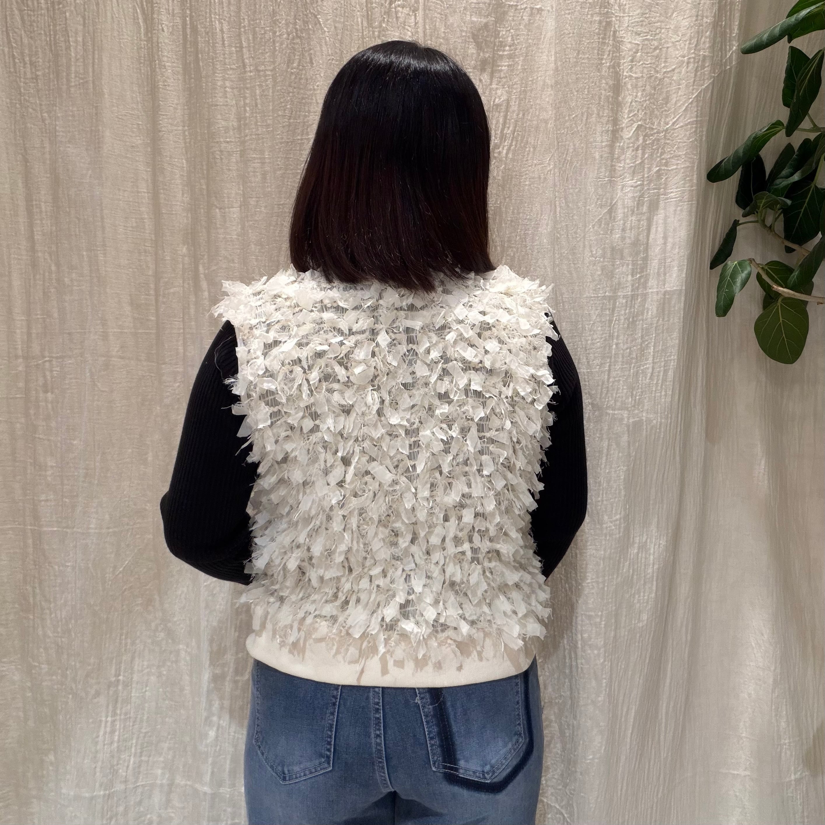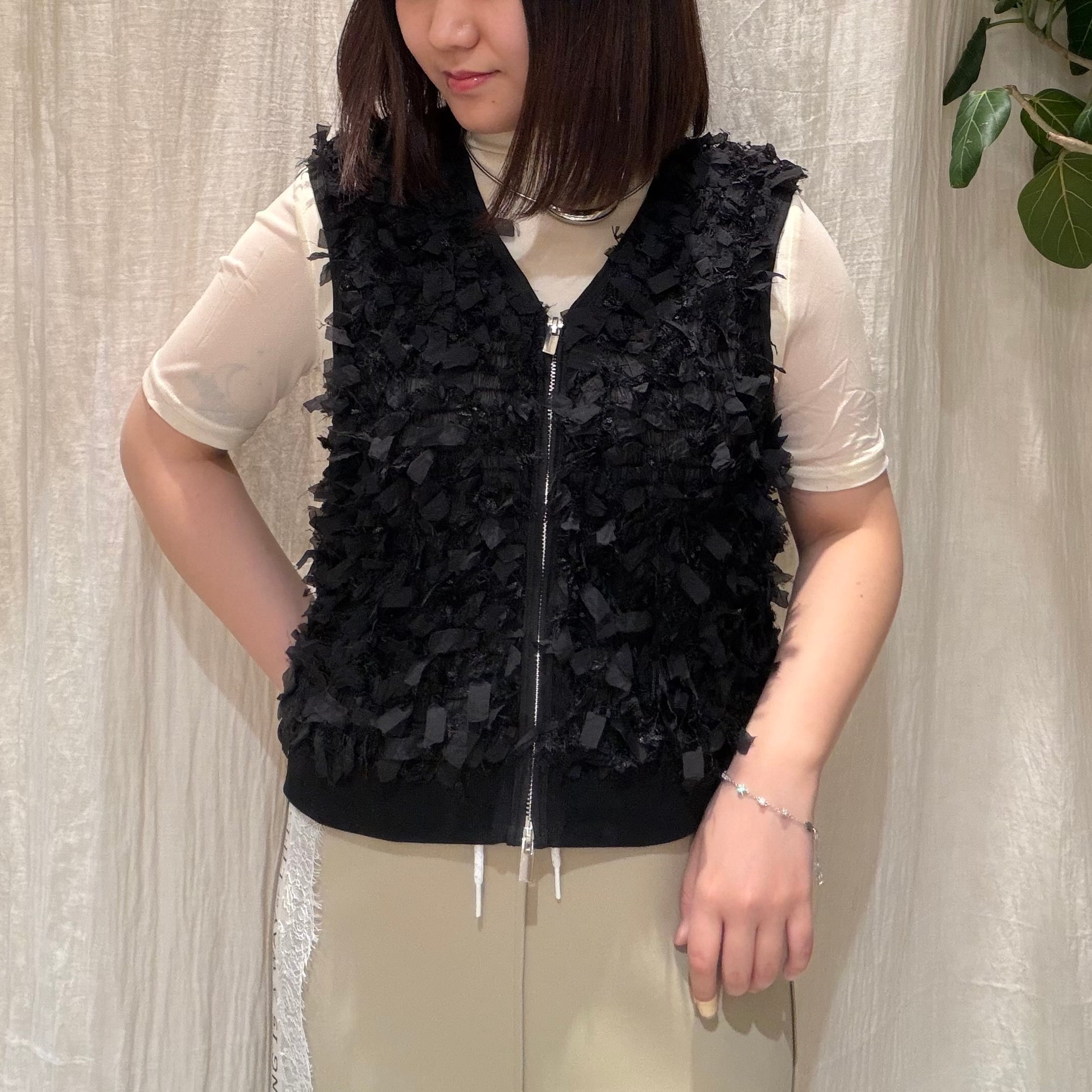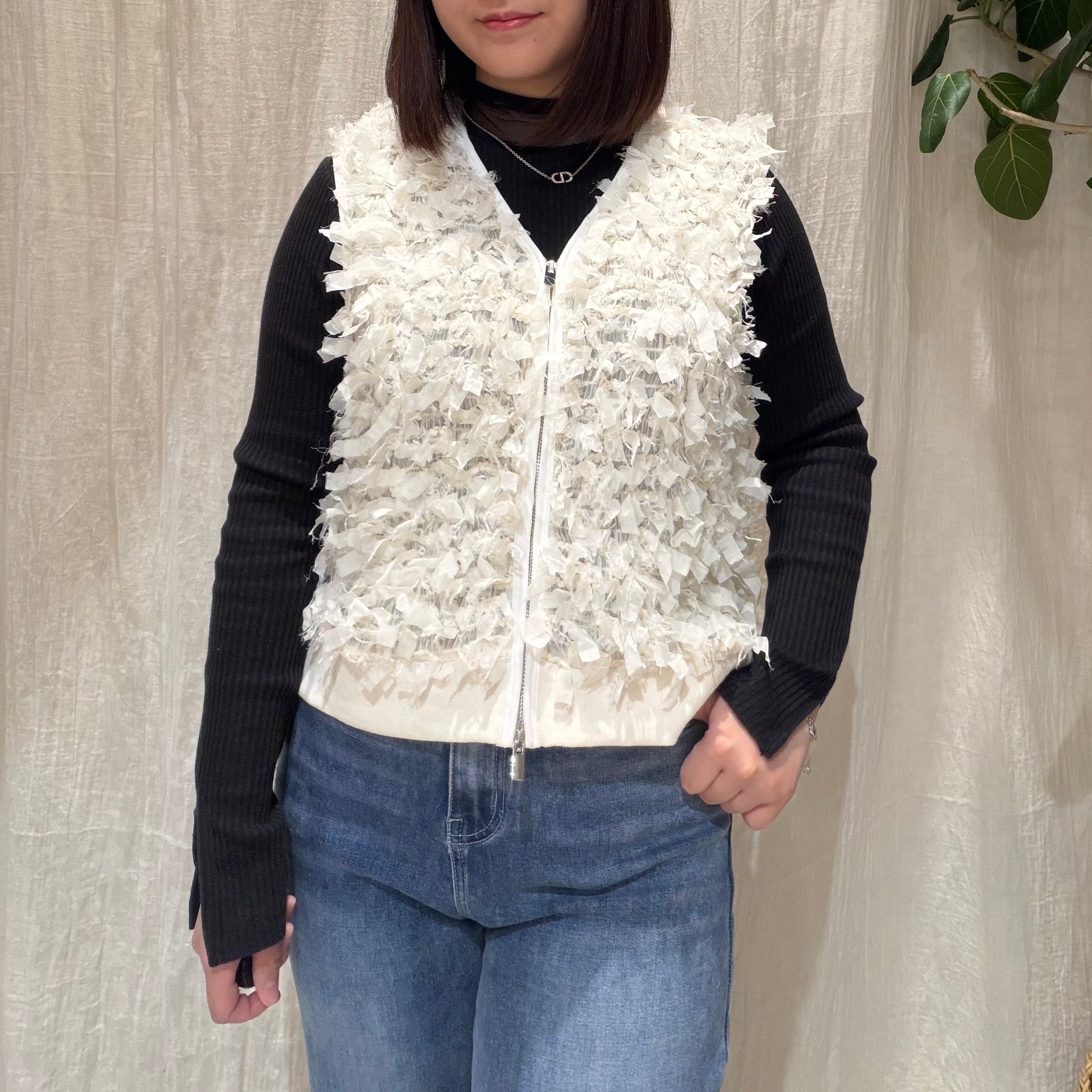リボンフリンジが目を惹く、トレンド感たっぷりのジップベスト。