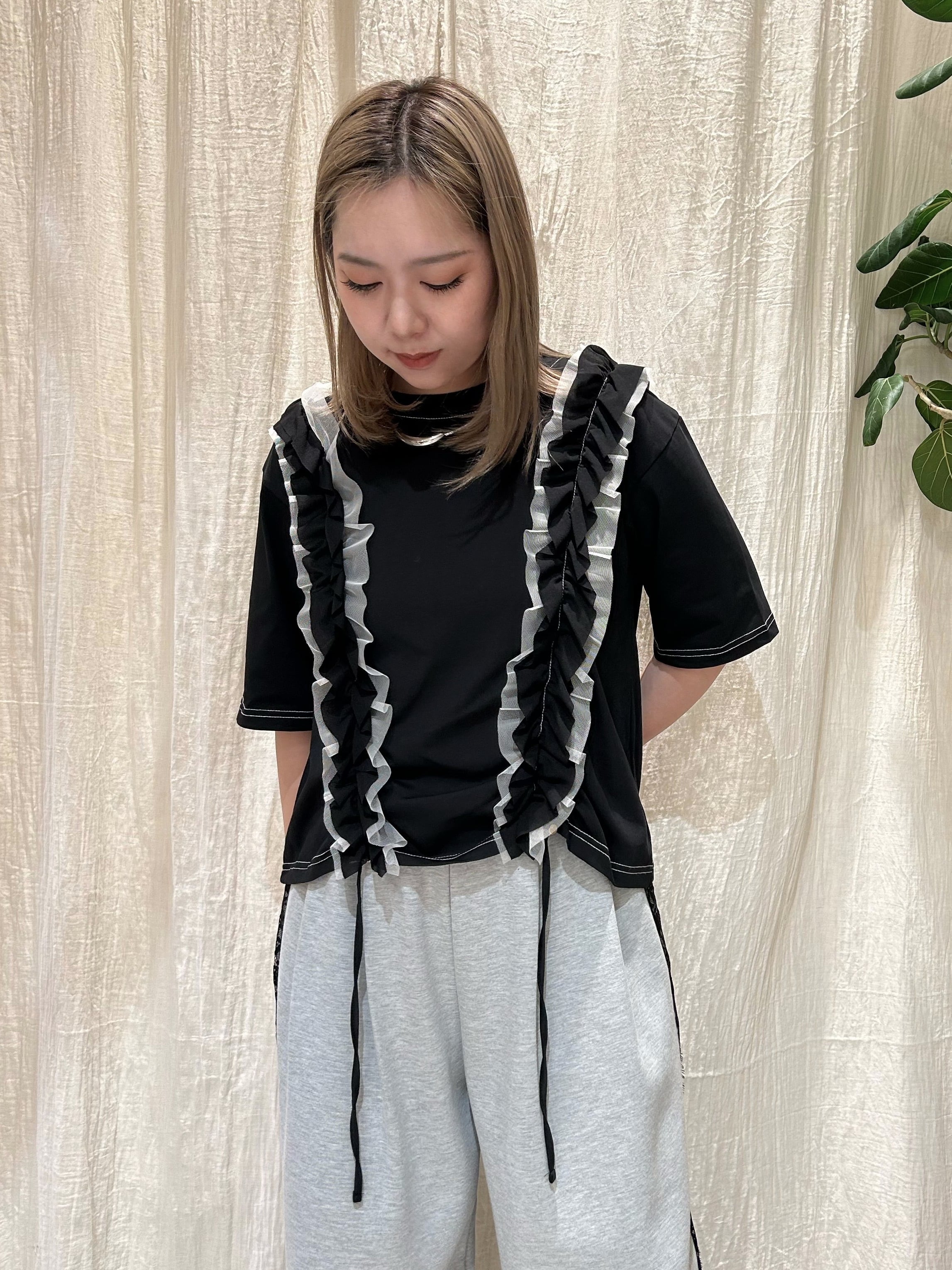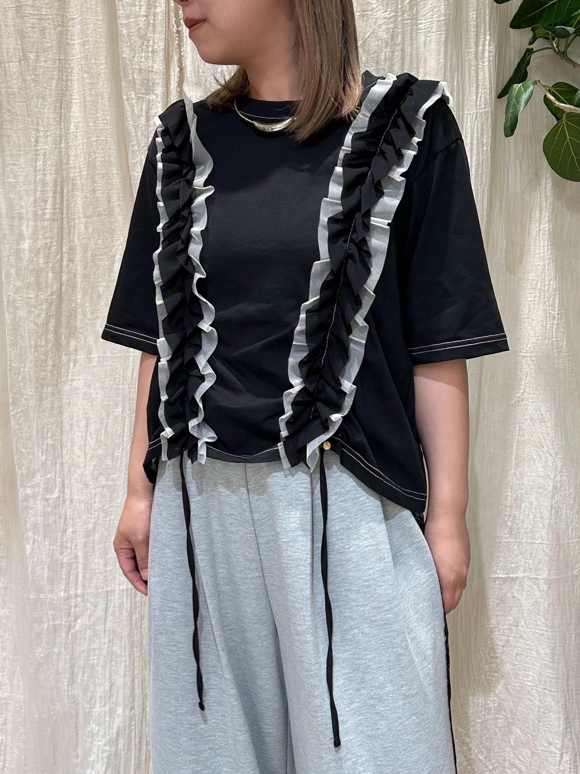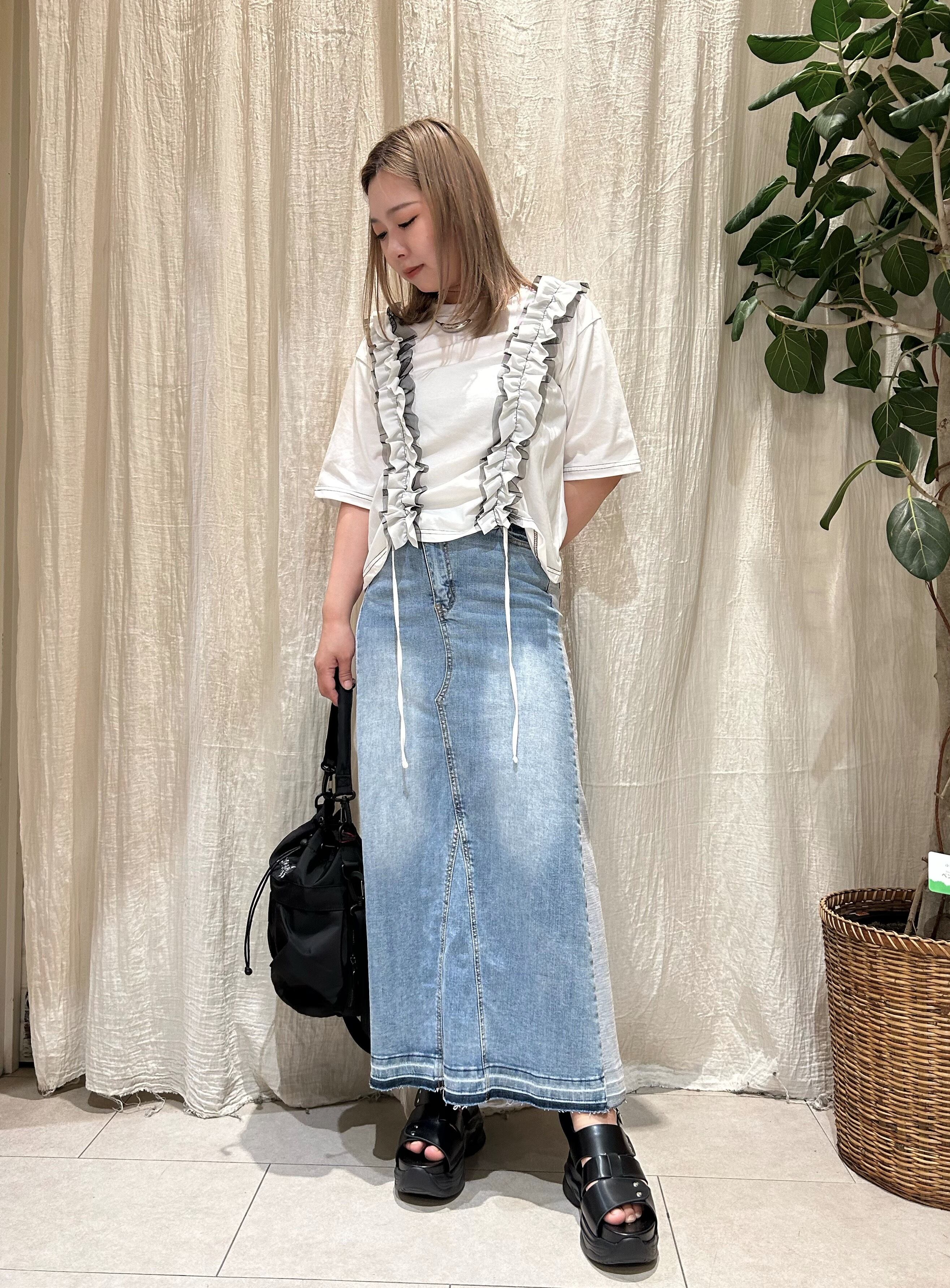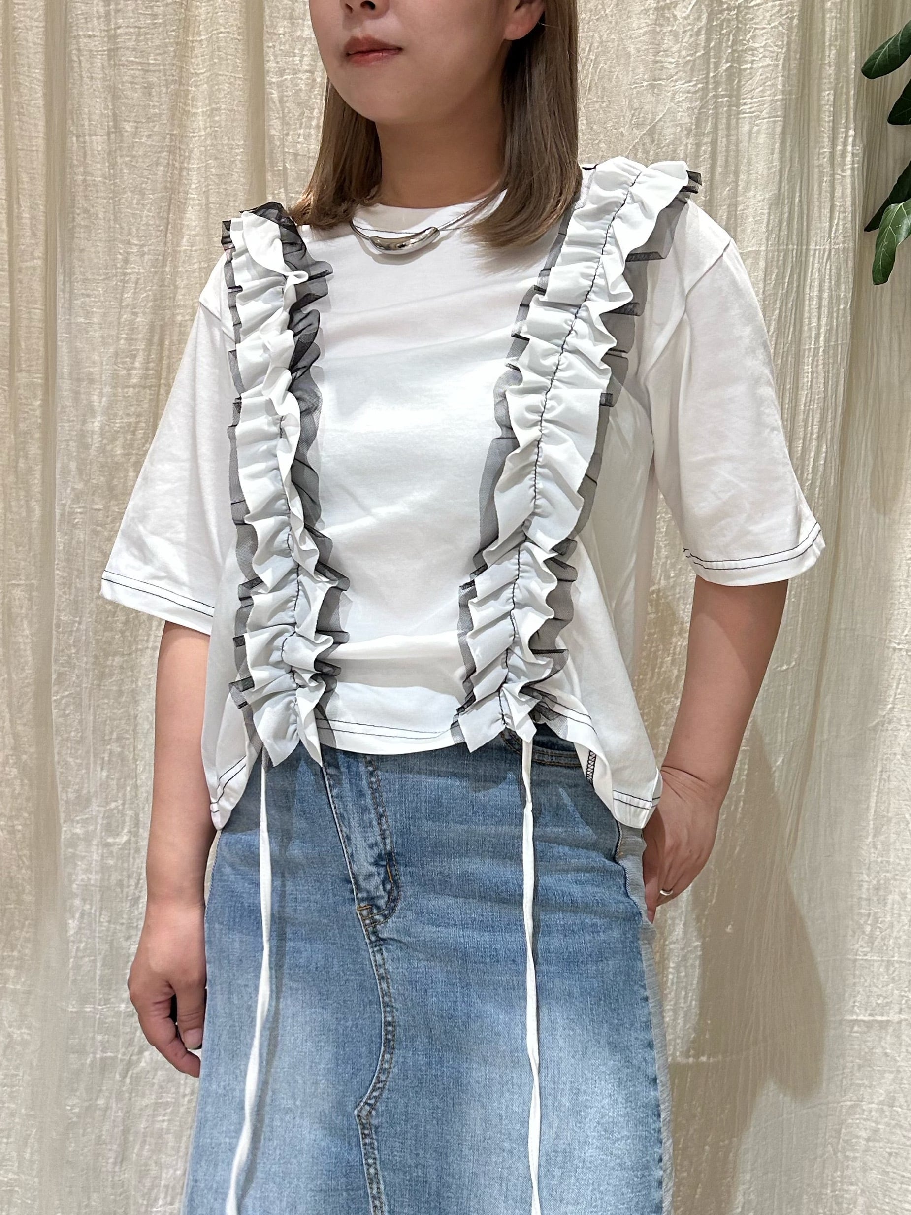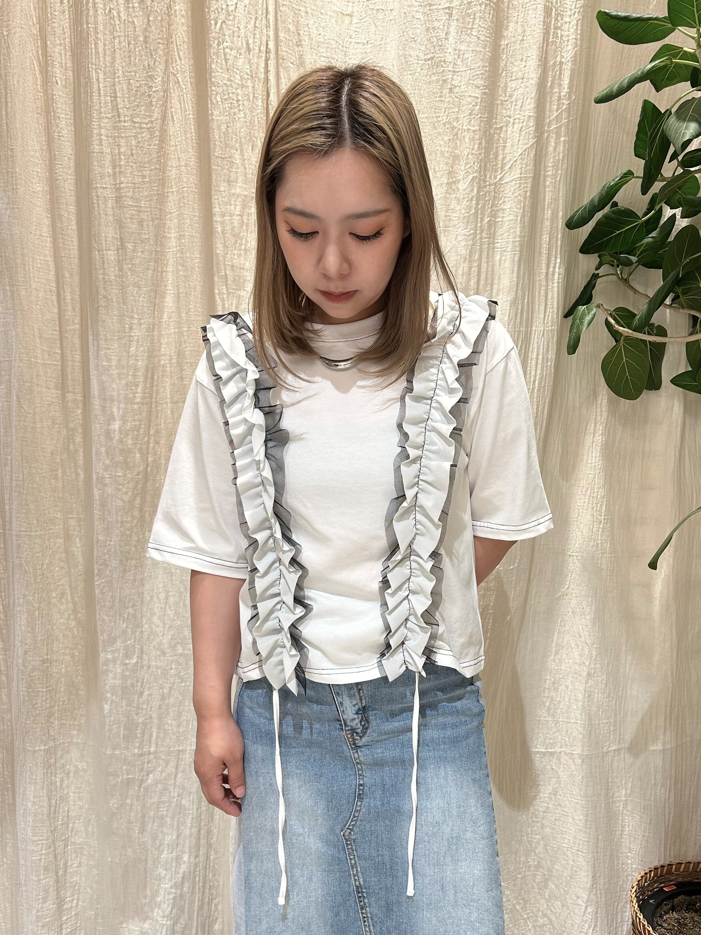 イージーなTシャツに軽やかなフリルをONすることで、涼しさもありながら一気に華やかで着映え感を感じる1着です。