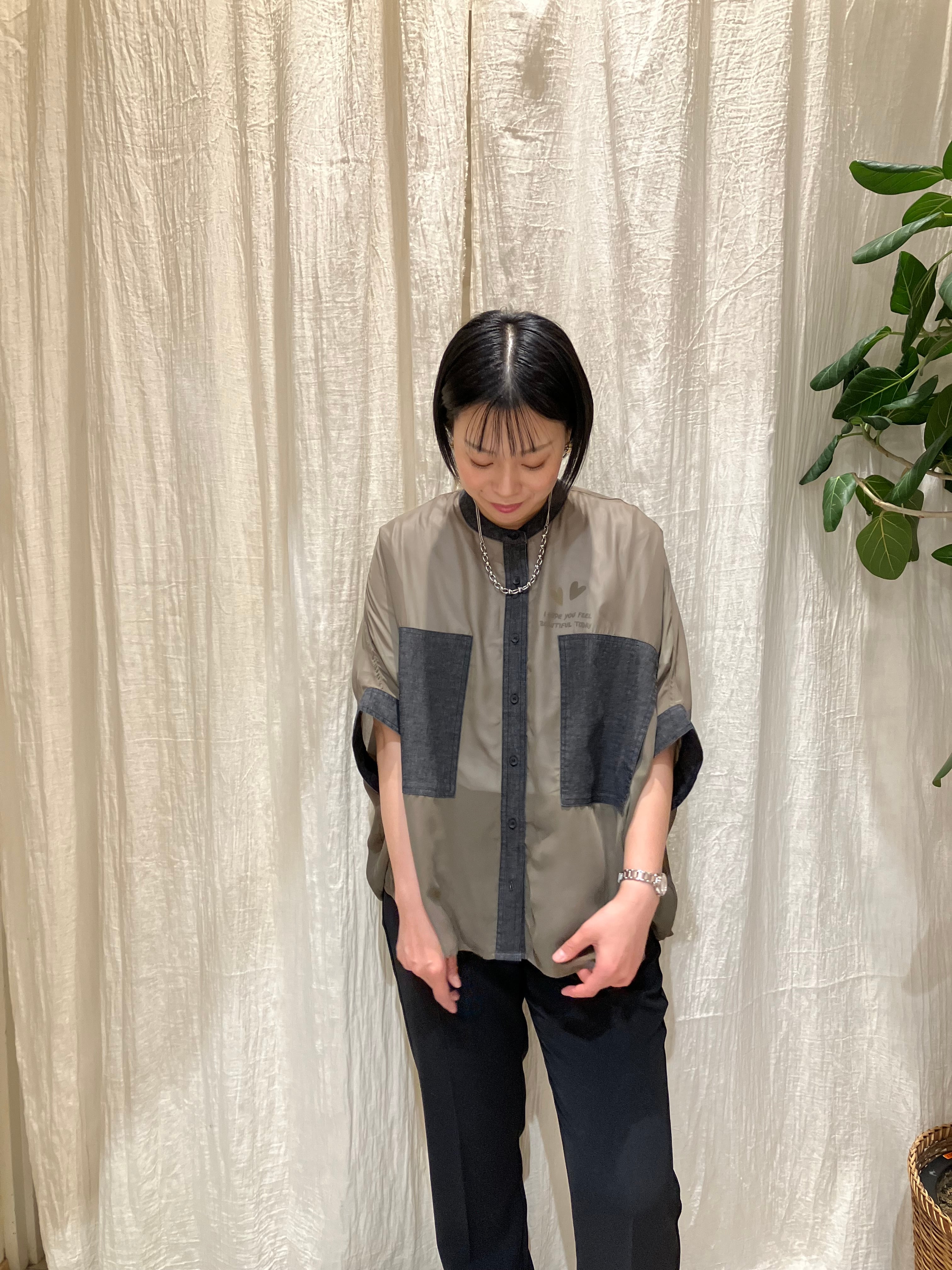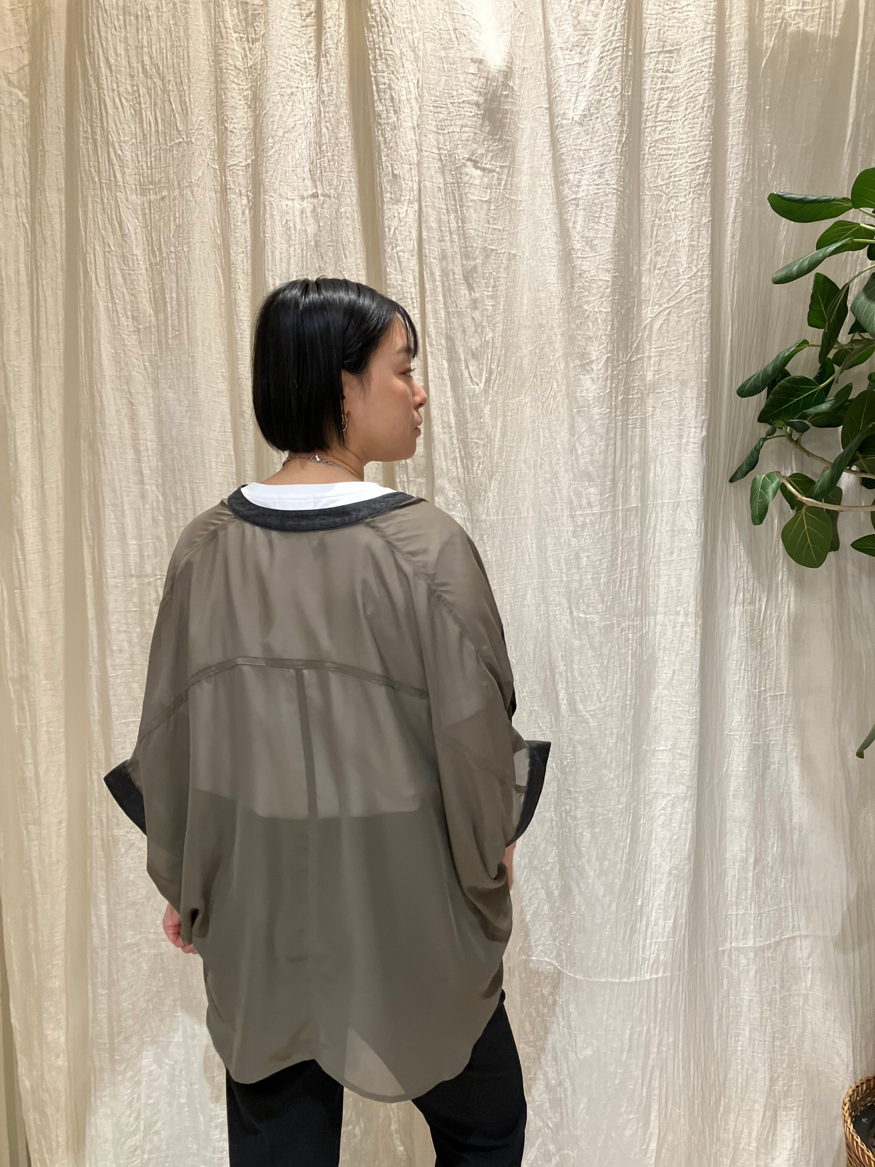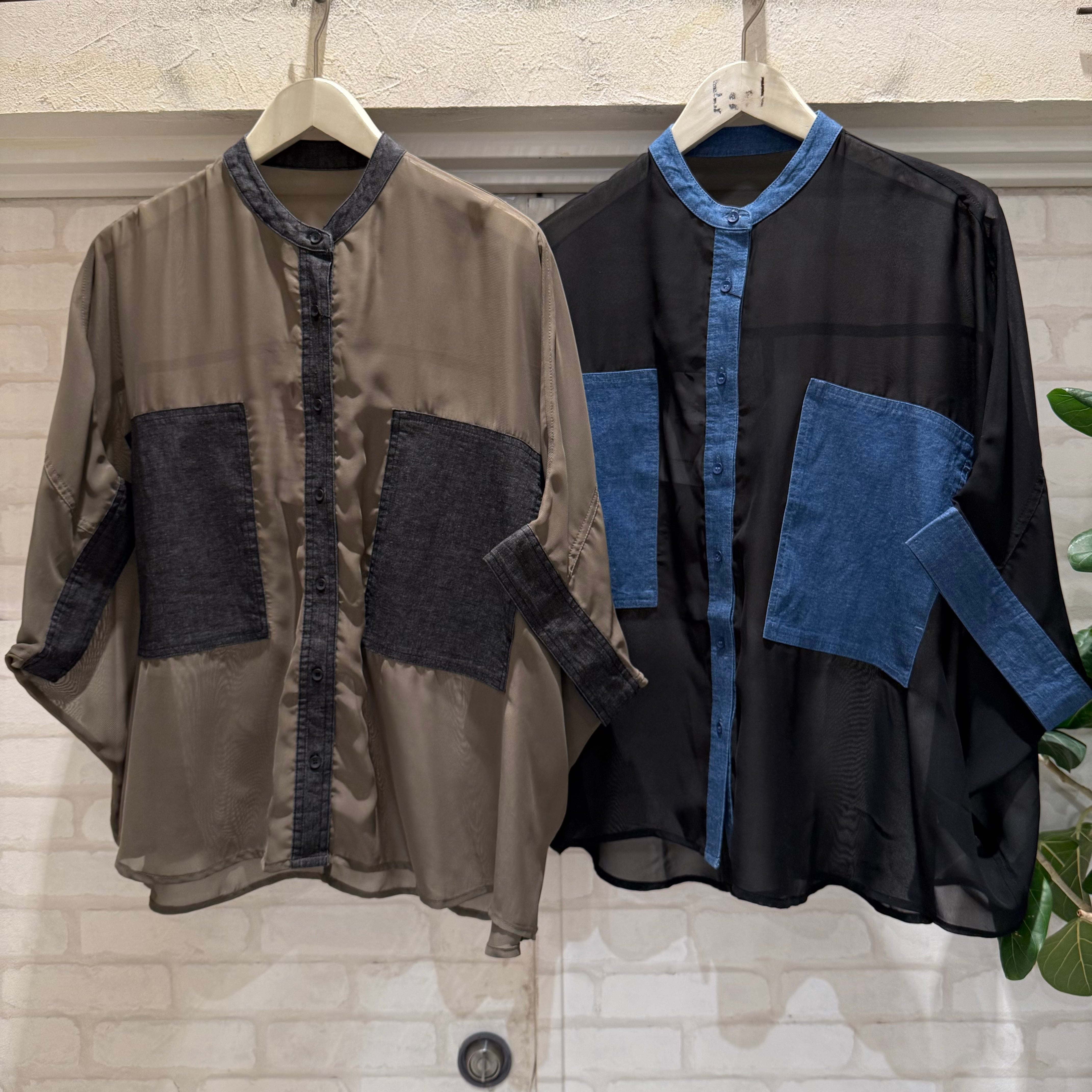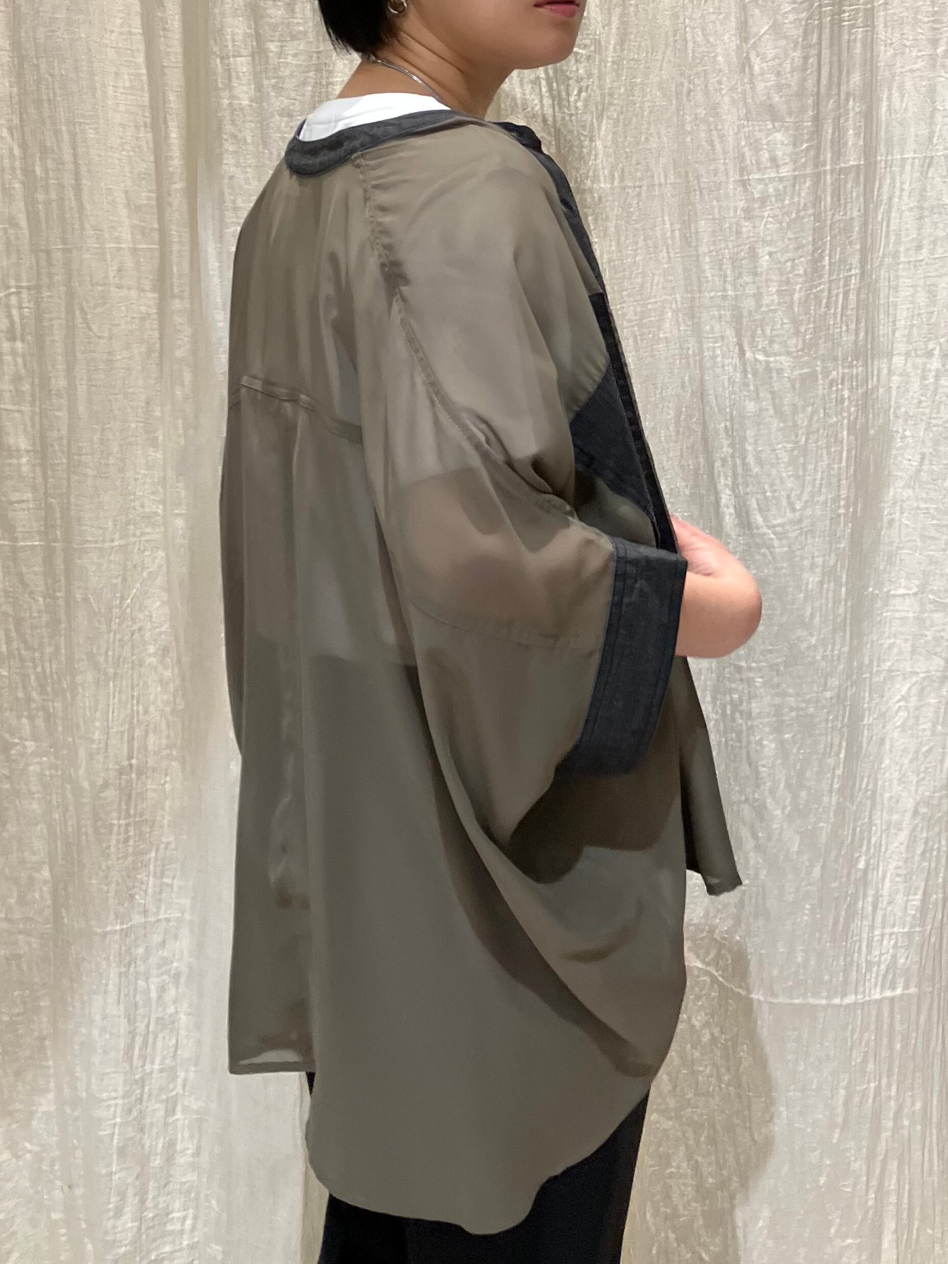 軽やかでさらっとした着心地のシアー素材は、季節の変わり目にもぴったり。ゆったりとしたシルエットで、羽織りとしても活躍します。フロントや襟部分にもデニム素材をあしらい、細部までこだわりのあるデザインに。