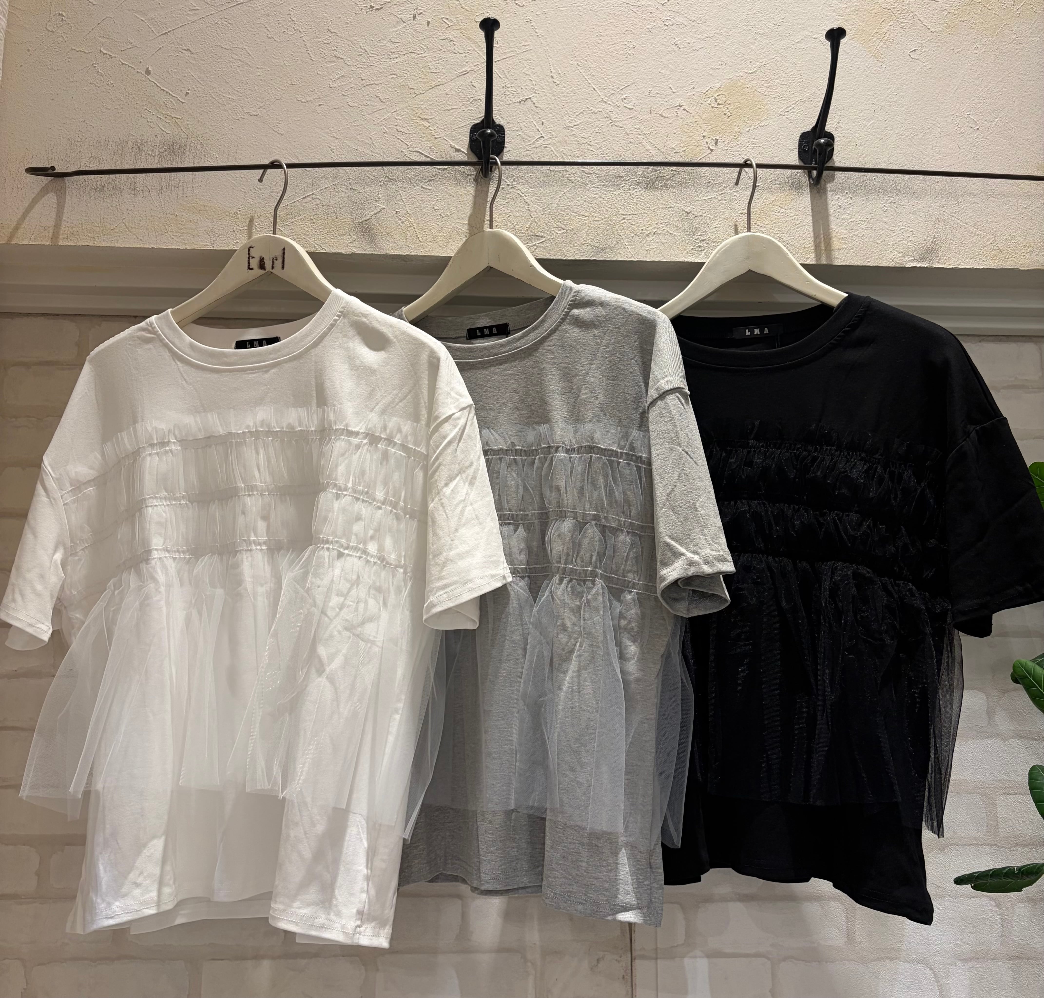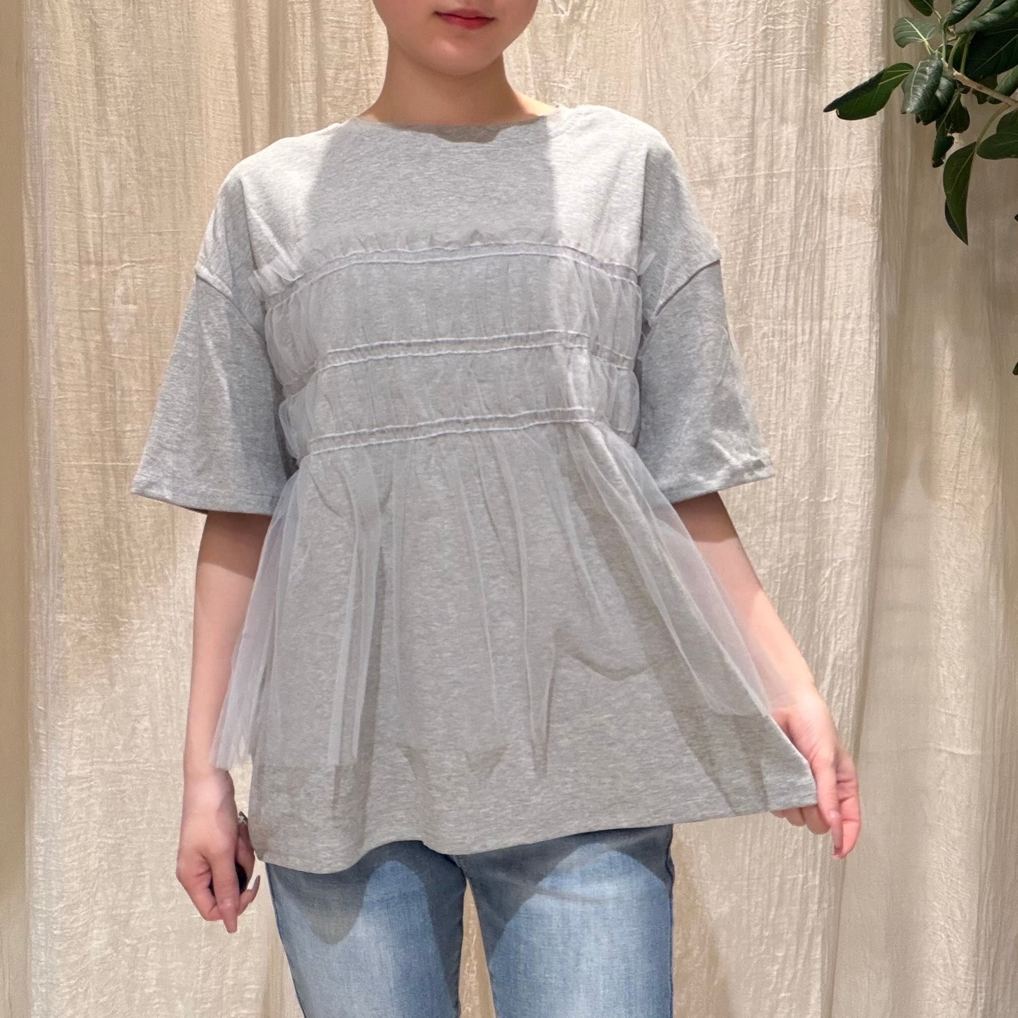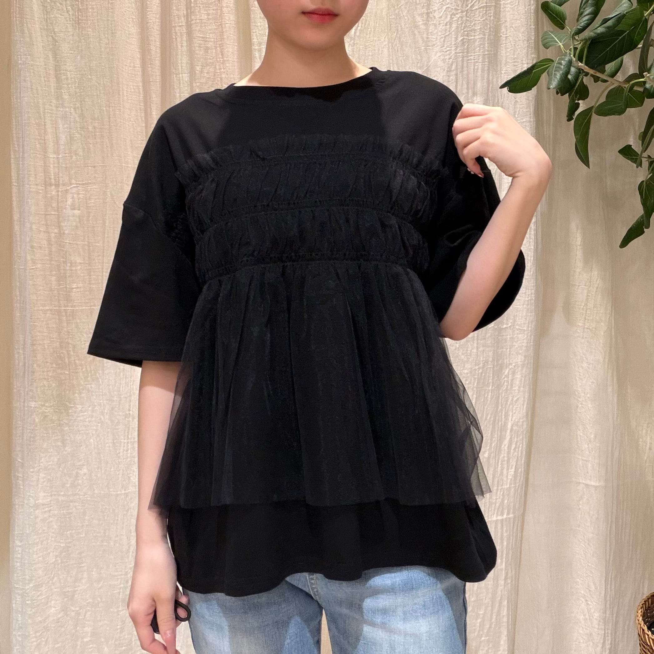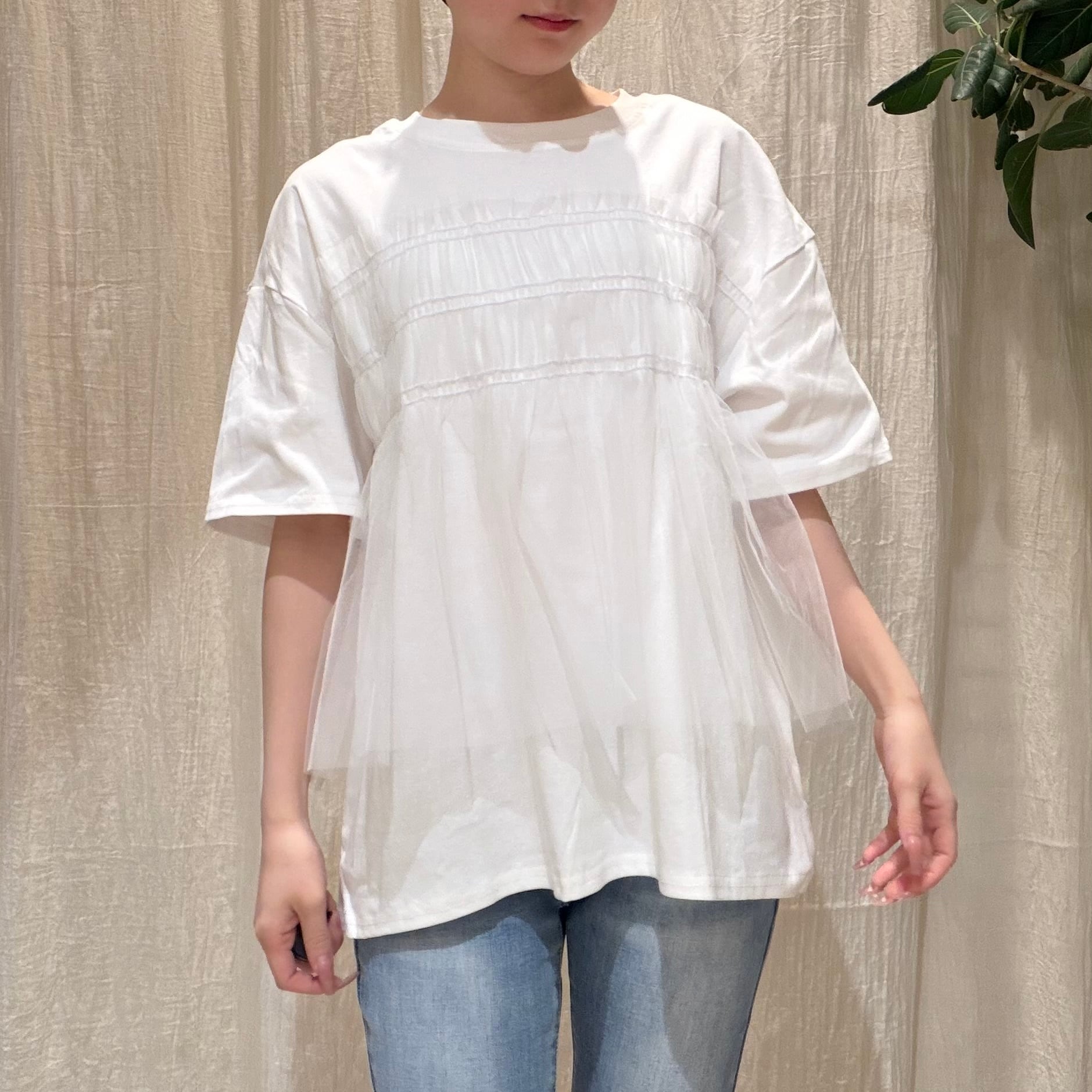 シンプルなTシャツにチュールをプラスすることでカジュアルな印象の中にも女性らしさを感じれる1枚です。