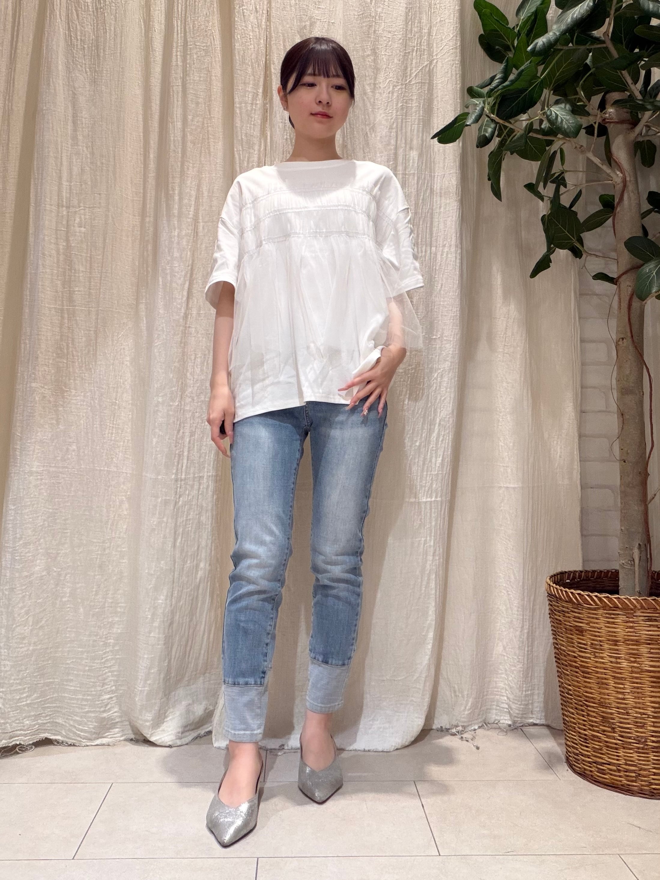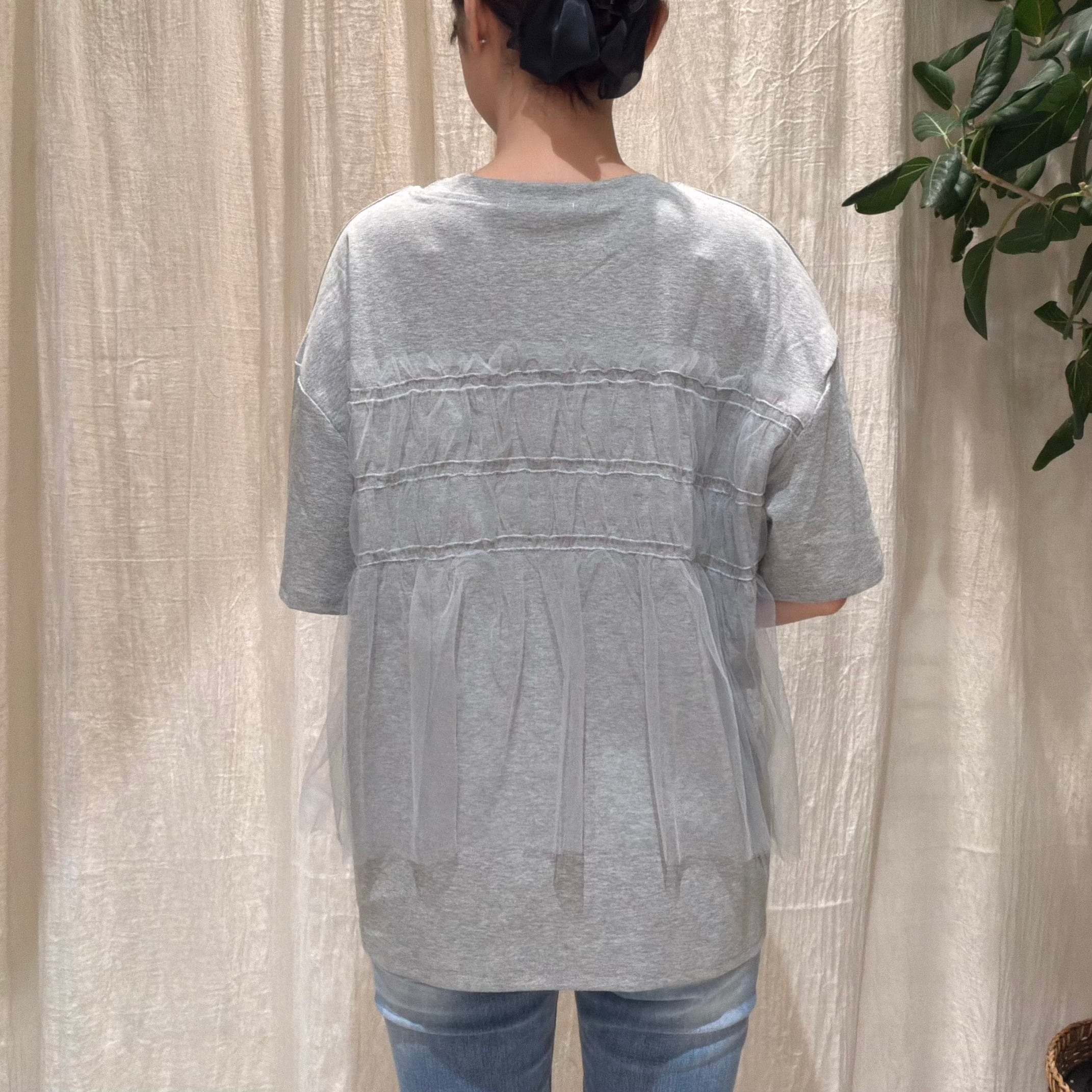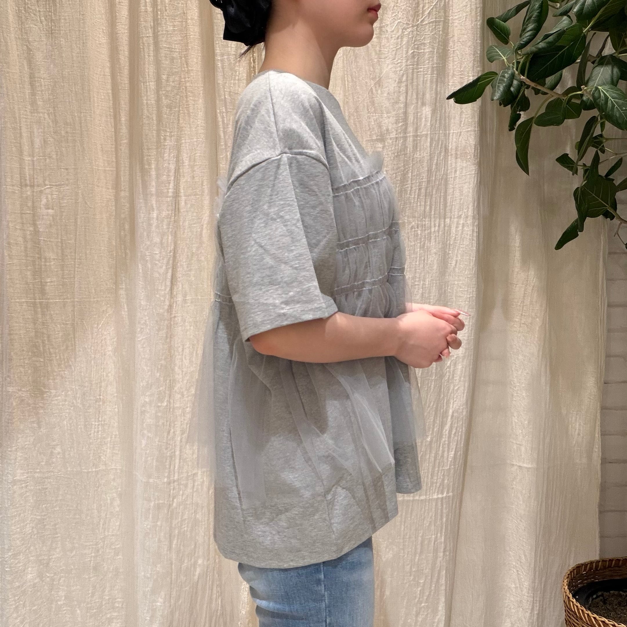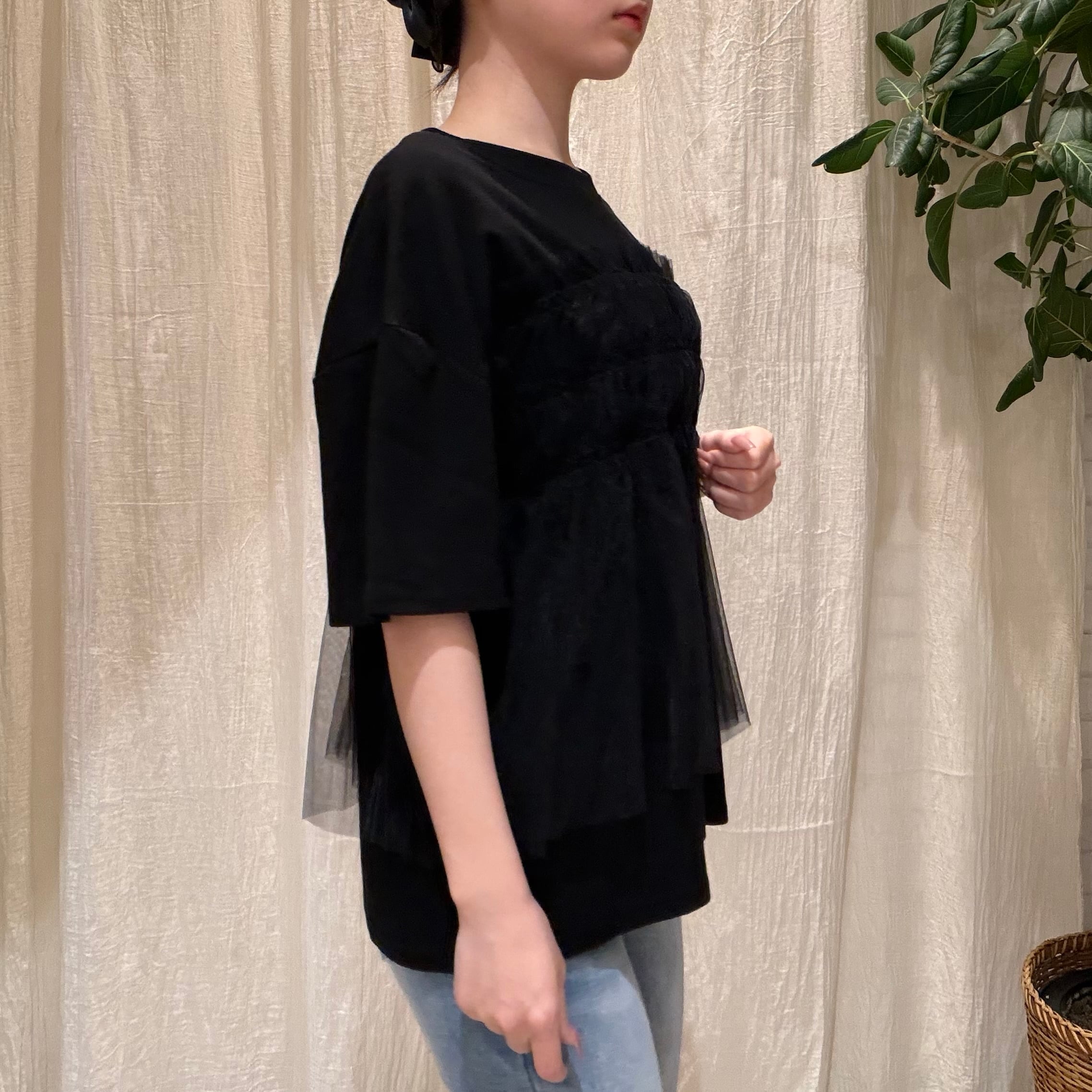 シンプルなTシャツにチュールをプラスすることでカジュアルな印象の中にも女性らしさを感じれる1枚です。