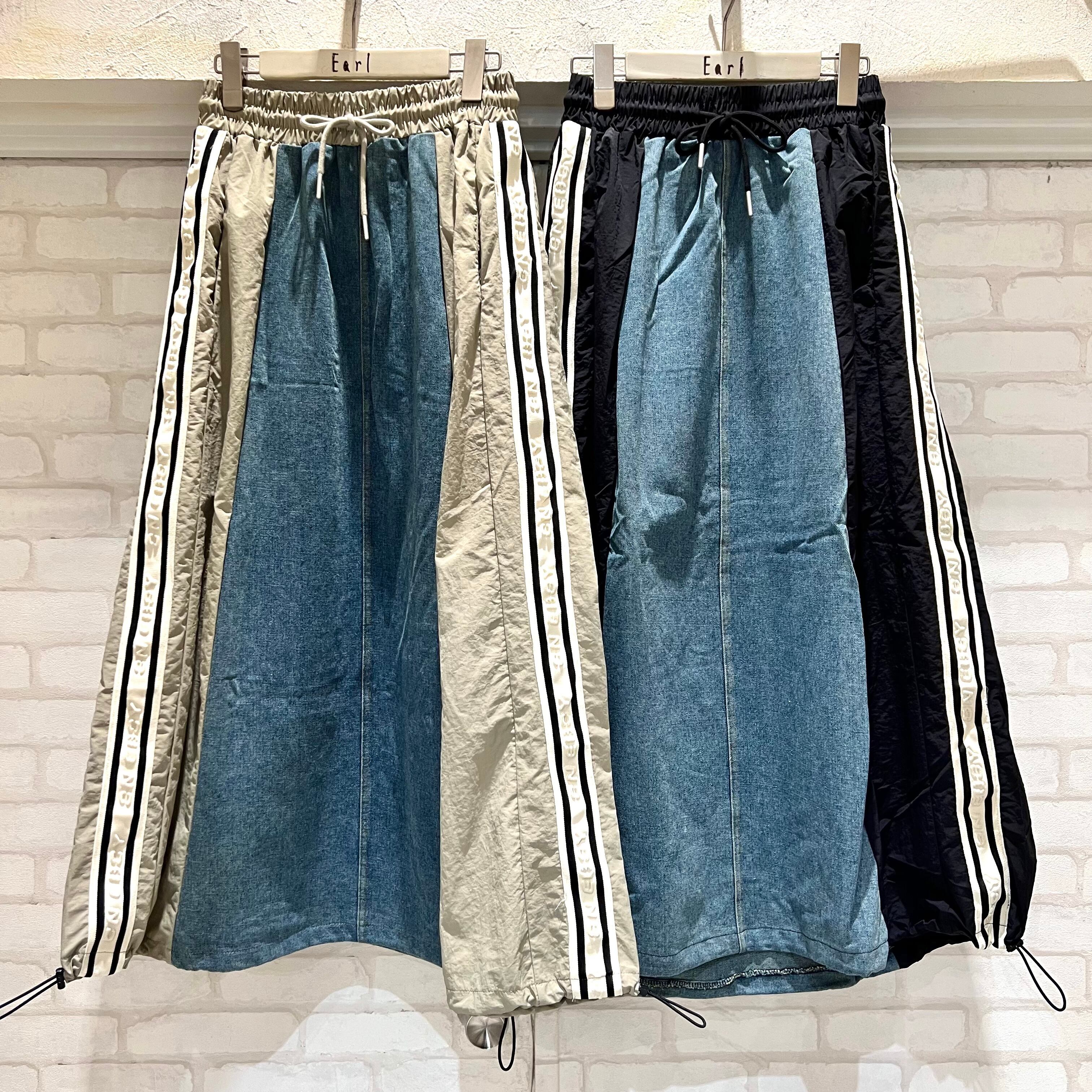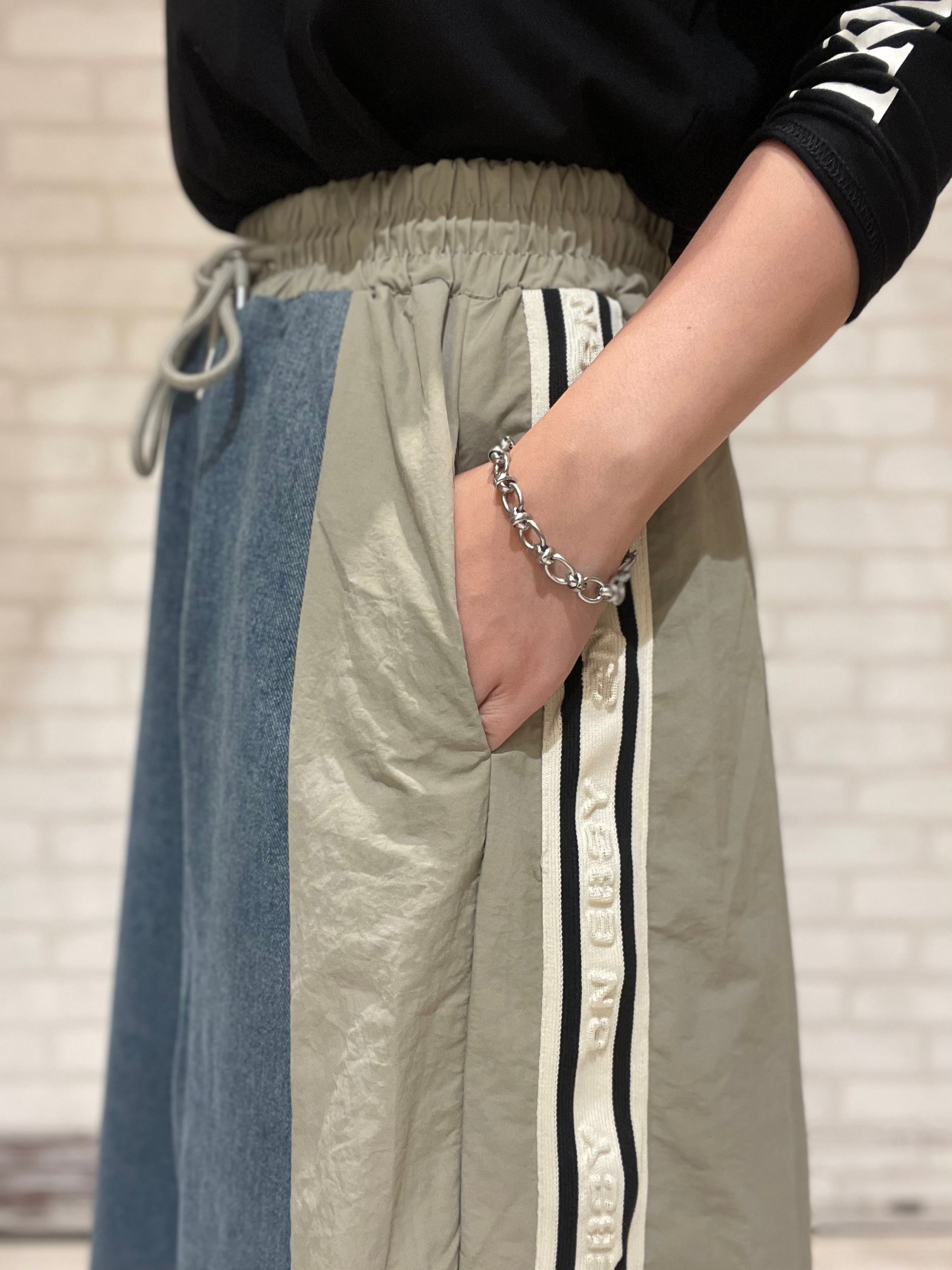 デニムとナイロンの異素材切り替えがお洒落なフレアスカート☆