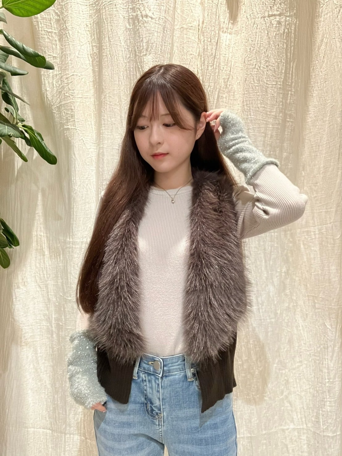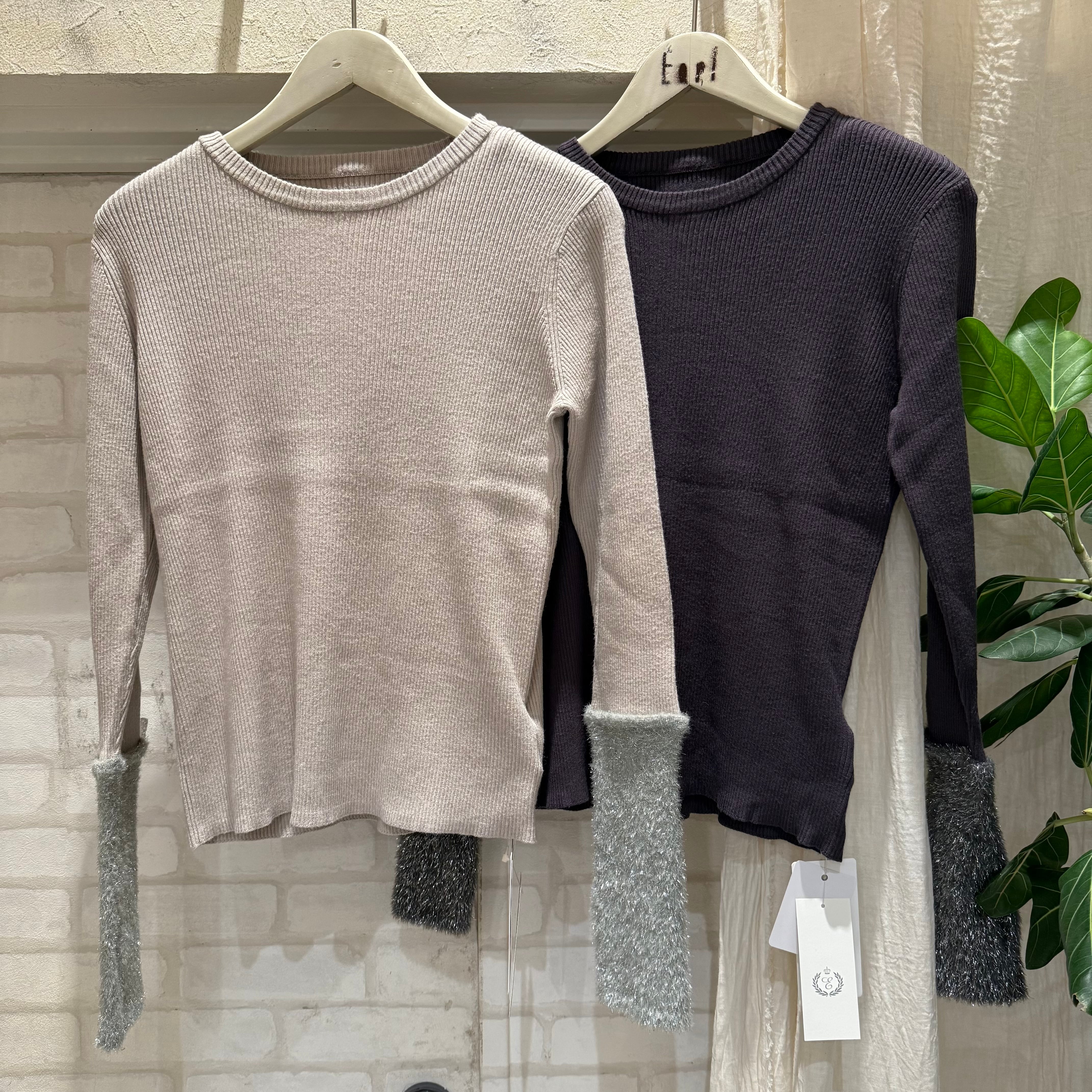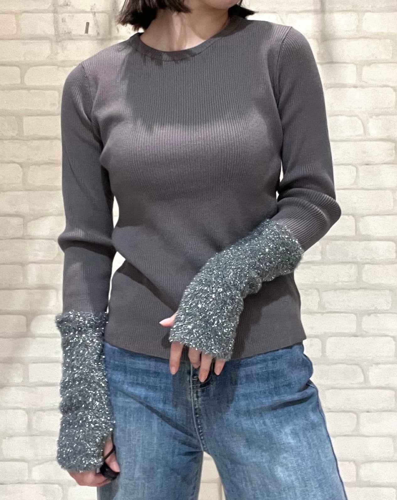 上品なラメ入りのシャギー素材を使用したアームウォーマーが特徴的なデザインです。シンプルなリブ編みのニット本体に、ふんわりとしたアーム部分がアクセントとなり、スタイリングに華やかさを加えます。カジュアルな装いにも、上品な雰囲気を保ちながら個性的なコーディネートが可能です。袖口が広がり、手元の表情を豊かに見せるデザインが魅力的です。