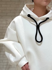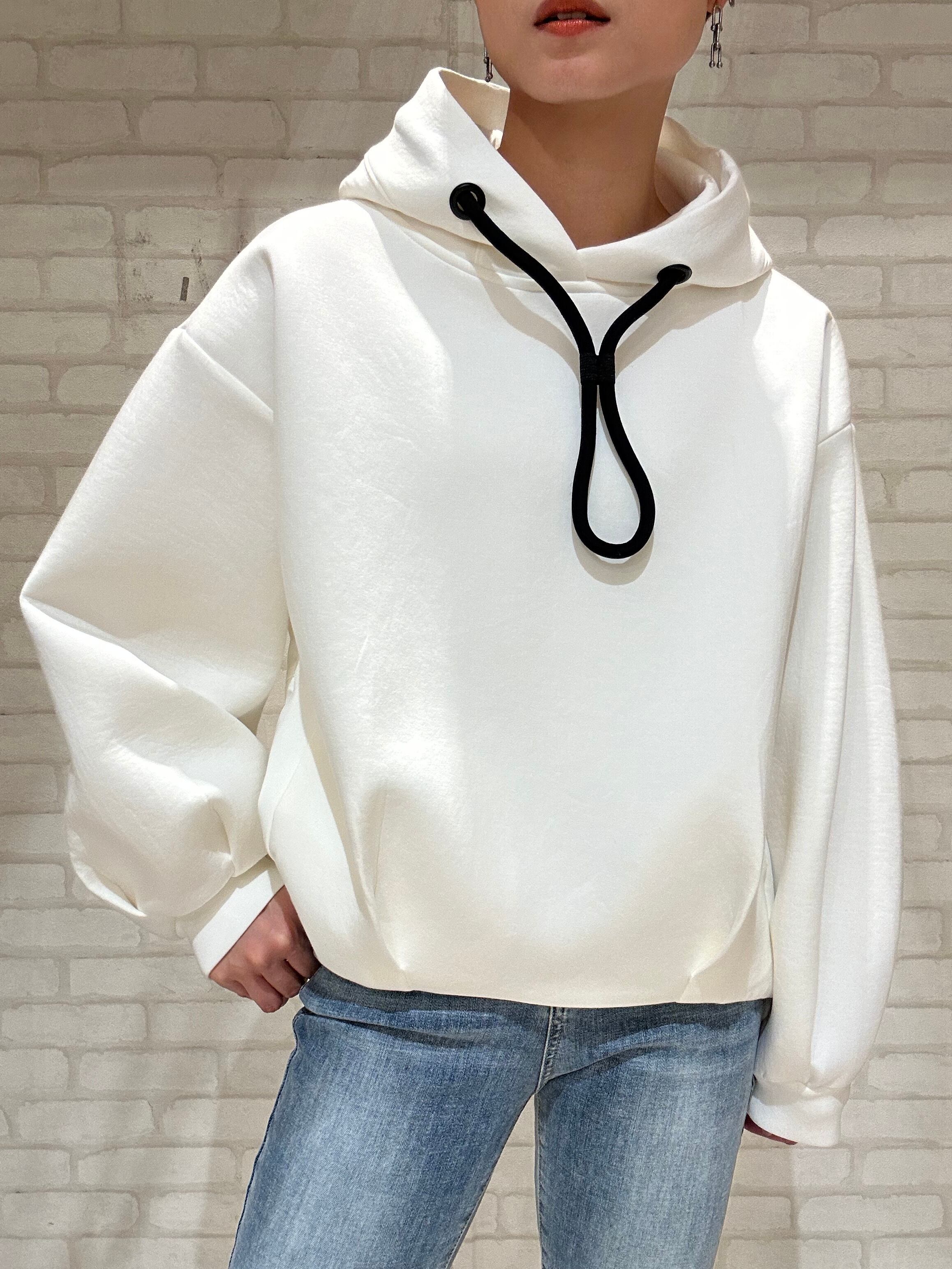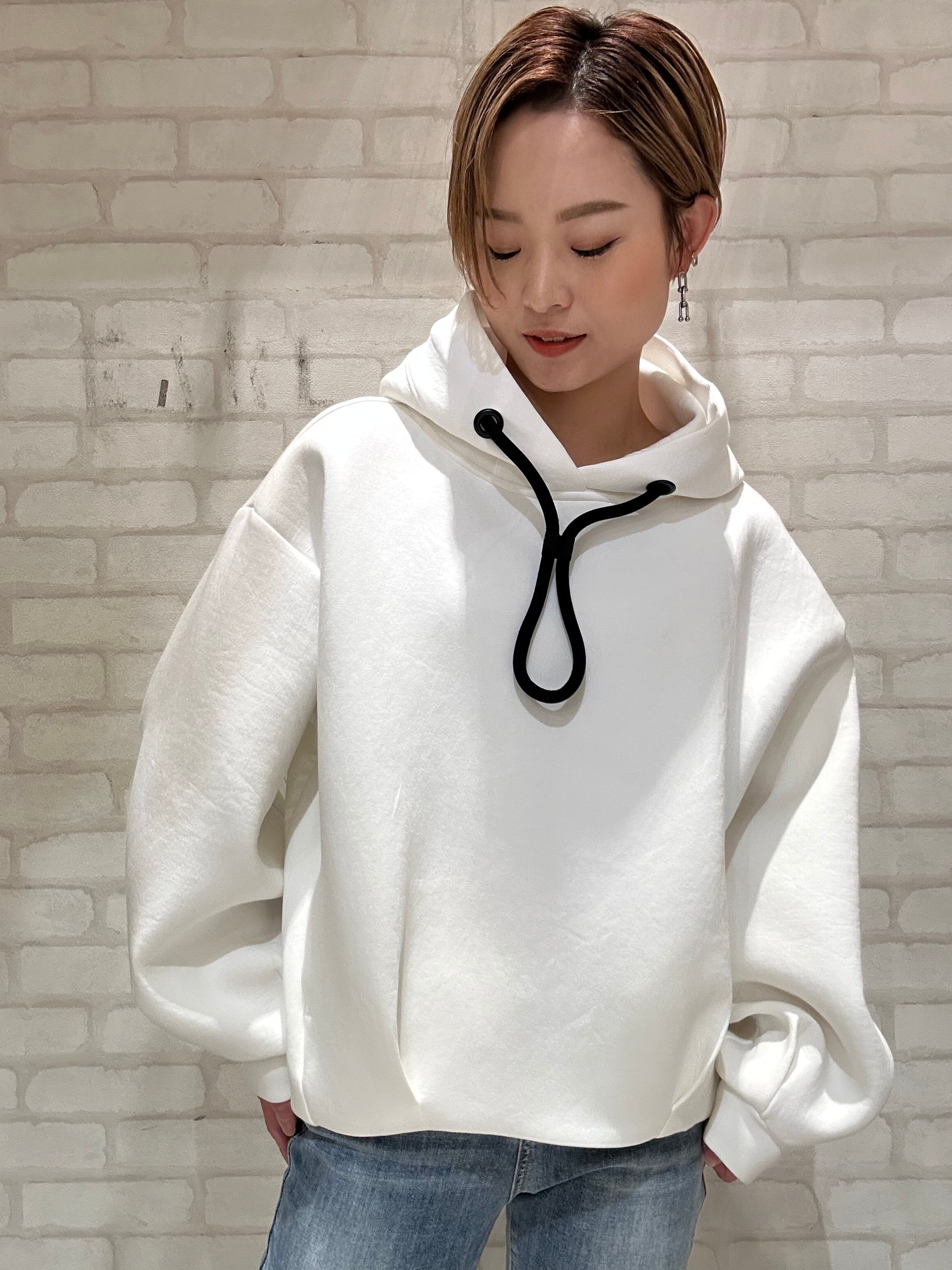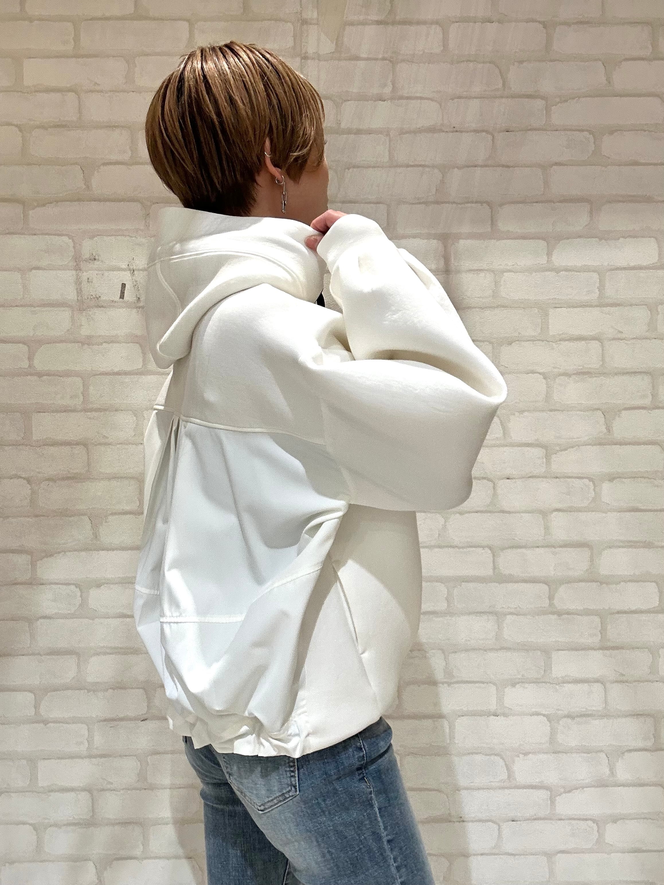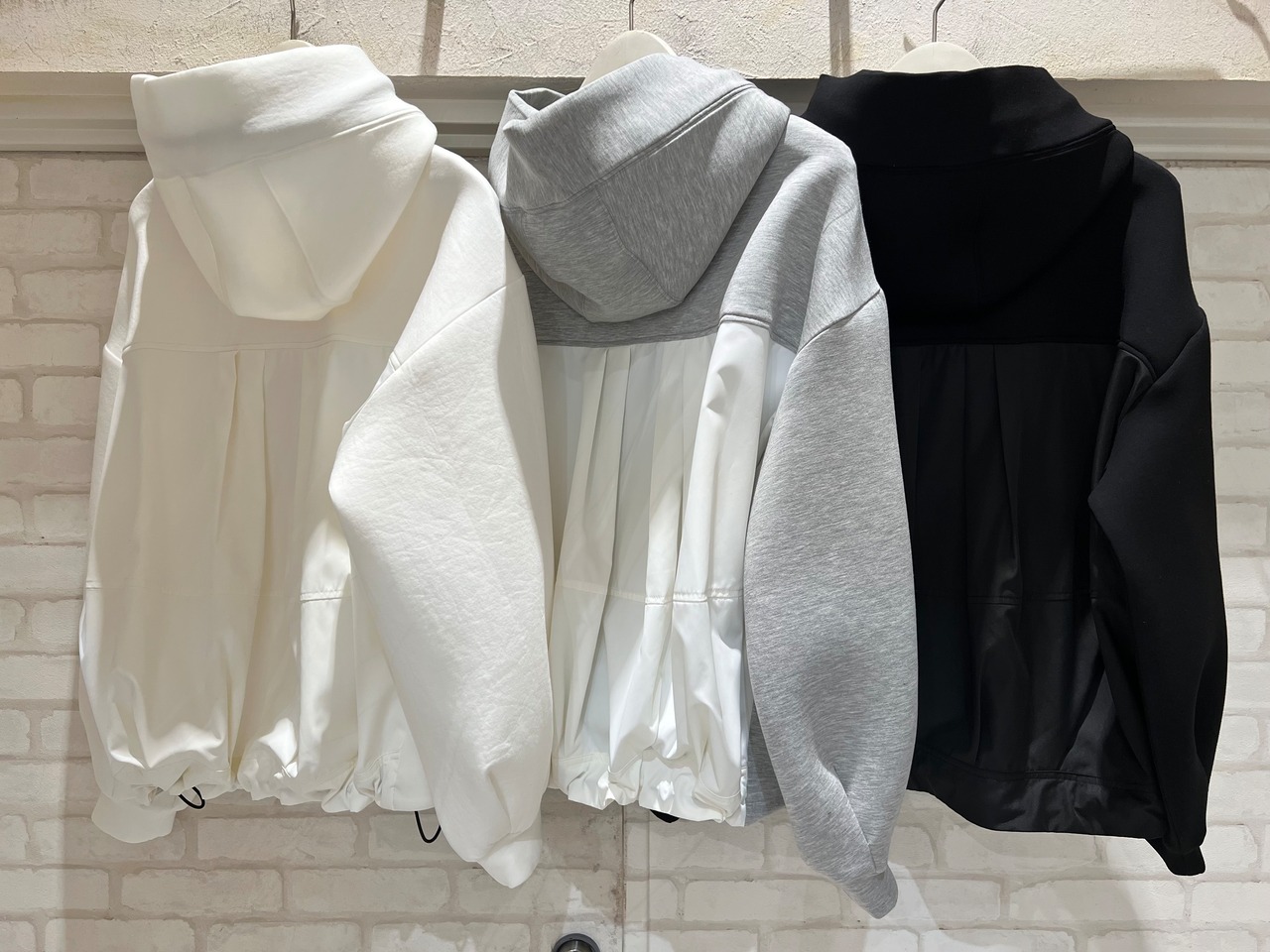 カジュアルなボンディングパーカーに女性らしいタックの入った生地を施した大人カジュアルなデザイン。
