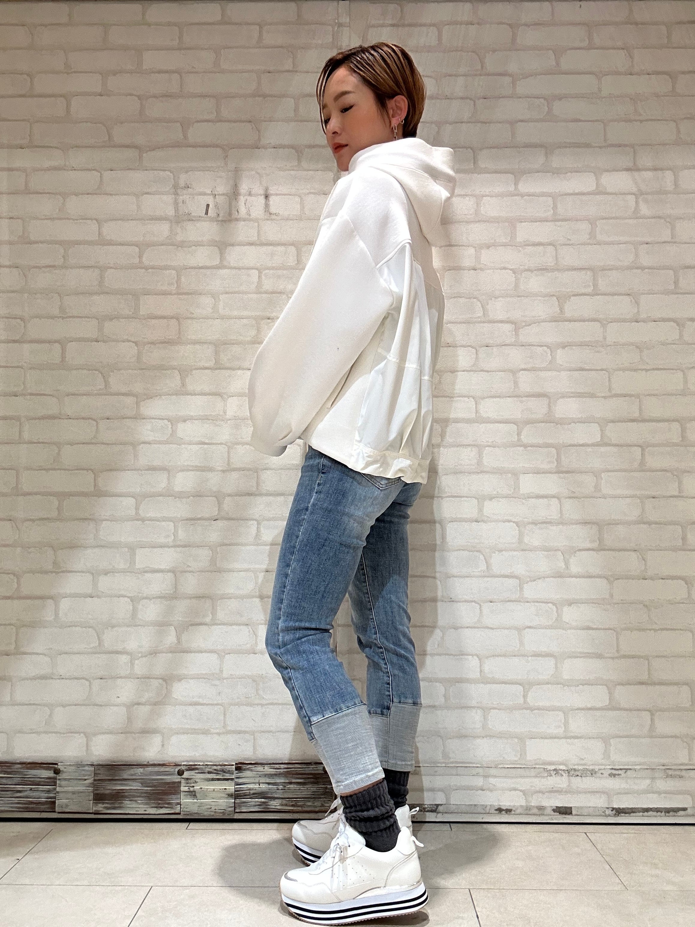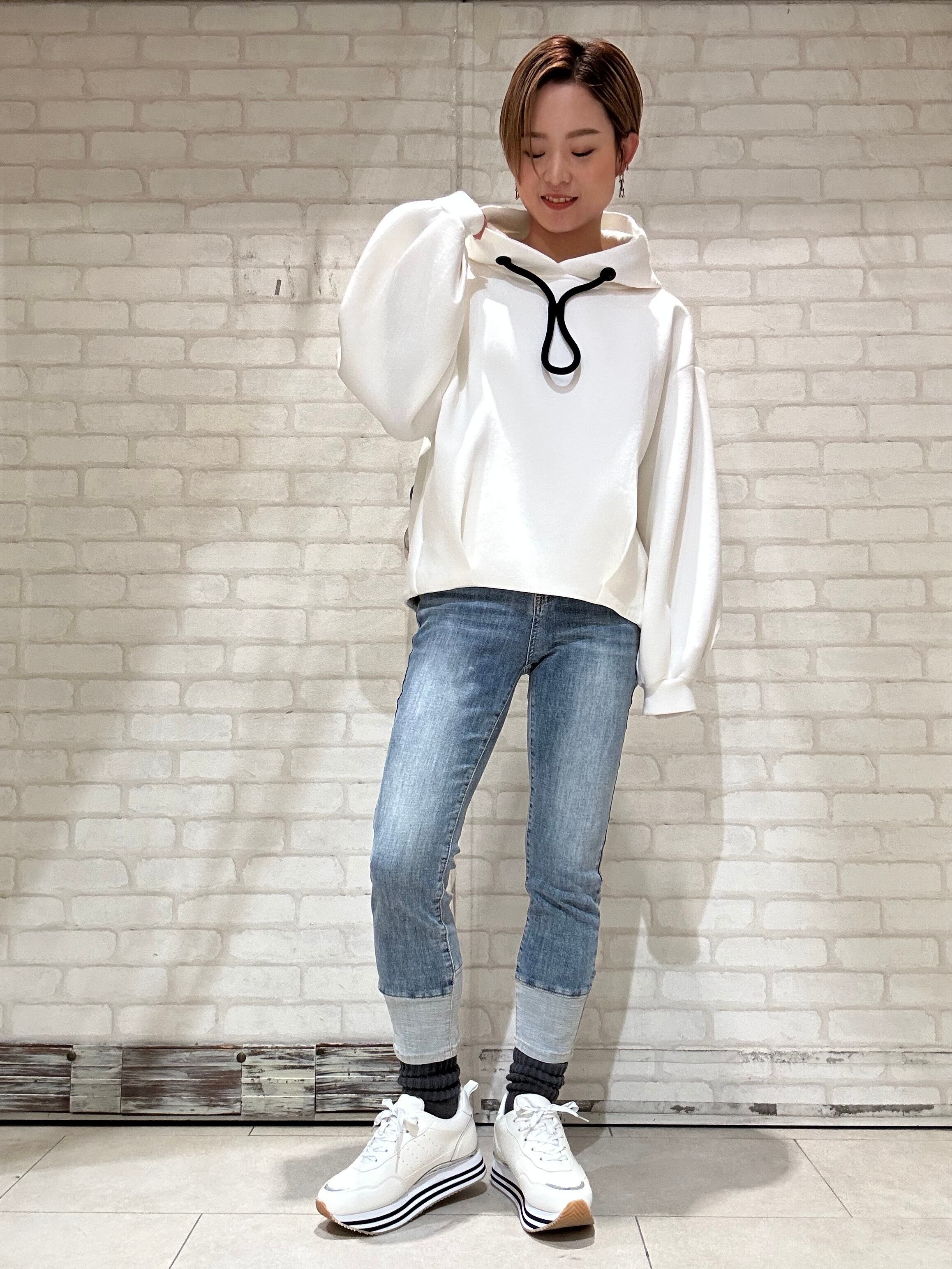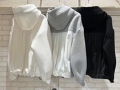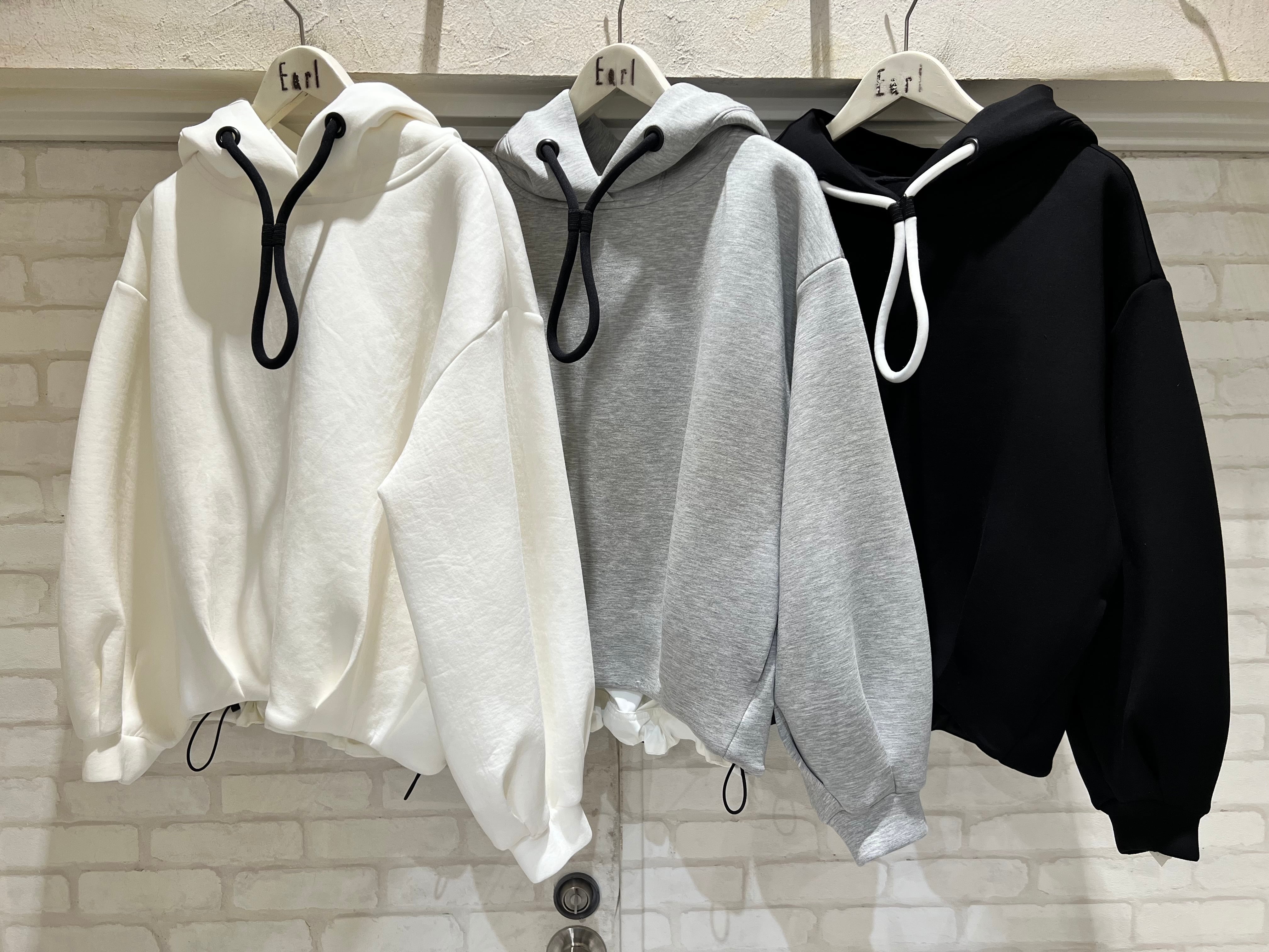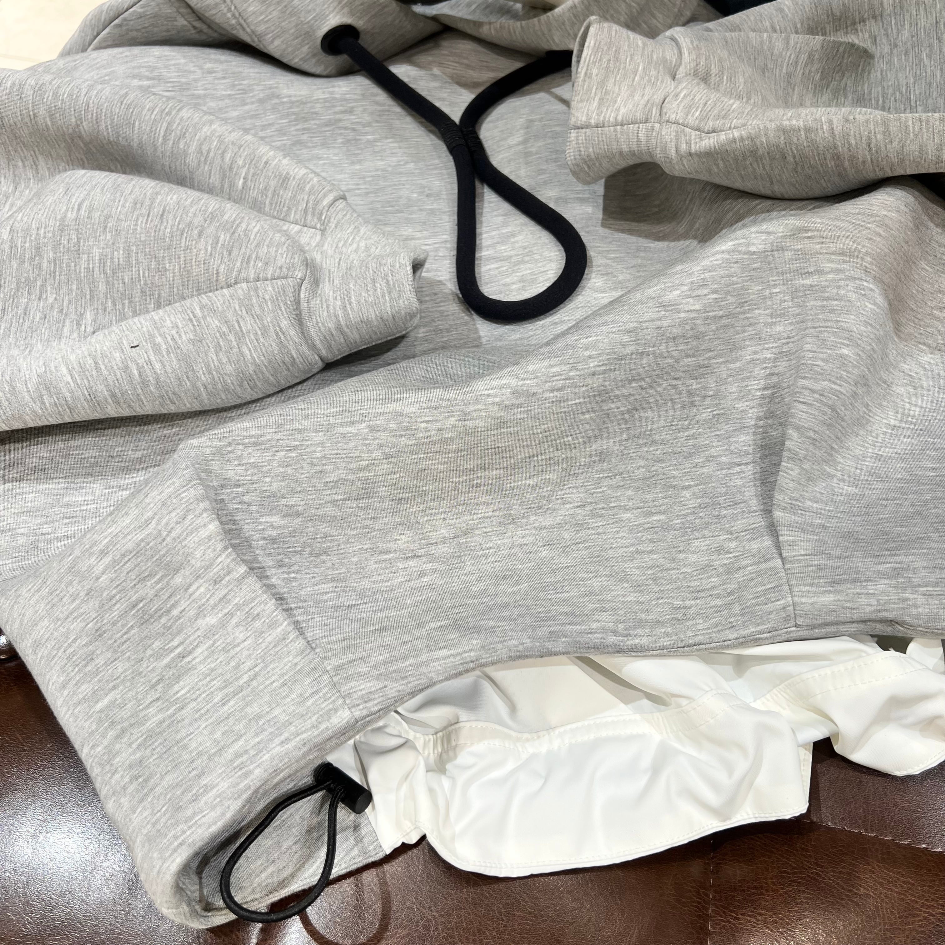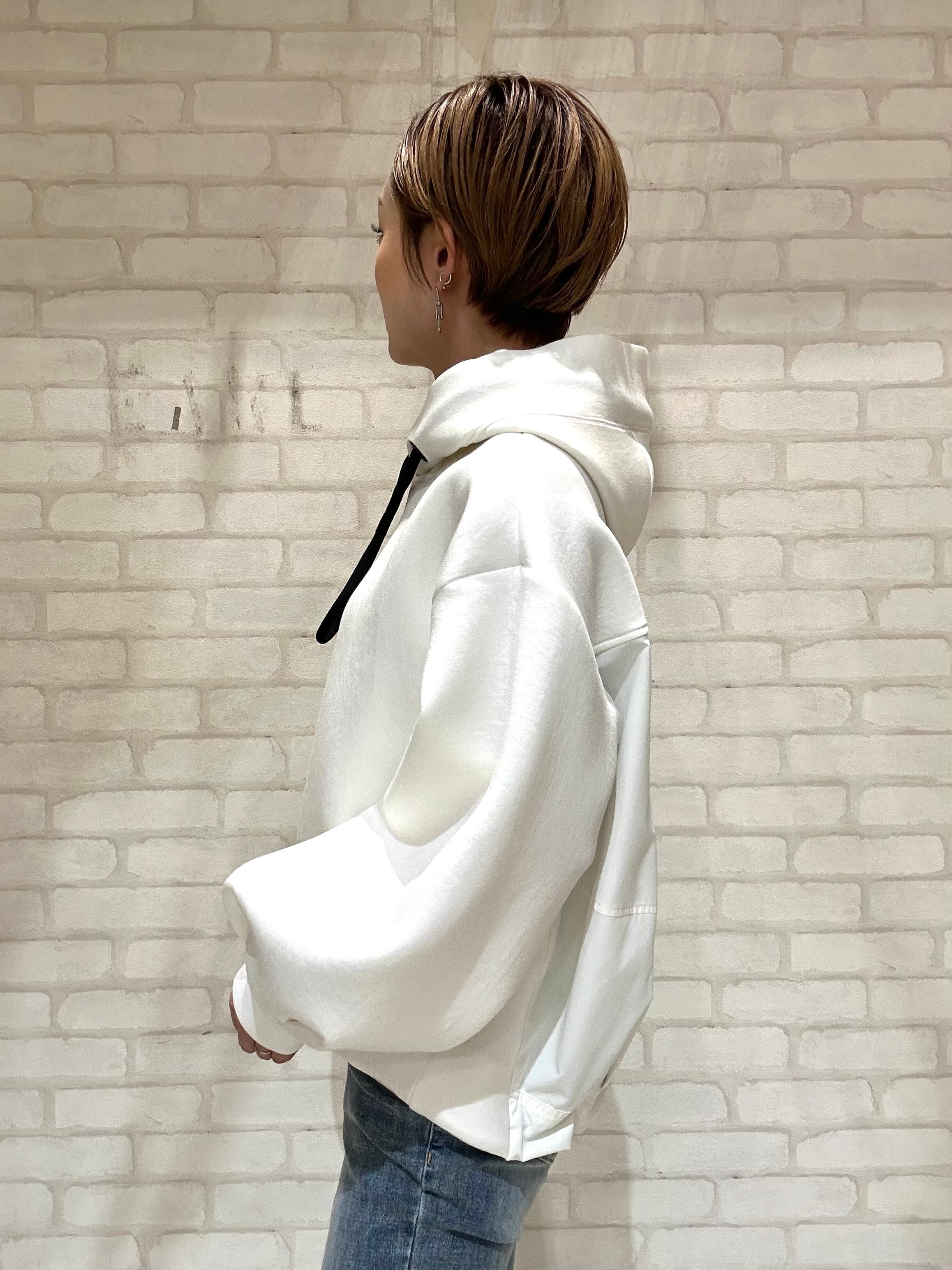 カジュアルなボンディングパーカーに女性らしいタックの入った生地を施した大人カジュアルなデザイン。